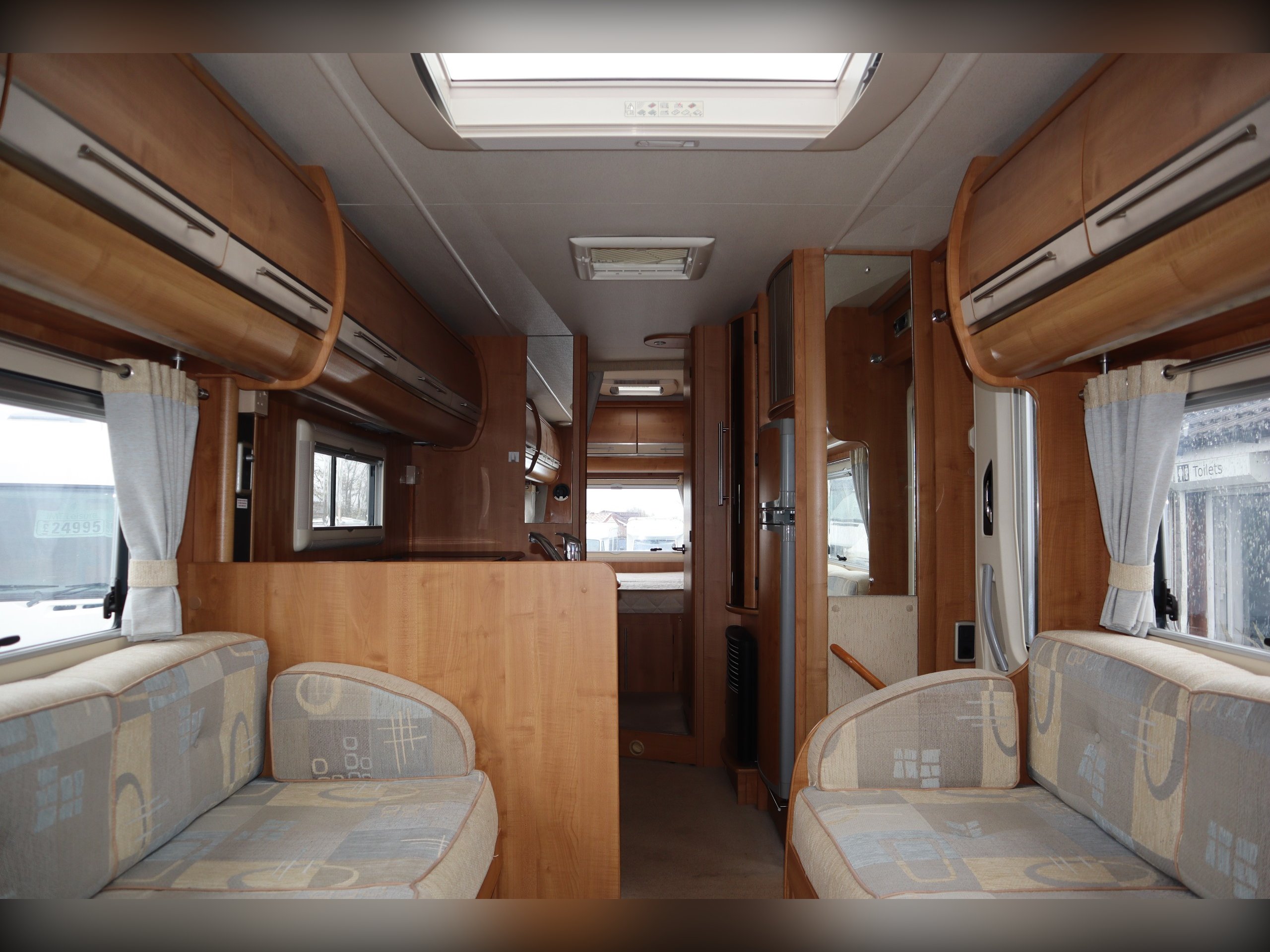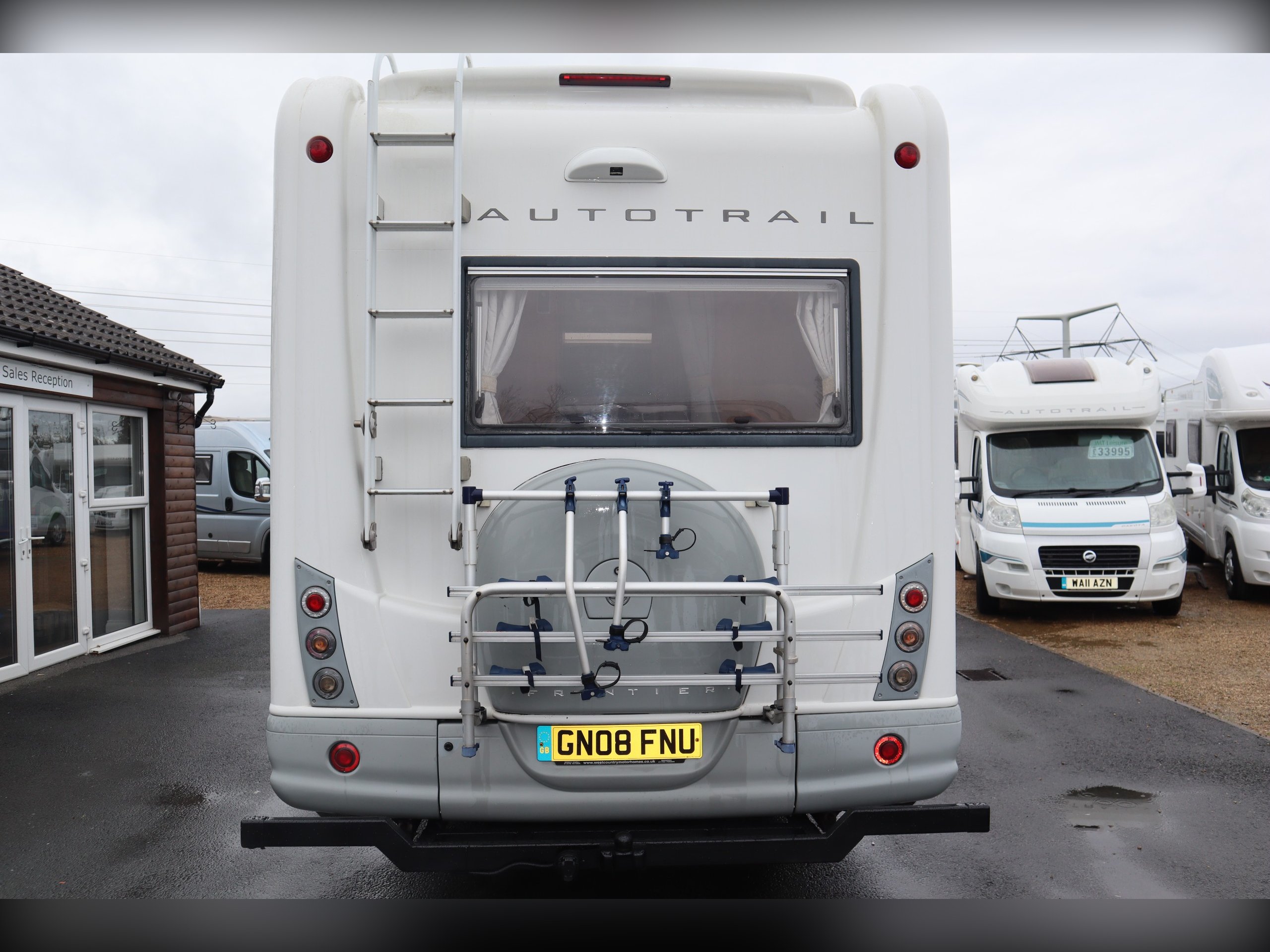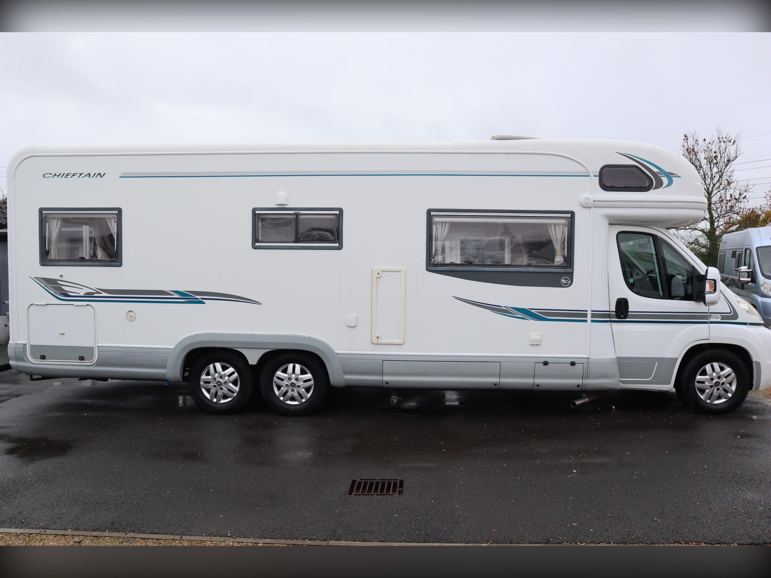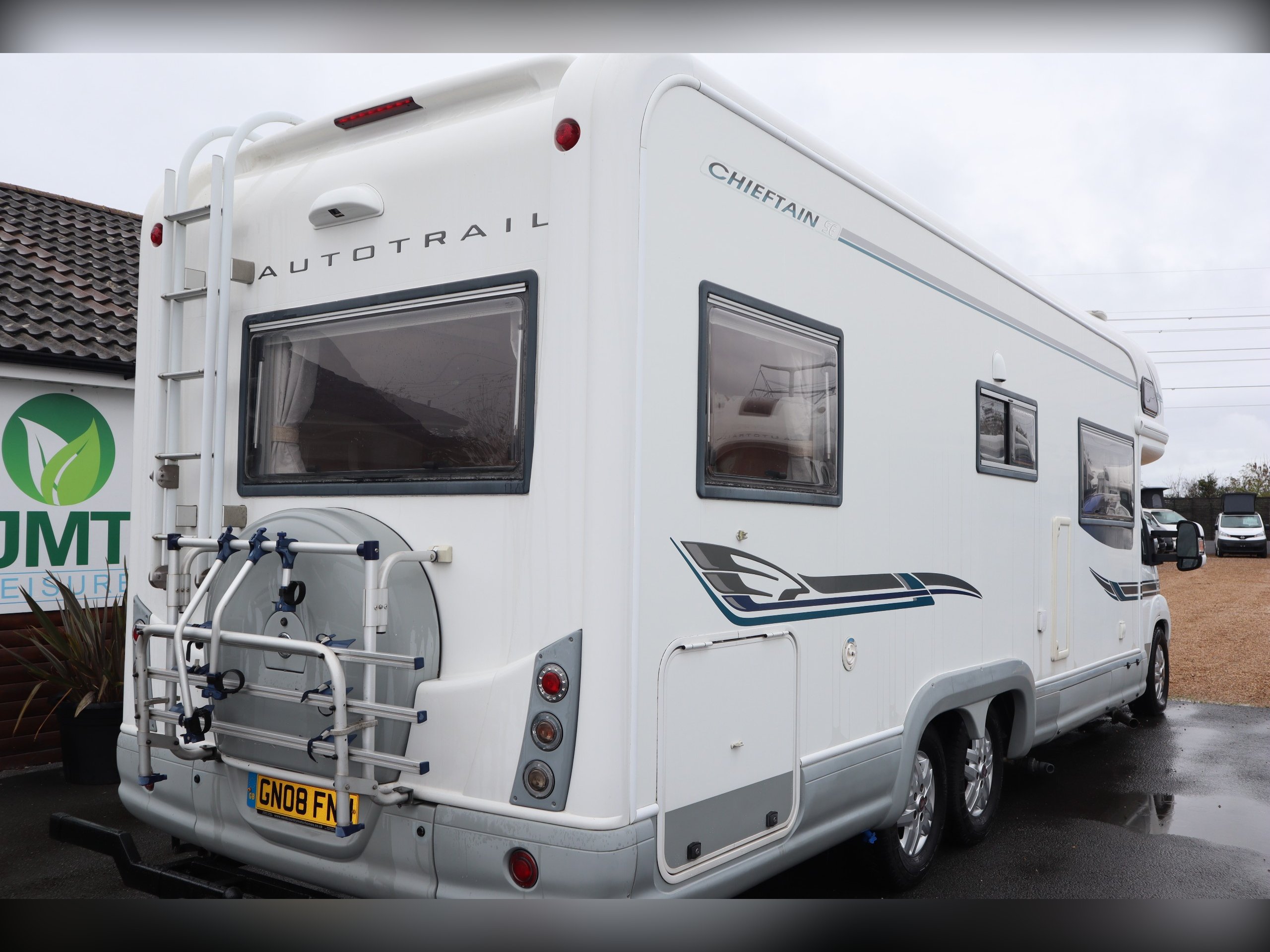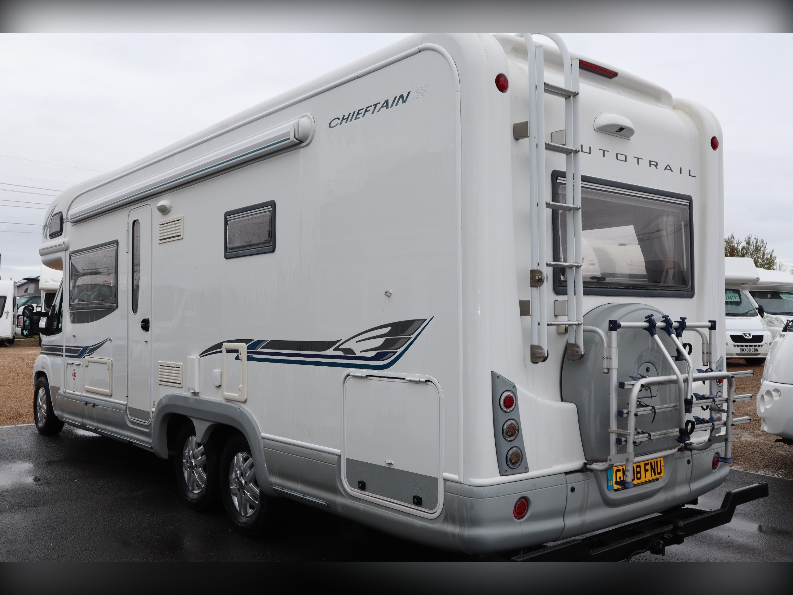 AutoTrail Cheiftan SE, 6 Berth, 2 Belts, Rear Transverse Bed, Front lounge that converts to a double, Overcab Bed. Central Well Equipped Kitchen. Mid Bathroom with separate shower. Extras include Alloy Wheels, Cab Air Con, Cruise Control, Bike Rack, Tow Bar & Awning.