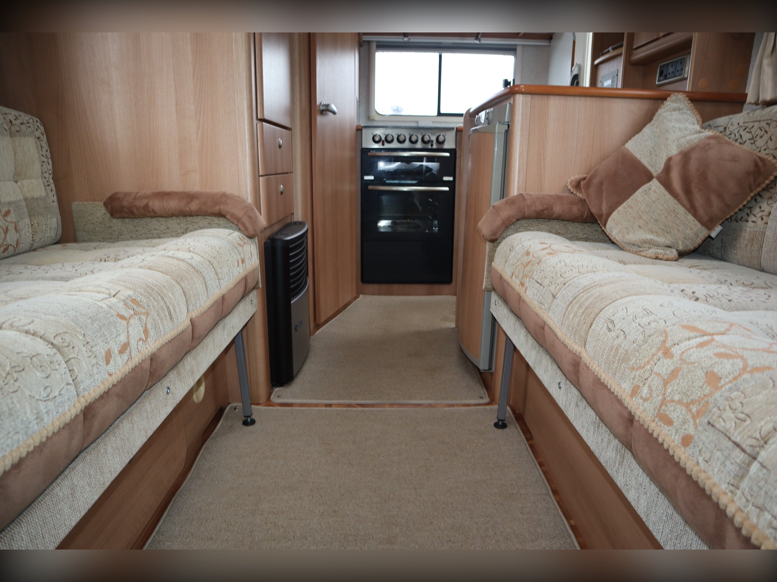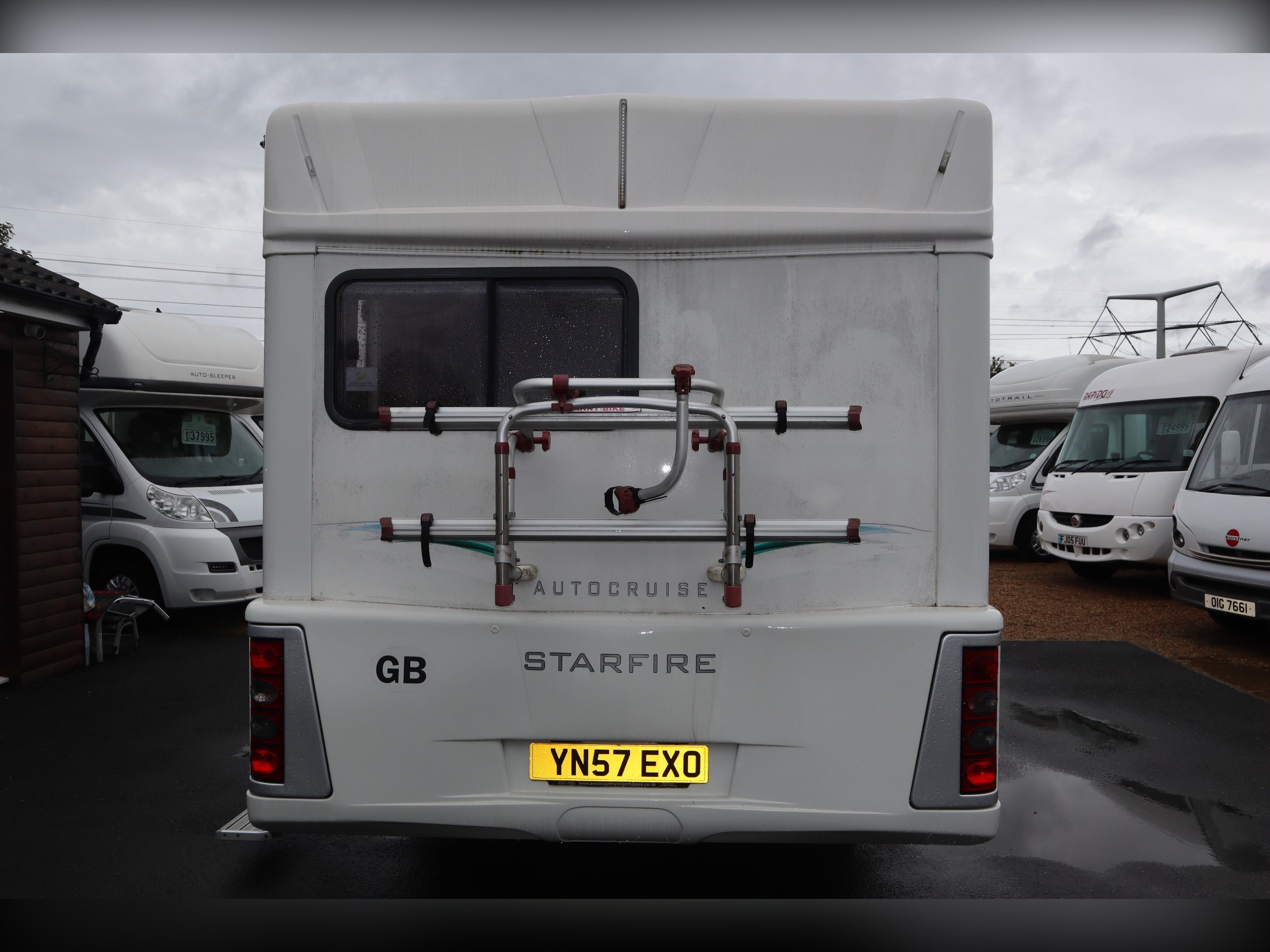 AutoCruise Starfire, 2 Berth, 2 Belts. Front lounge with opposite benches that convert to a double bed. Rear Kitchen with Oven, hob, Grill, Fridge Freezer and sink. Side Bathroom with shower, cassette toilet, wash basin and vanity unit. Peugeot boxer cab with electric mirrors and windows, cruise control. Extras include a bike rack. Lovely short compact 2 berth Motorhome.