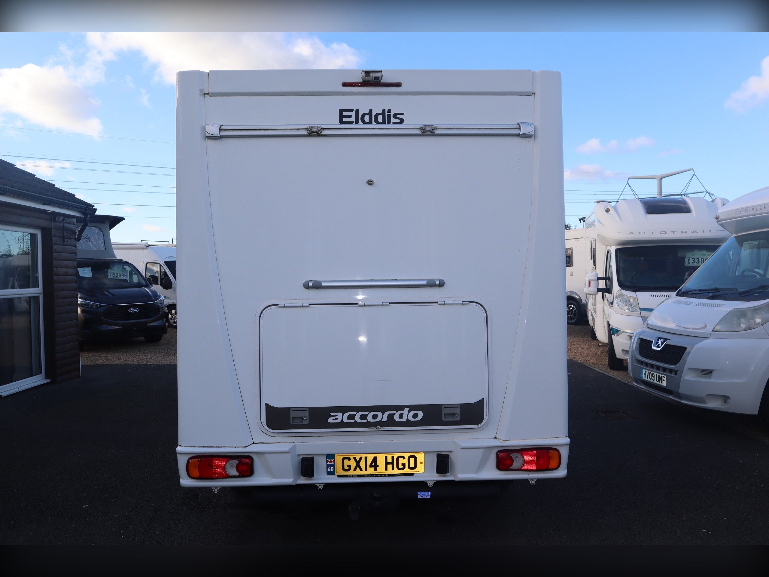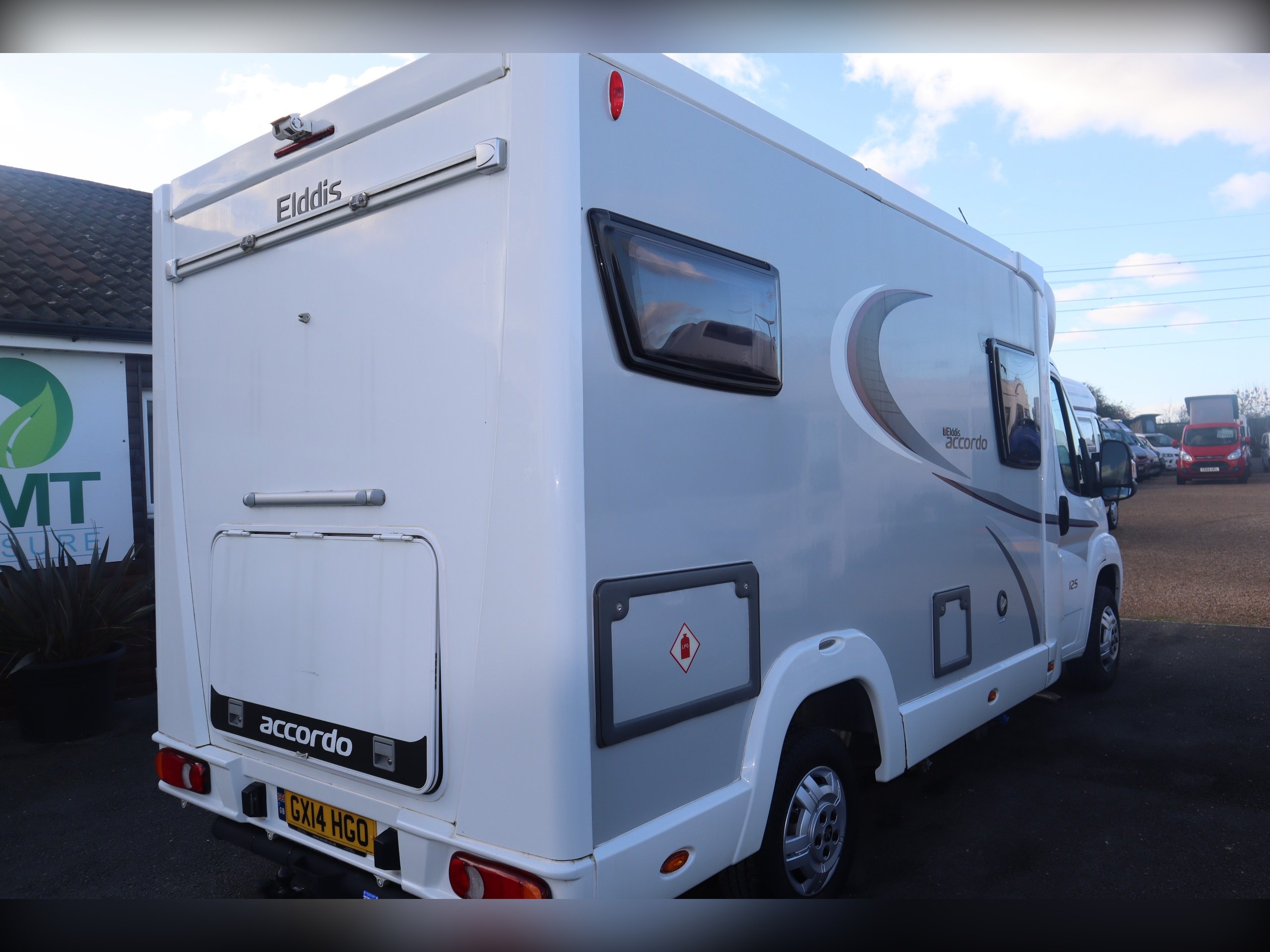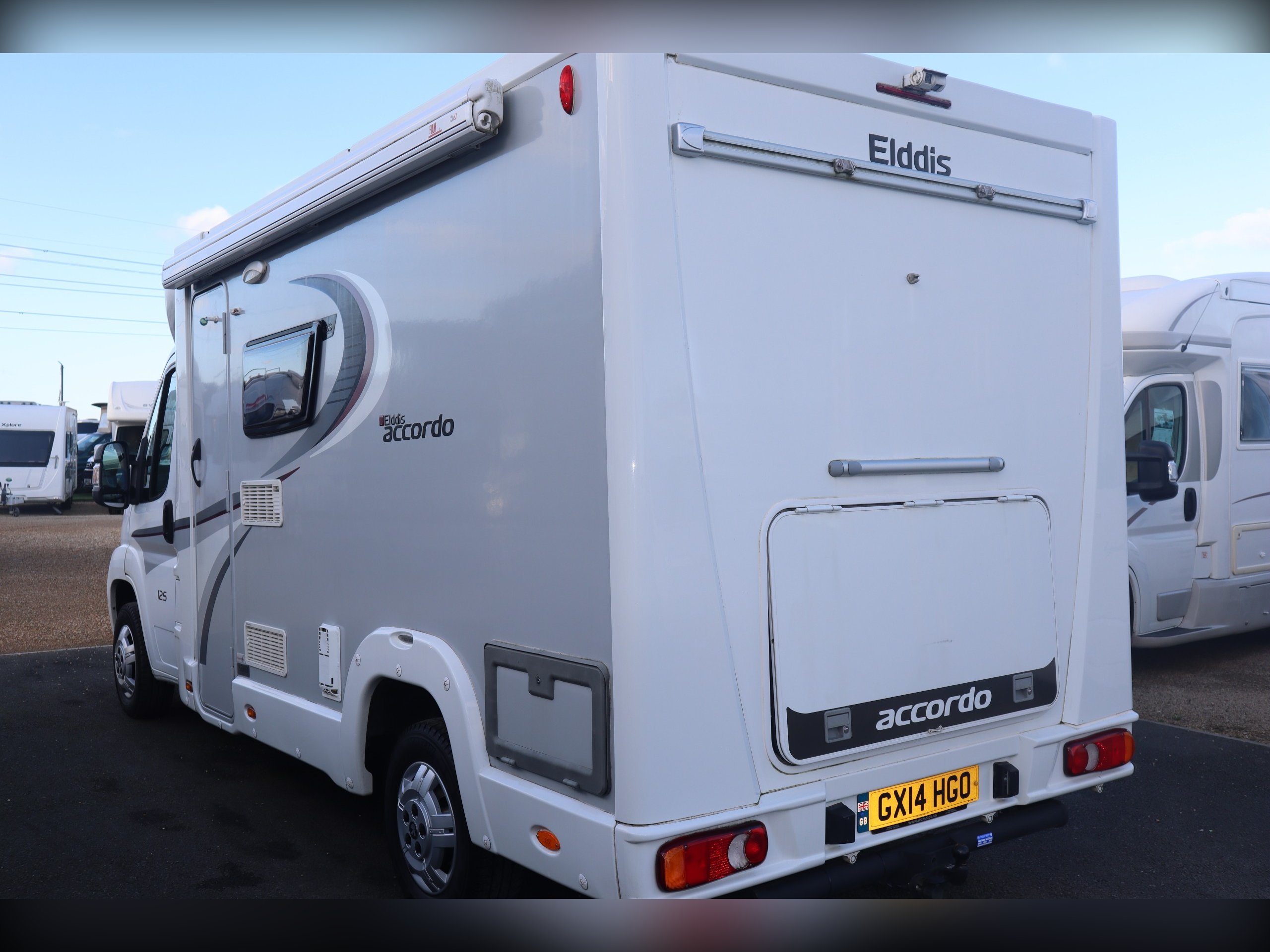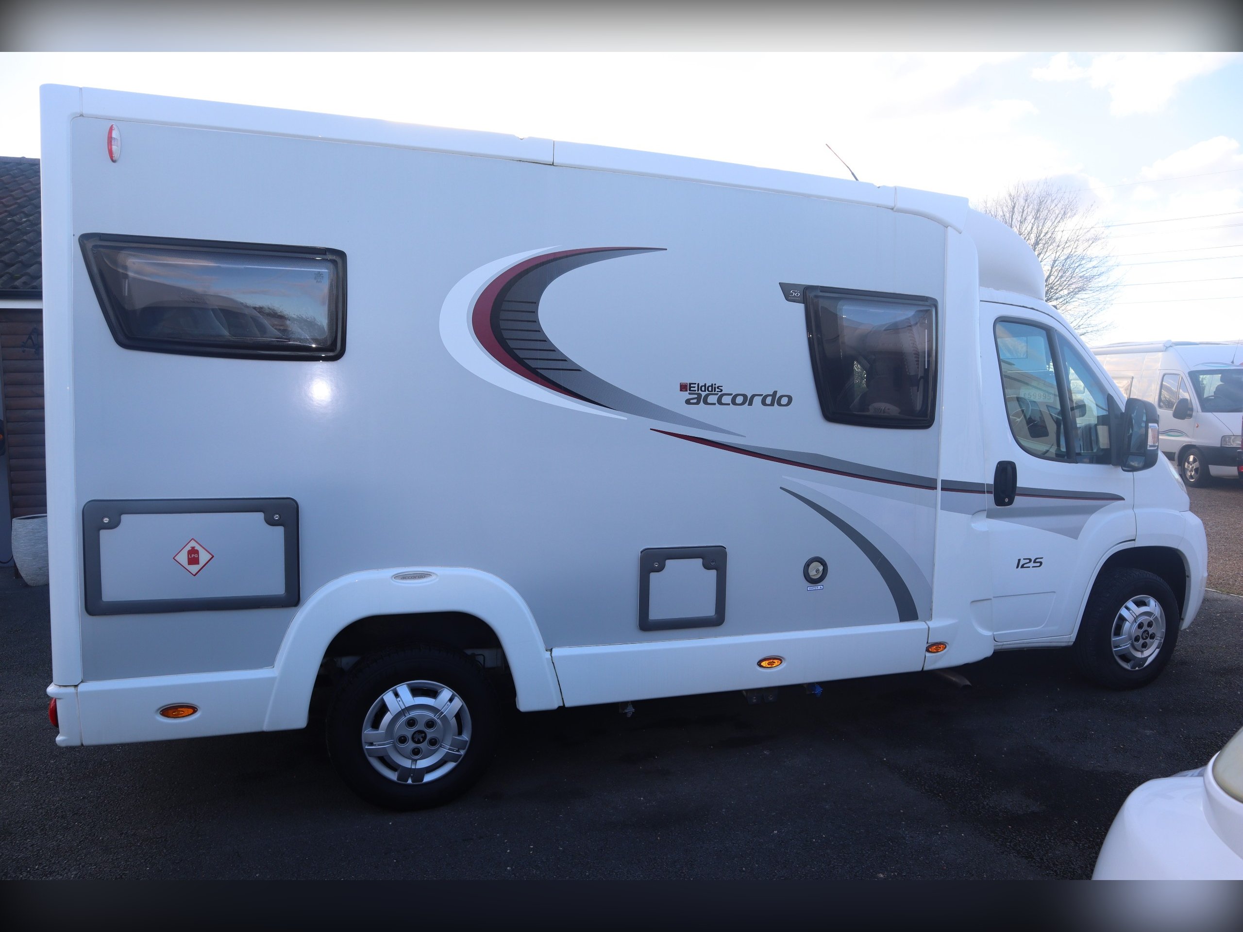 Elddis Accordo 125 Aniversary Edition, 2 Berth, 4 Belts, Rear fold up double bed with storage. Front half dinette with 2 additional belts. Side well equipped kitchen. Side bathroom with Toilet, Shower and wash basin. Extras include a reversing camera and awning. Well designed spacious motorhome with low mileage.