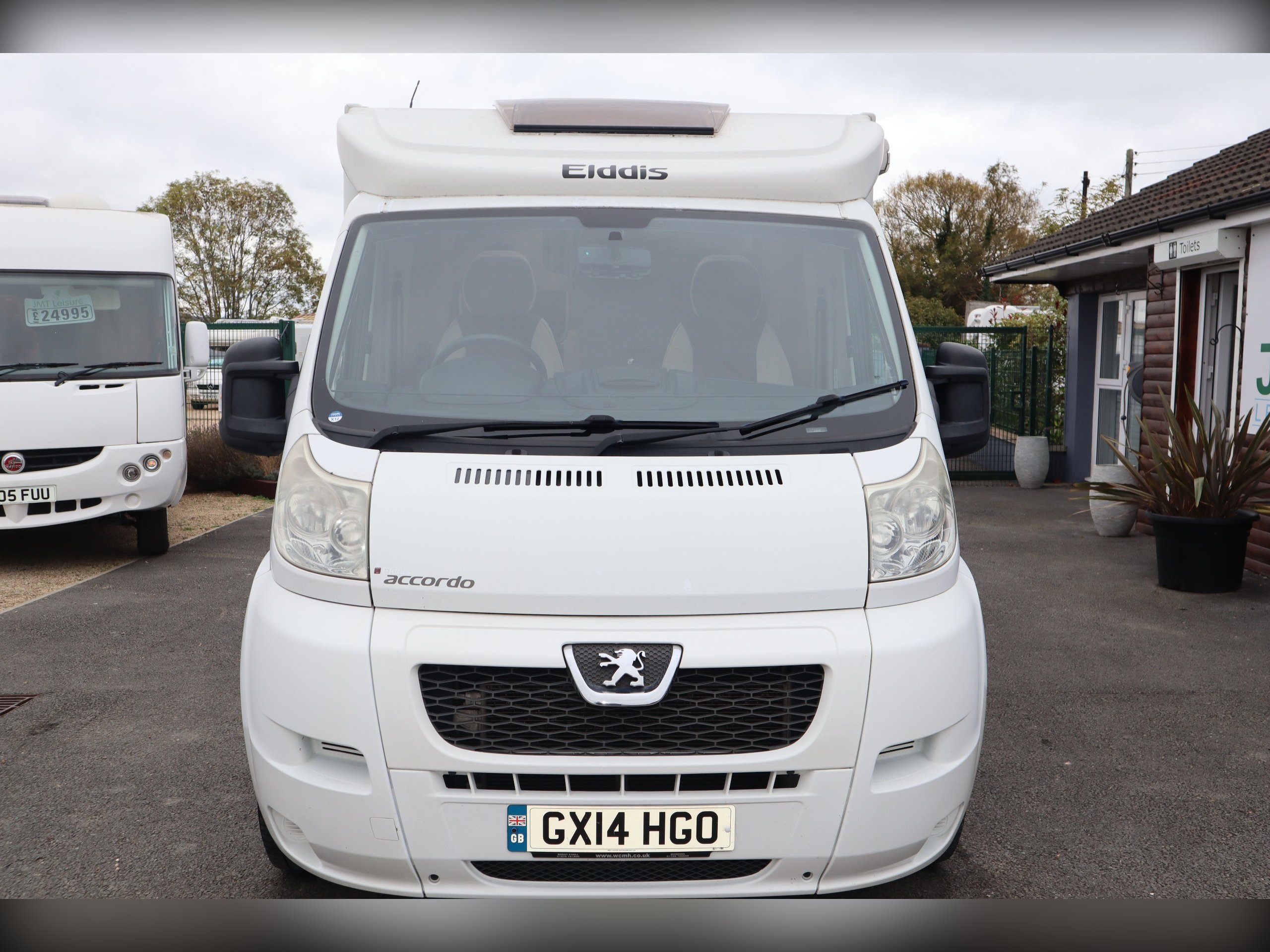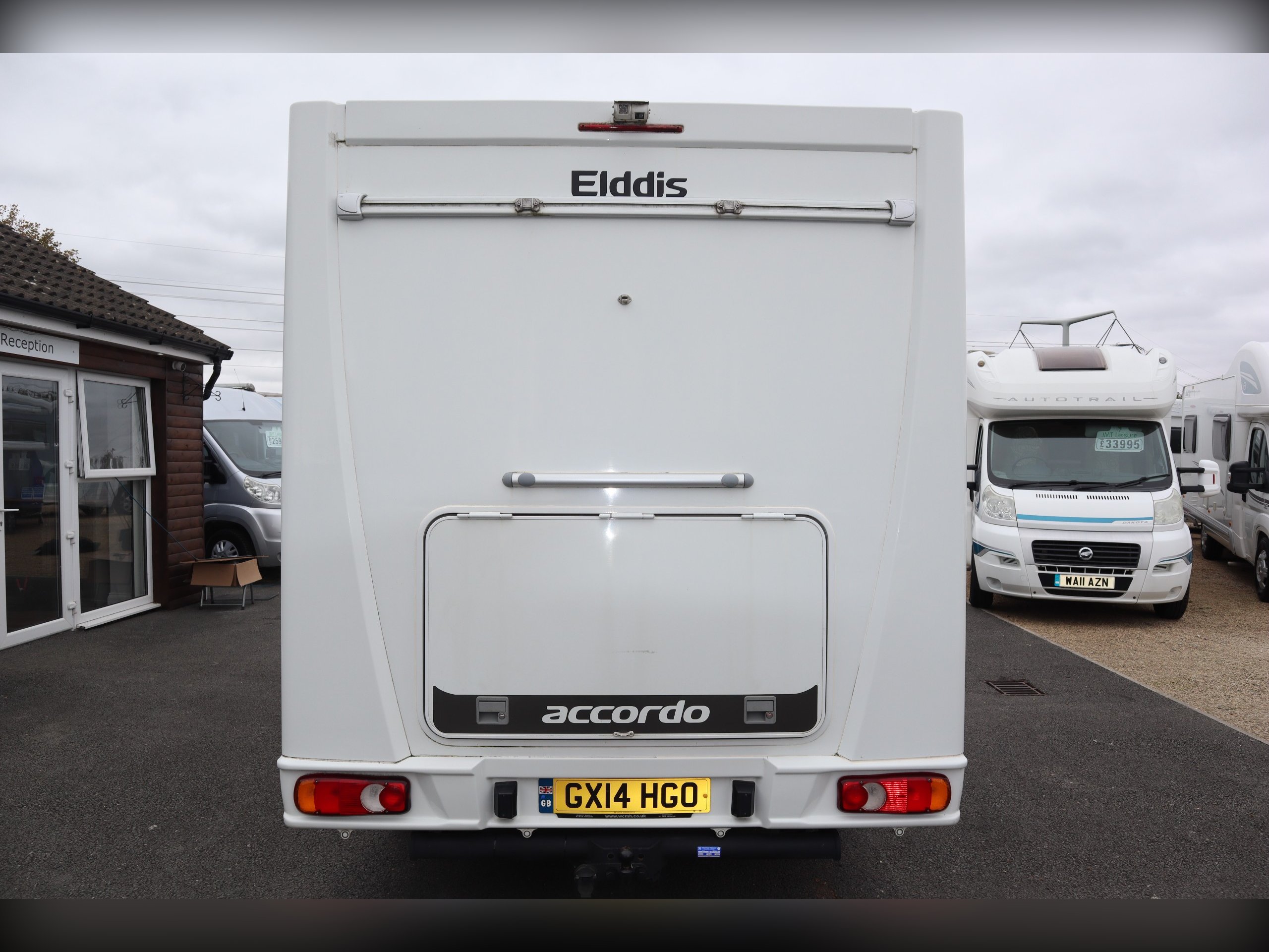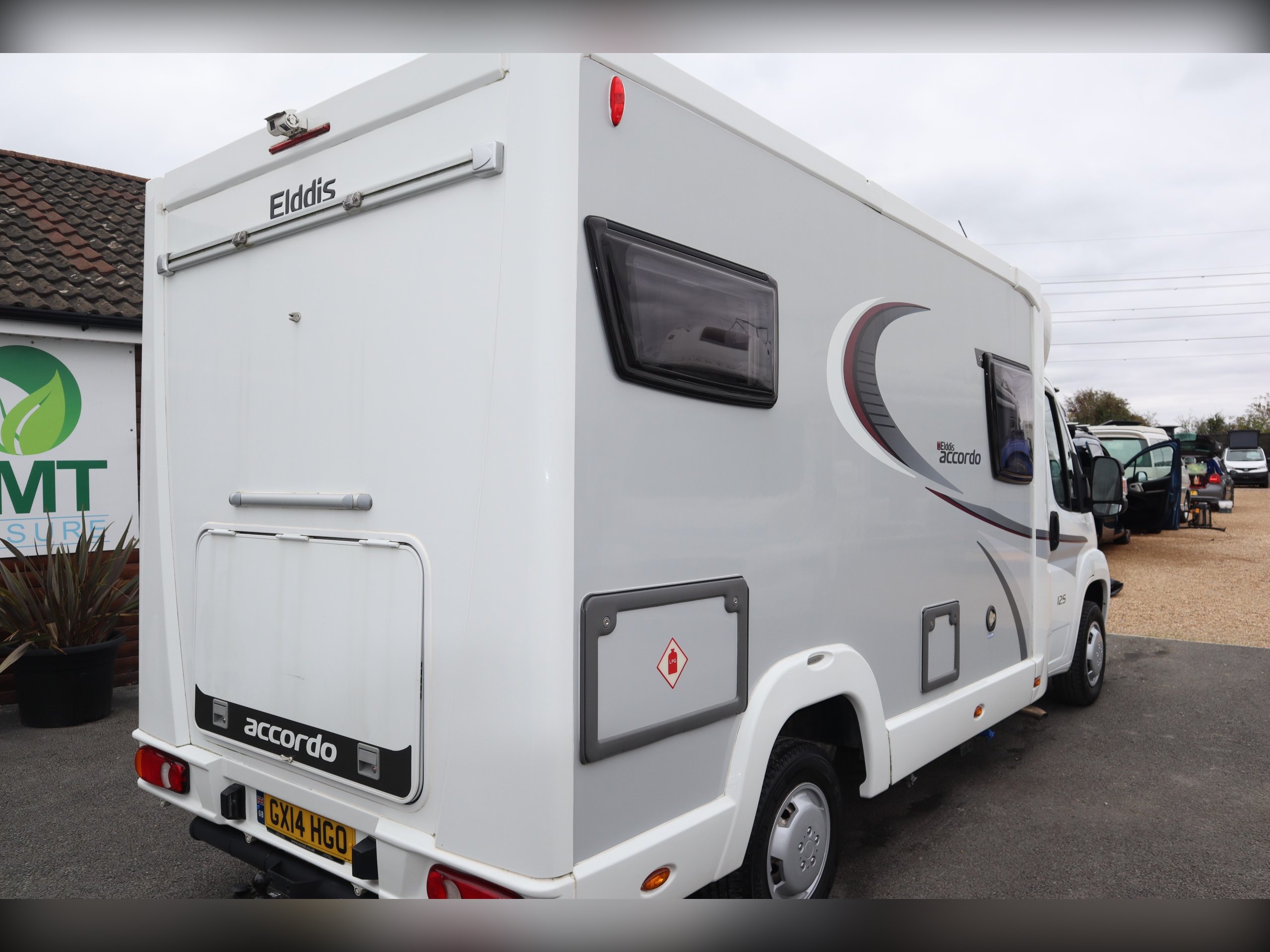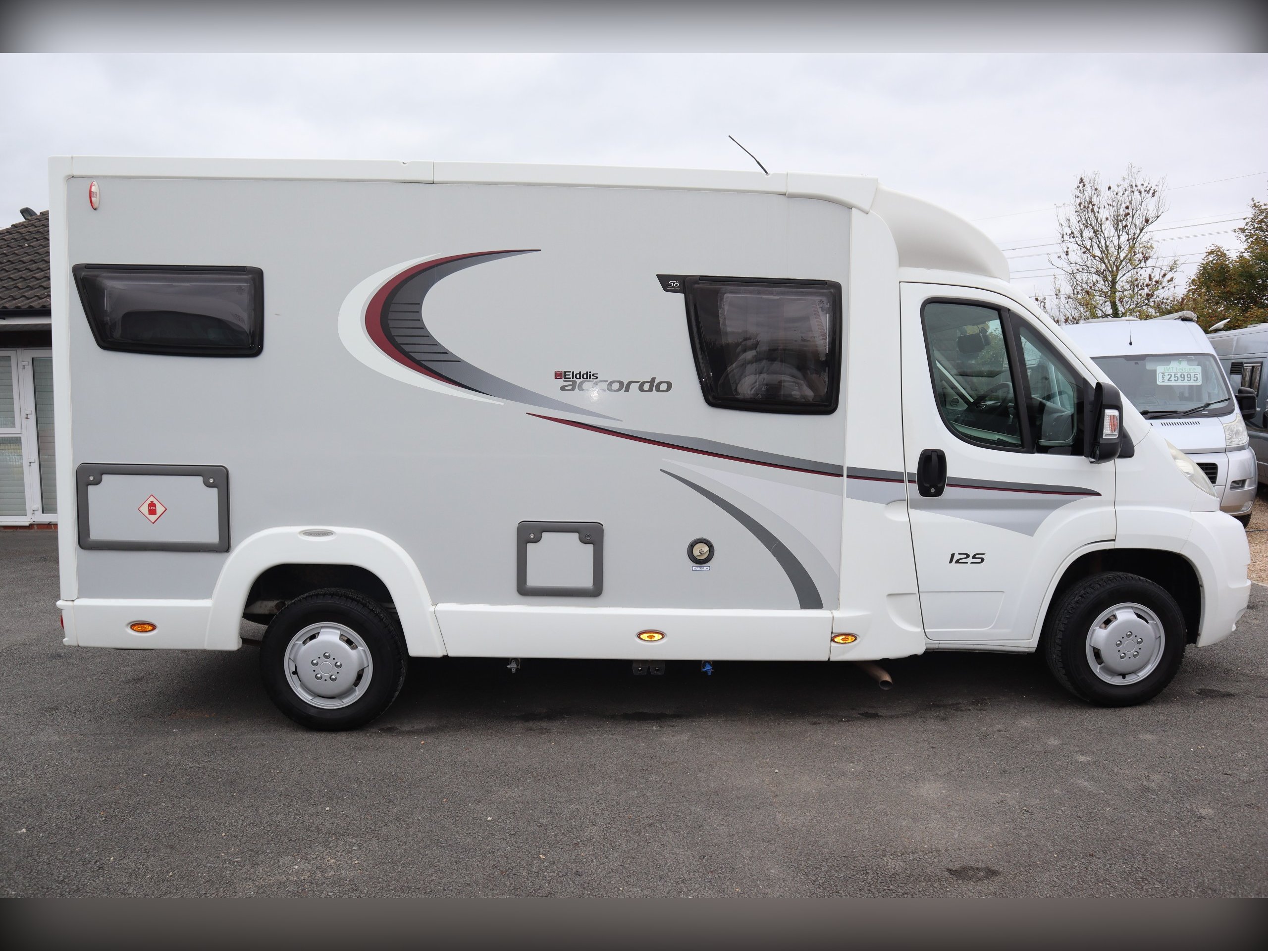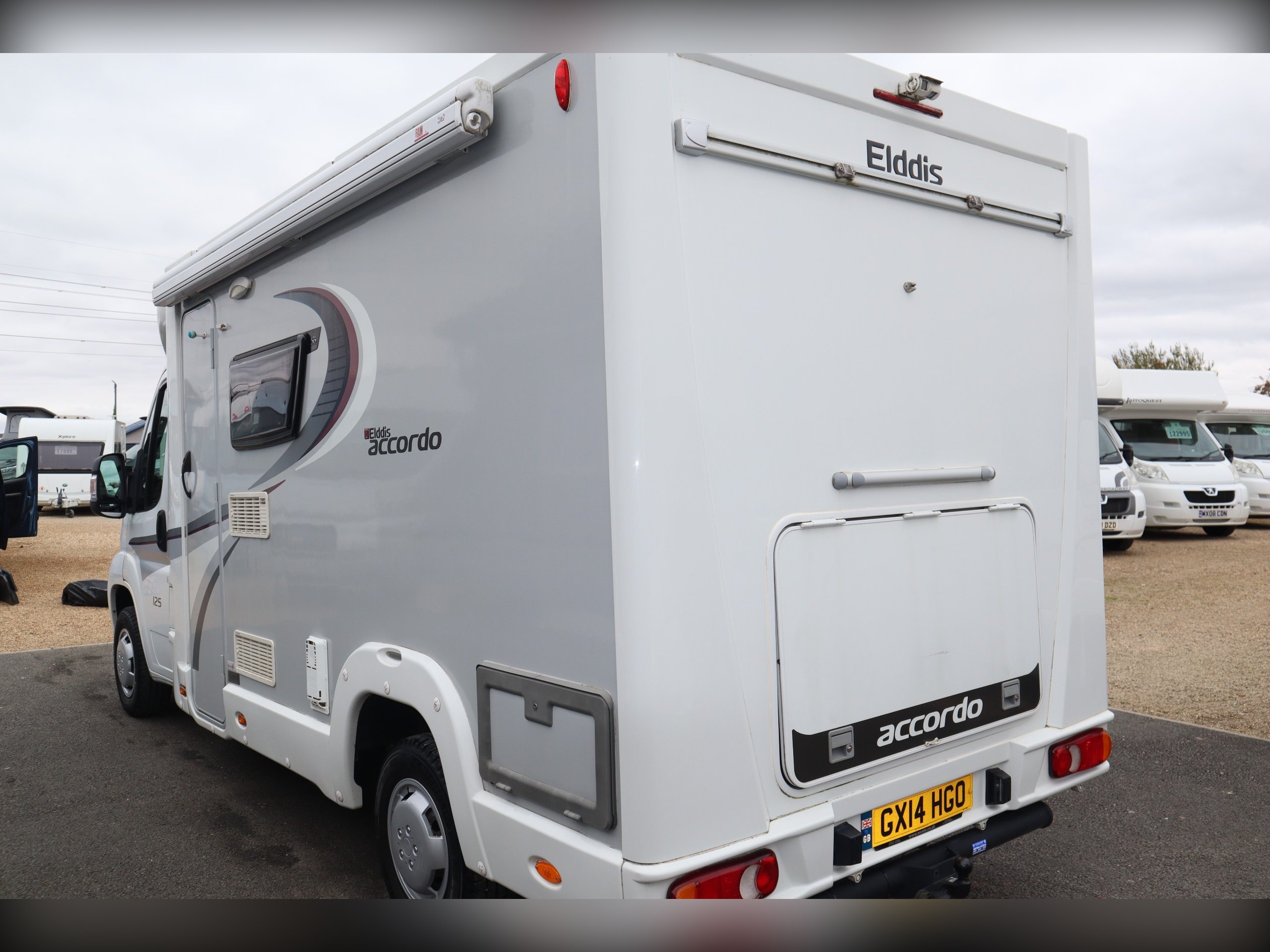 Elddis Accordo 125 Aniversary Edition, 2 Berth, 4 Belts, Rear fold up double bed with storage. Front half dinette with 2 additional belts. Side well equipped kitchen. Side bathroom with Toilet, Shower and wash basin. Extras include a reversing camera and awning. Well designed spacious motorhome with low mileage.
