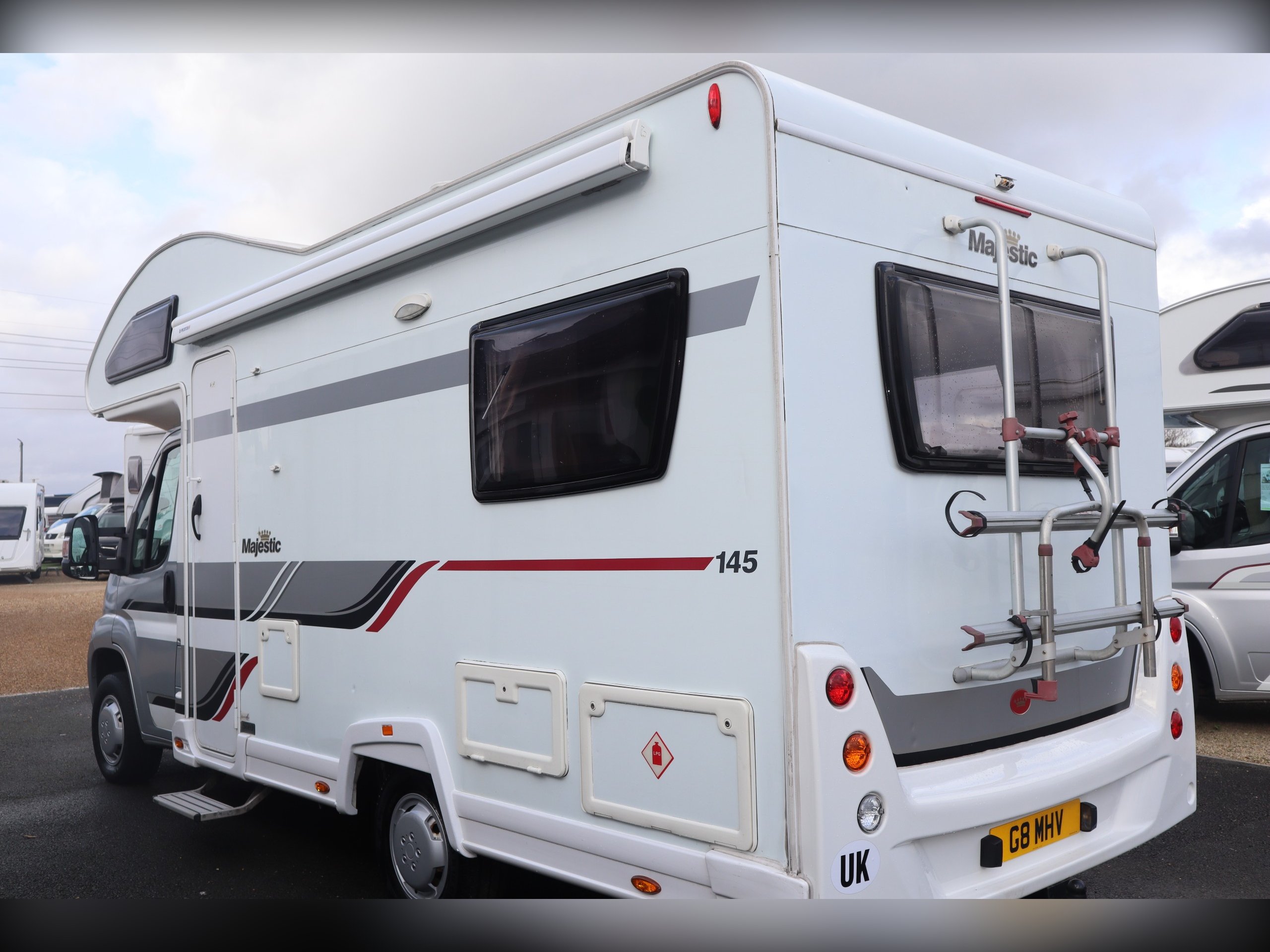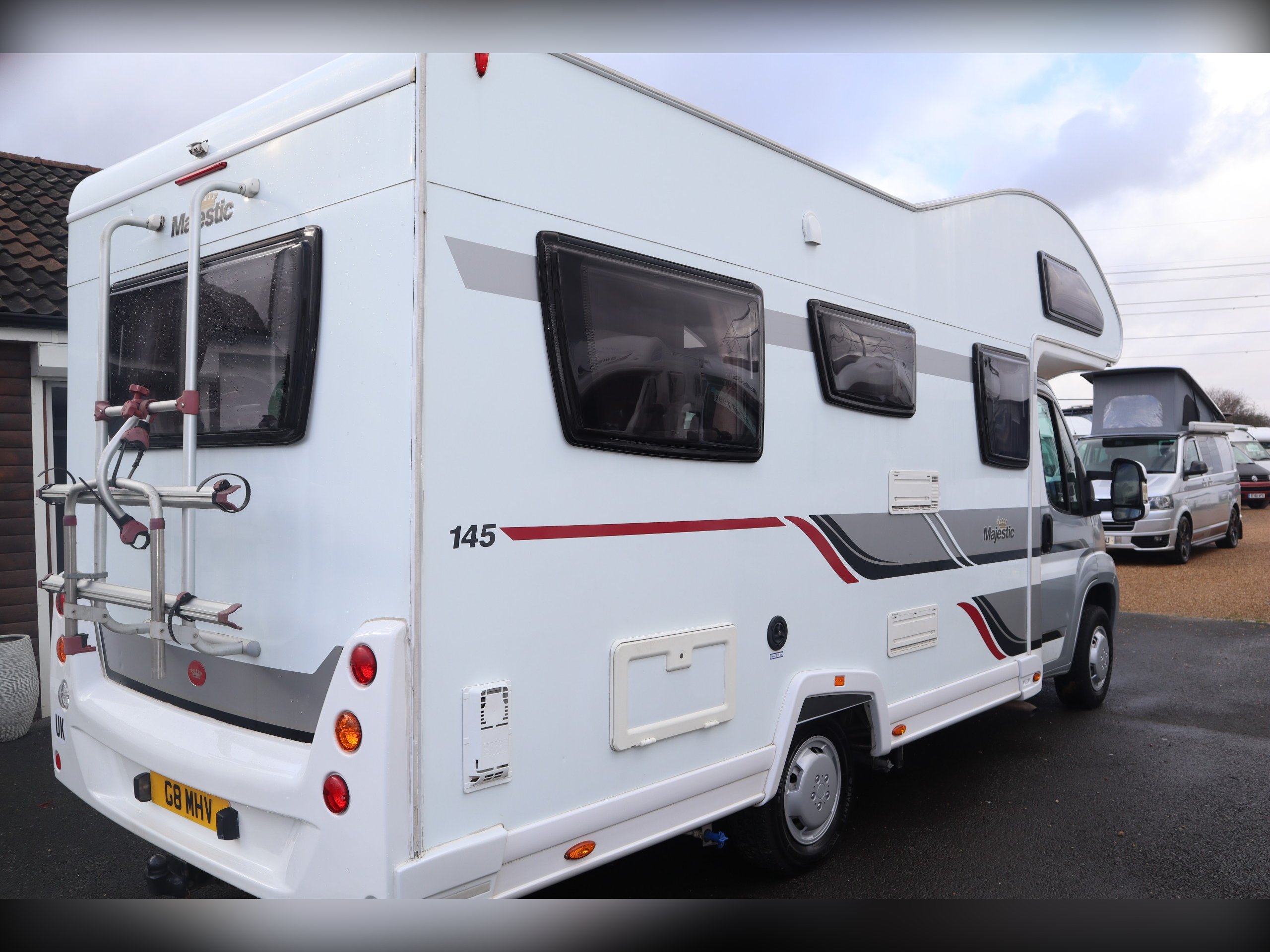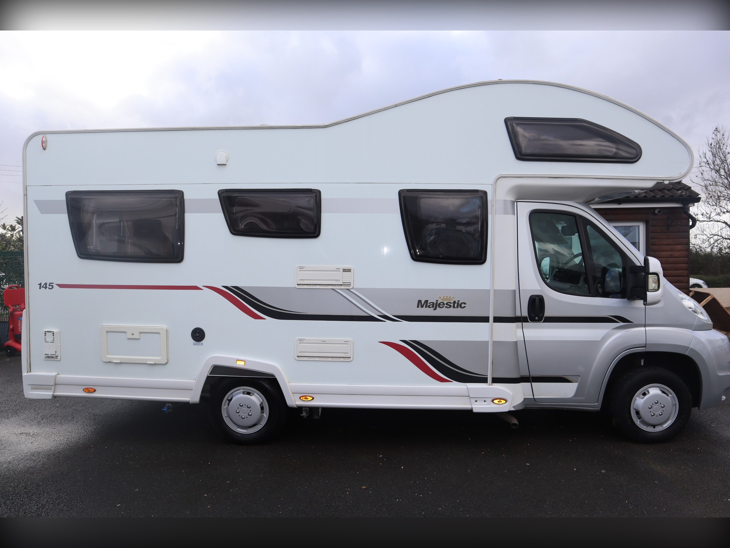 2014 Elddis Majestic 145, 4 Berth, 4 Belts, Rear Lounge, Side Kitchen with oven, hob & grill, Microwave and fridge freezer. Large rear Lounge that converts to a large bed. 2 rear forward facing belted seats. Side spacious bathroom. Over cab bed. Well equipped cab with air con, cruse control, 6 speed gearbox, reversing camera, electric windows and mirrors. Outside you will find a tow bar, awning and bike rack.