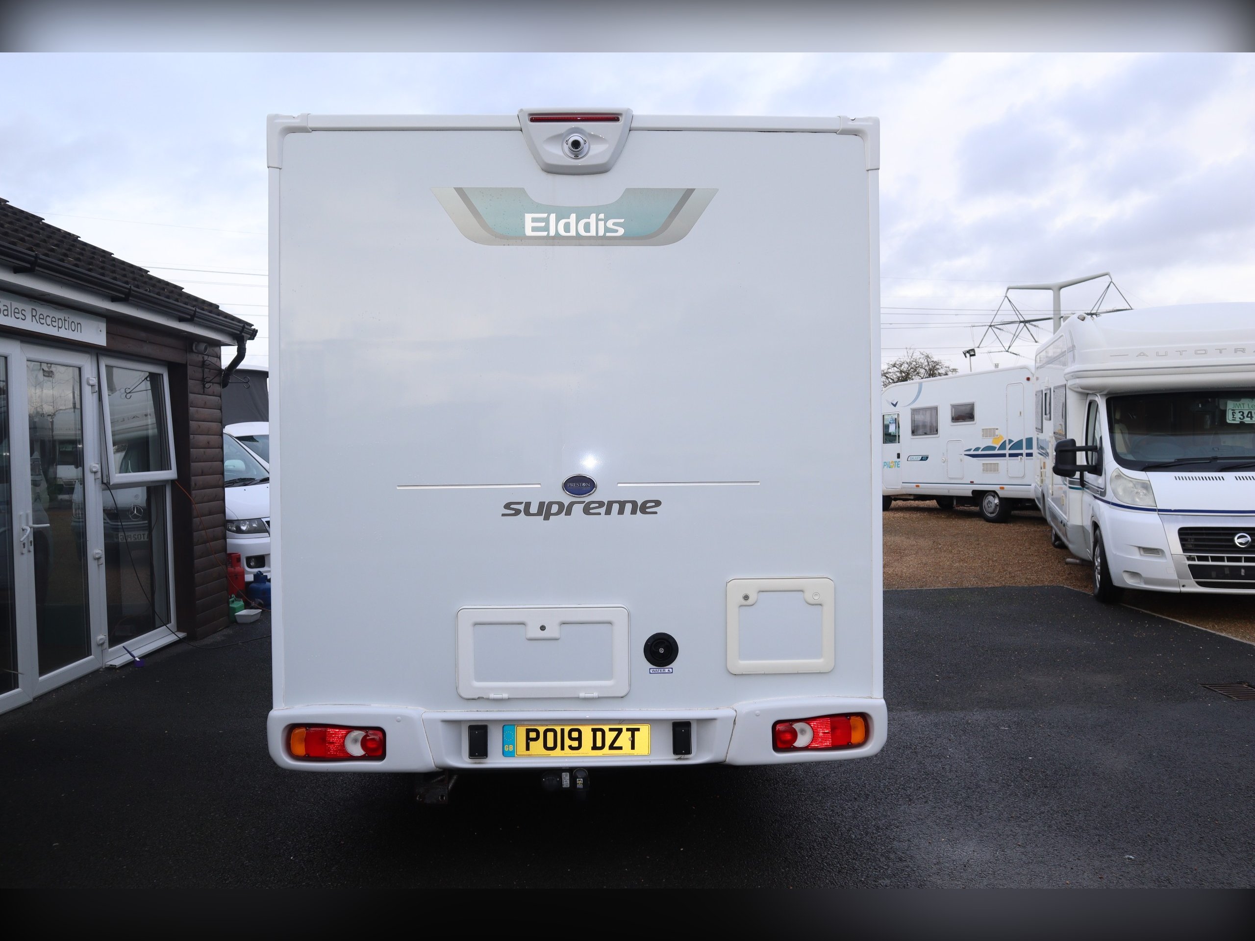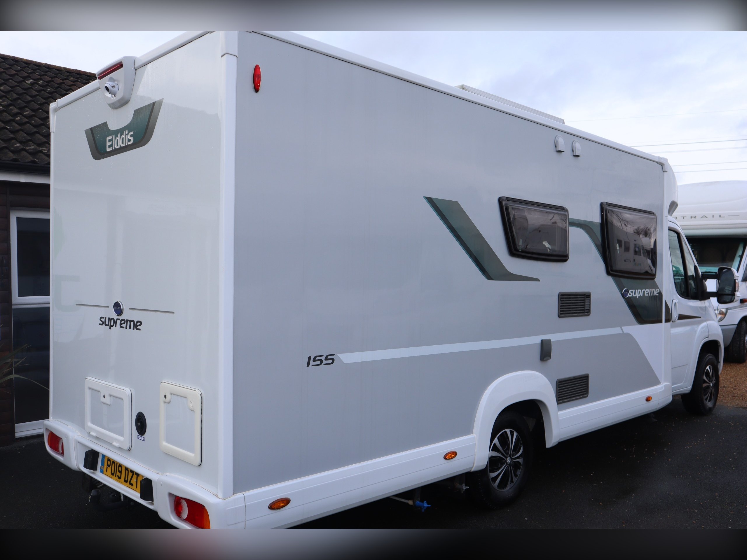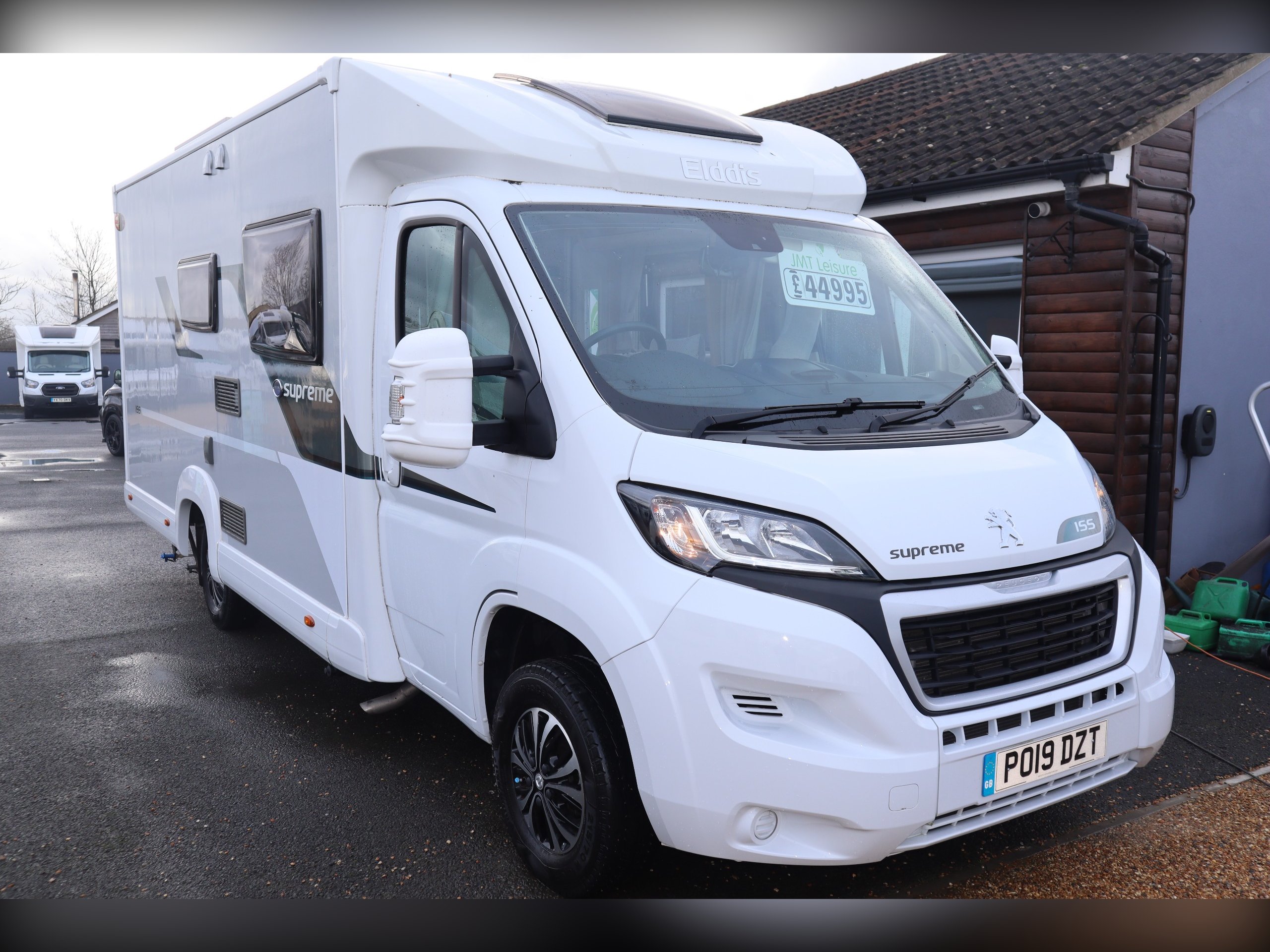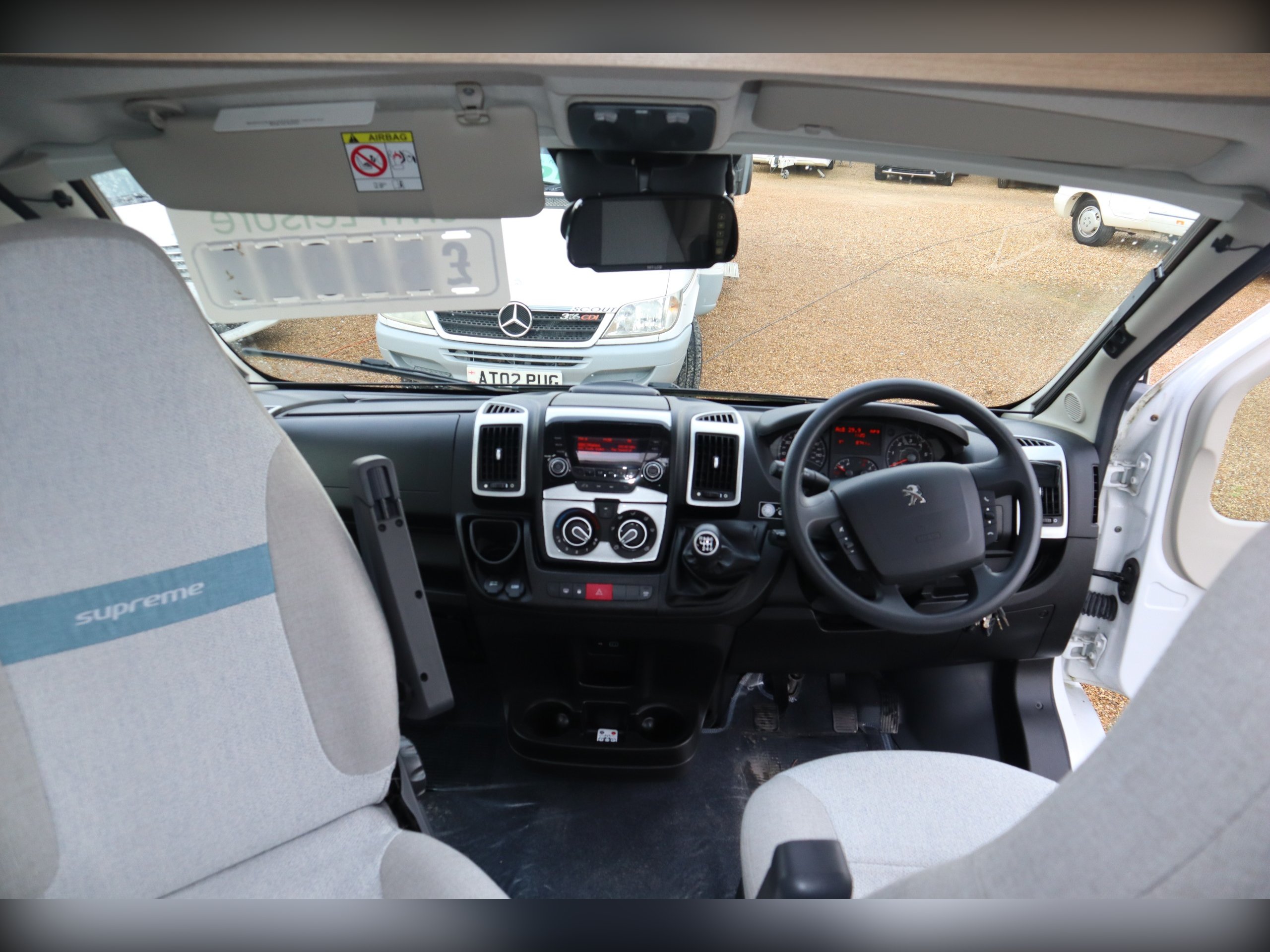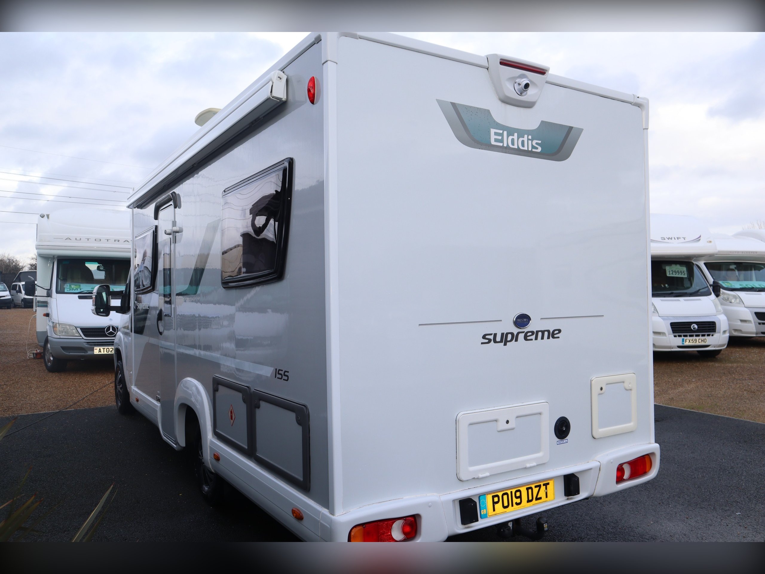 Elddis Supreme 155, 4 Berth, 4 Belts, Fixed Rear Bed, Front Benches that convert to a double bed, Side well equipped kitchen with Oven, Hob, Grill, Fridge Freezer & Microwave. Large rear side bathroom. Peugeot Boxer Cab with Air Con, Cruise Control, 6 Speed Gearbox, Reversing Camera and Electric Windows & Mirrors. Extras include Alloy Wheels, Tow Bar and Awning.