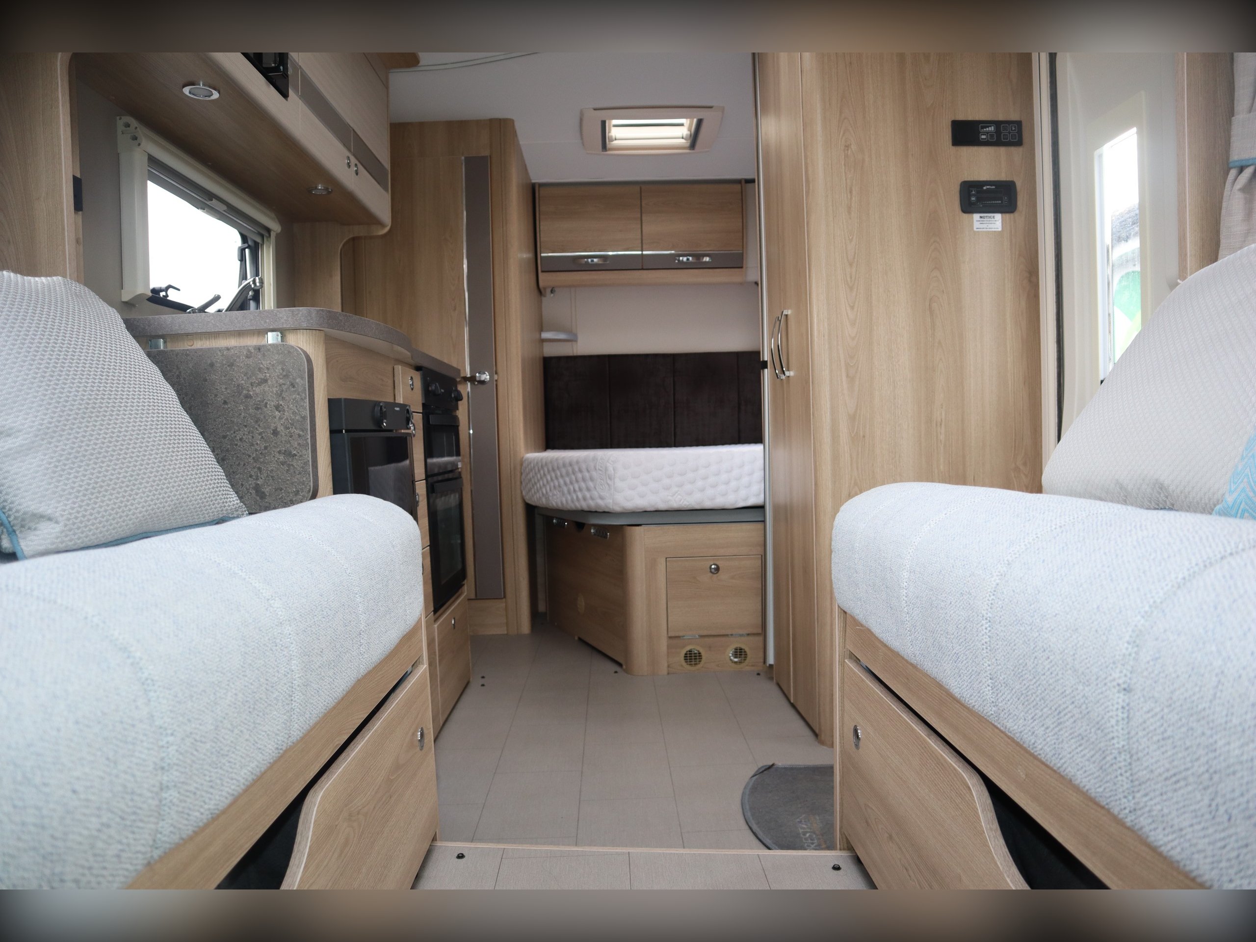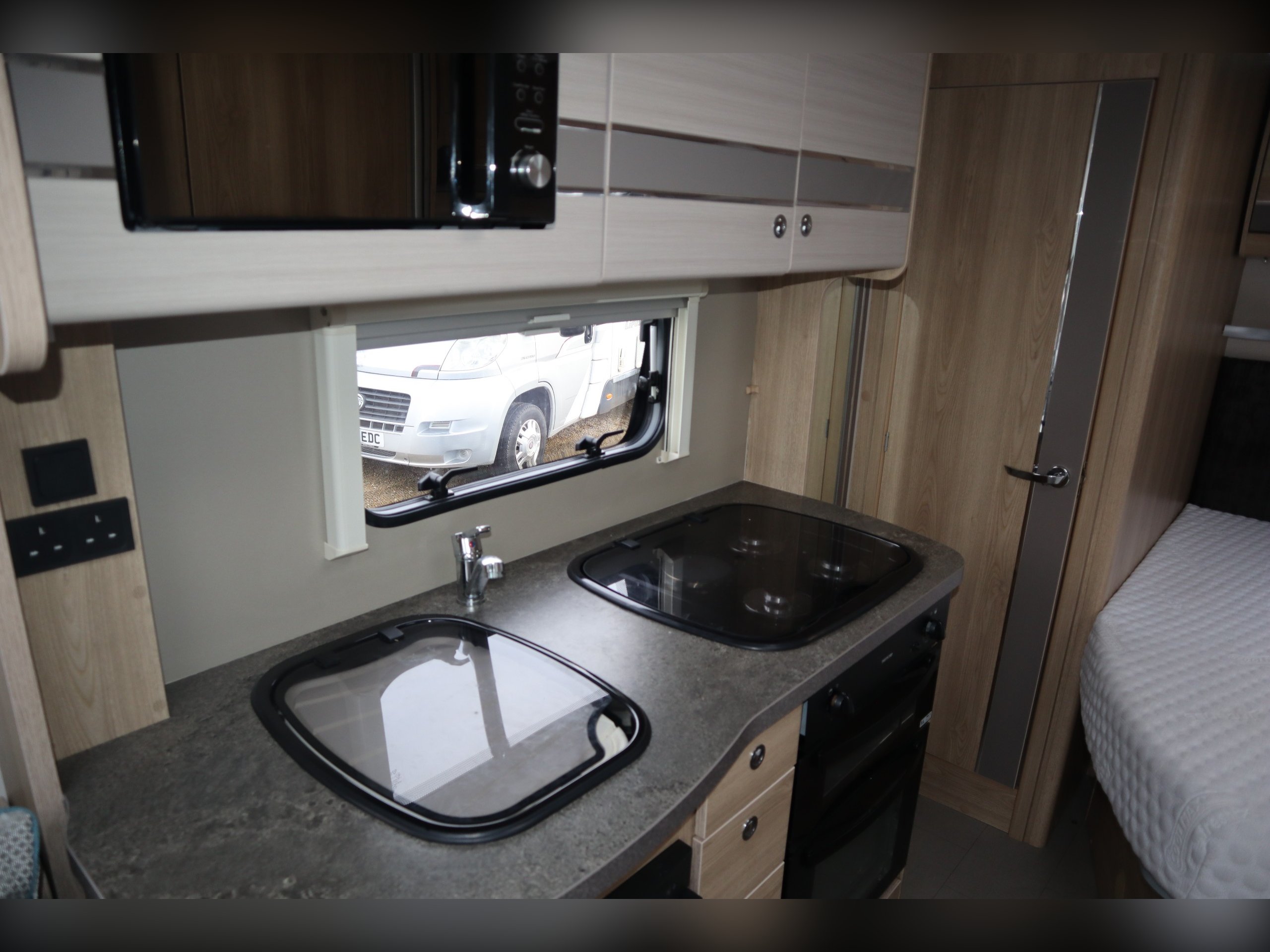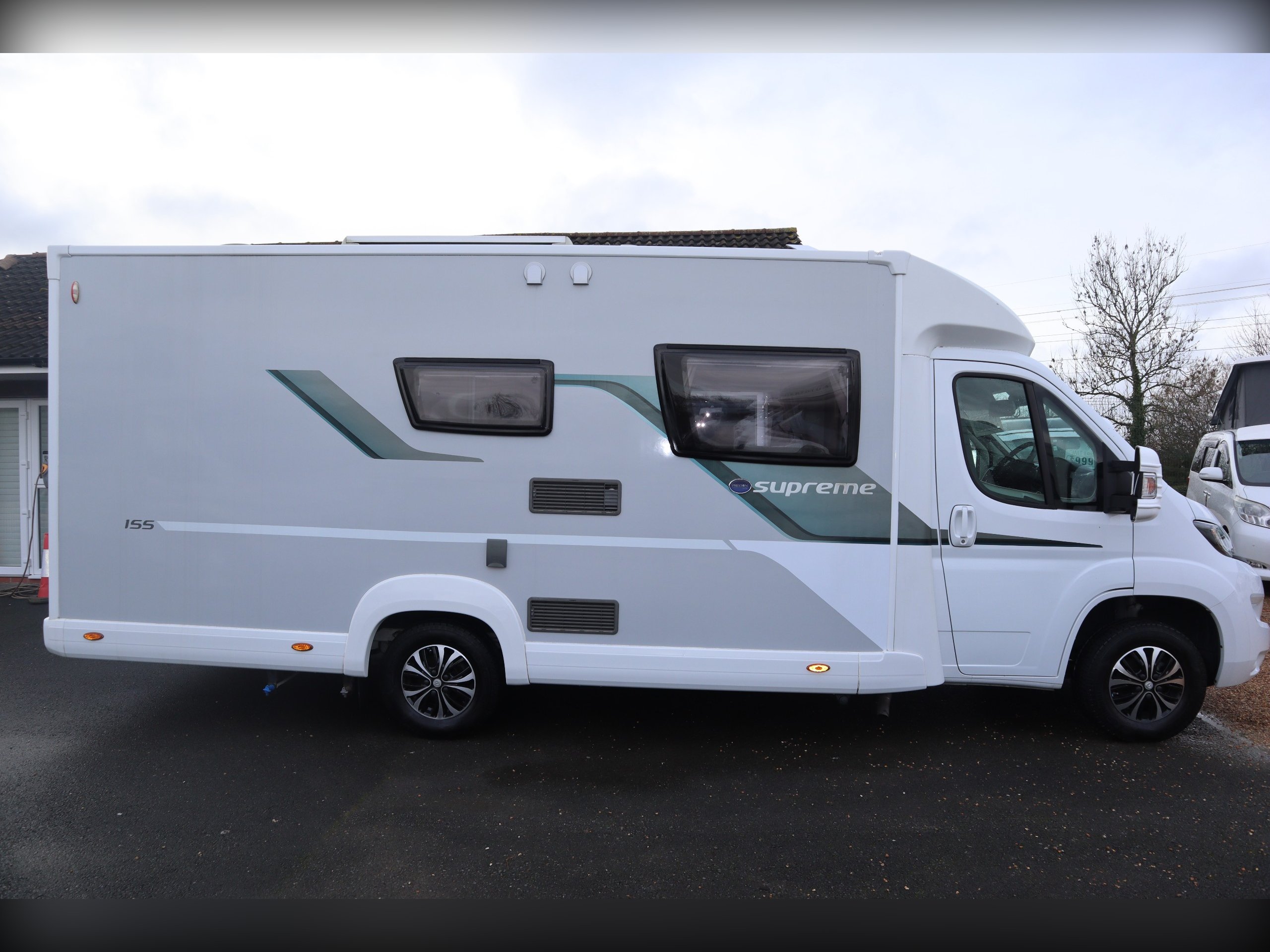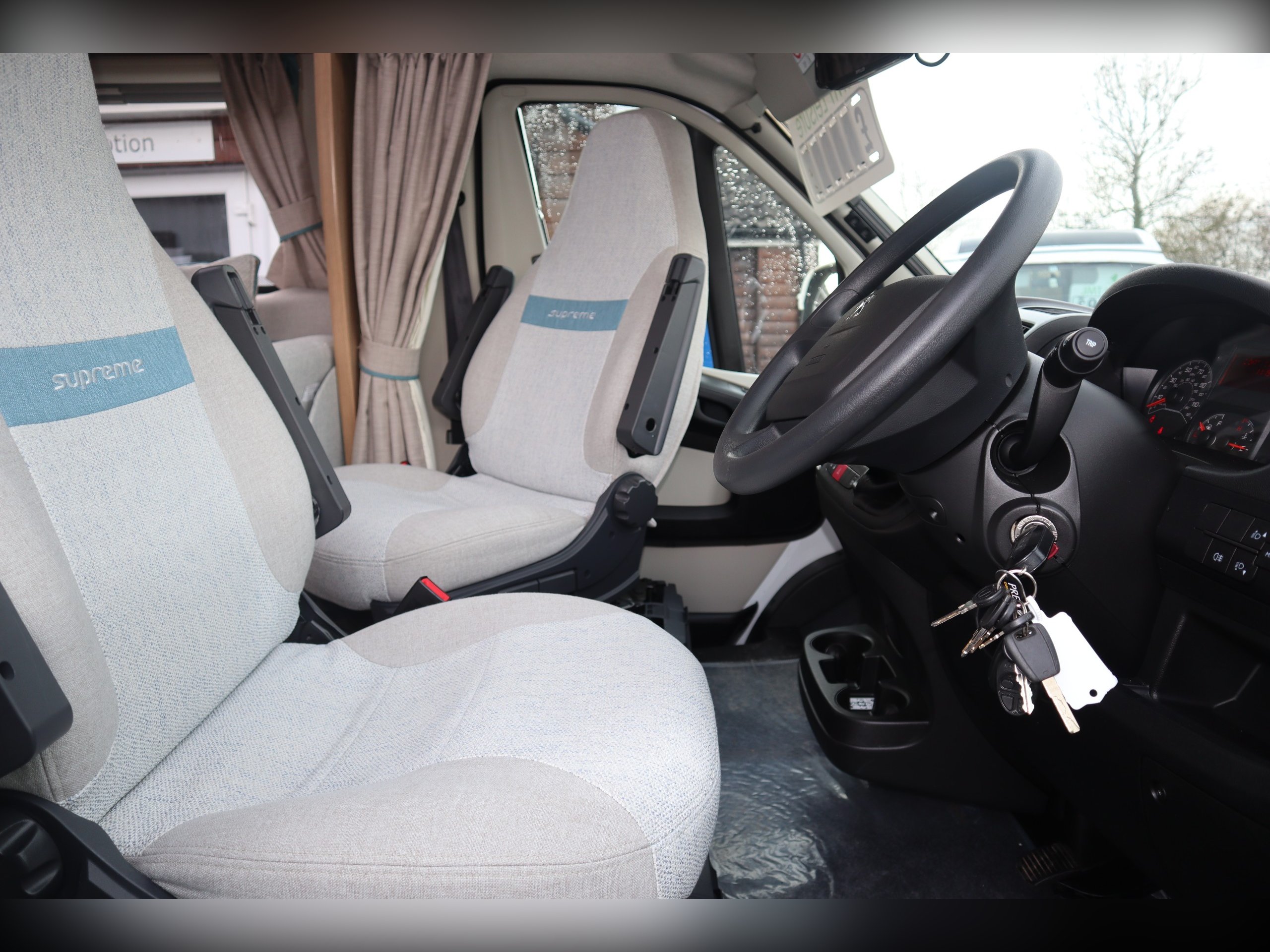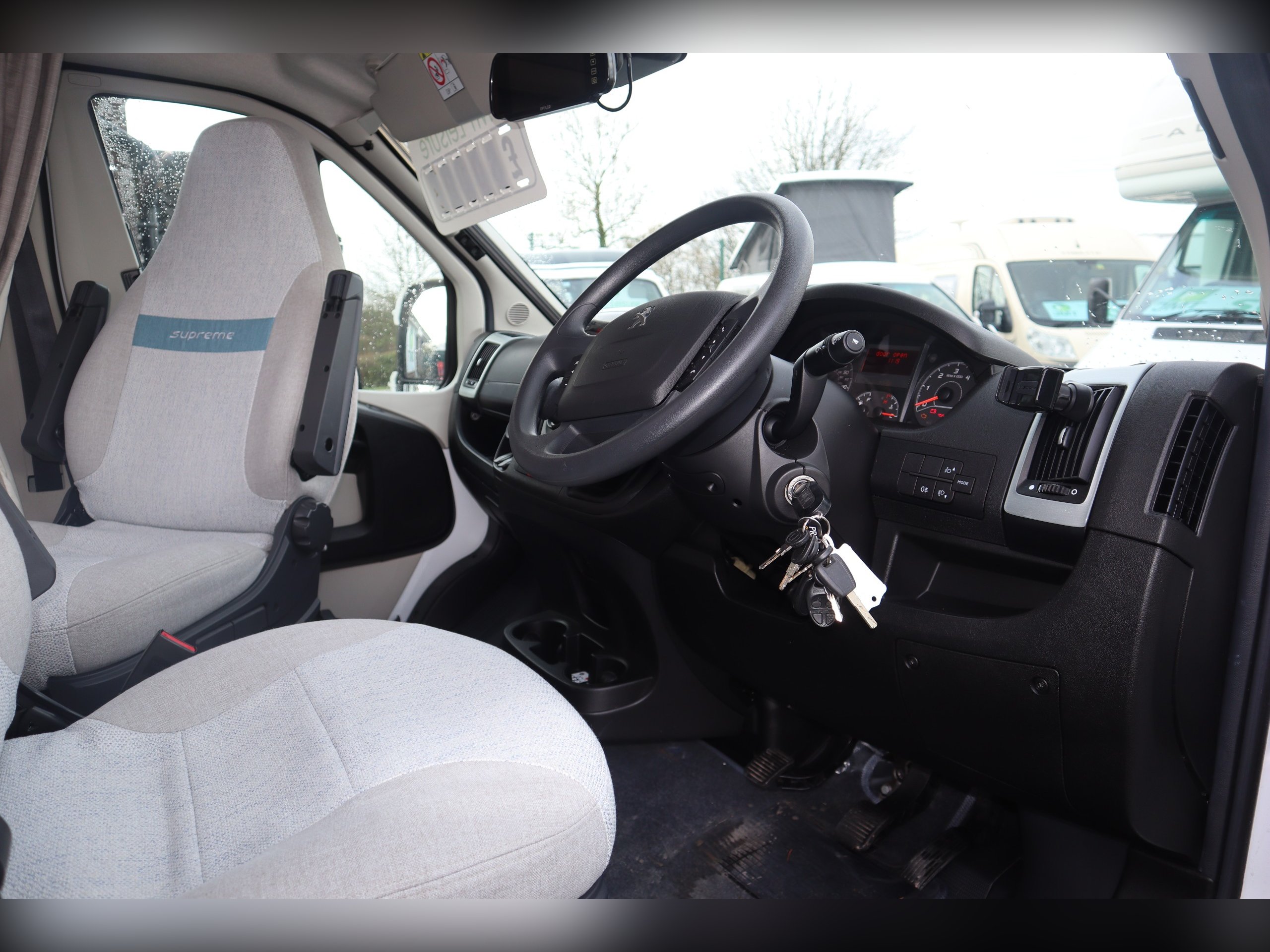 Elddis Supreme 155, 4 Berth, 4 Belts, Fixed Rear Bed, Front Benches that convert to a double bed, Side well equipped kitchen with Oven, Hob, Grill, Fridge Freezer & Microwave. Large rear side bathroom. Peugeot Boxer Cab with Air Con, Cruise Control, 6 Speed Gearbox, Reversing Camera and Electric Windows & Mirrors. Extras include Alloy Wheels, Tow Bar and Awning.