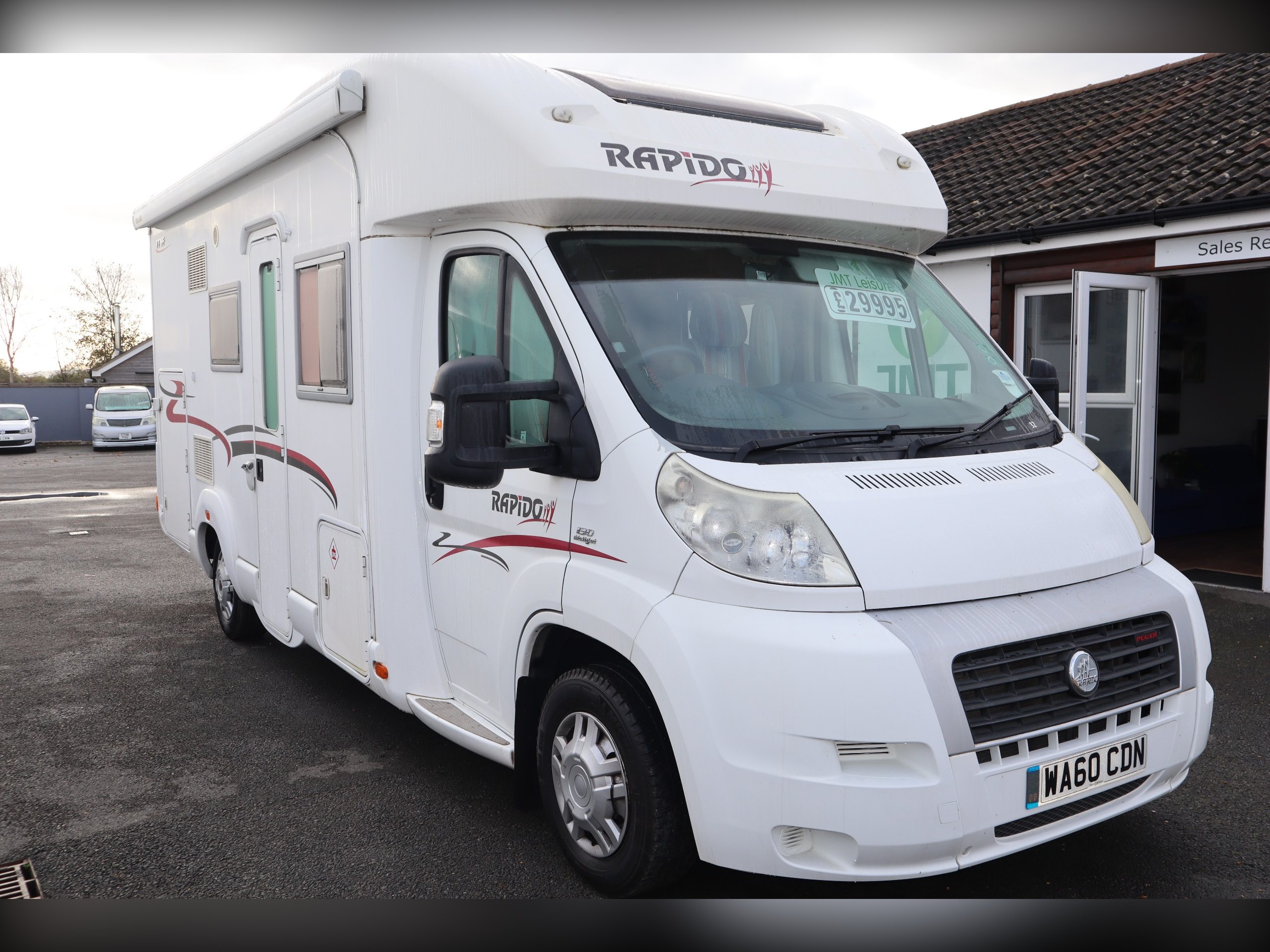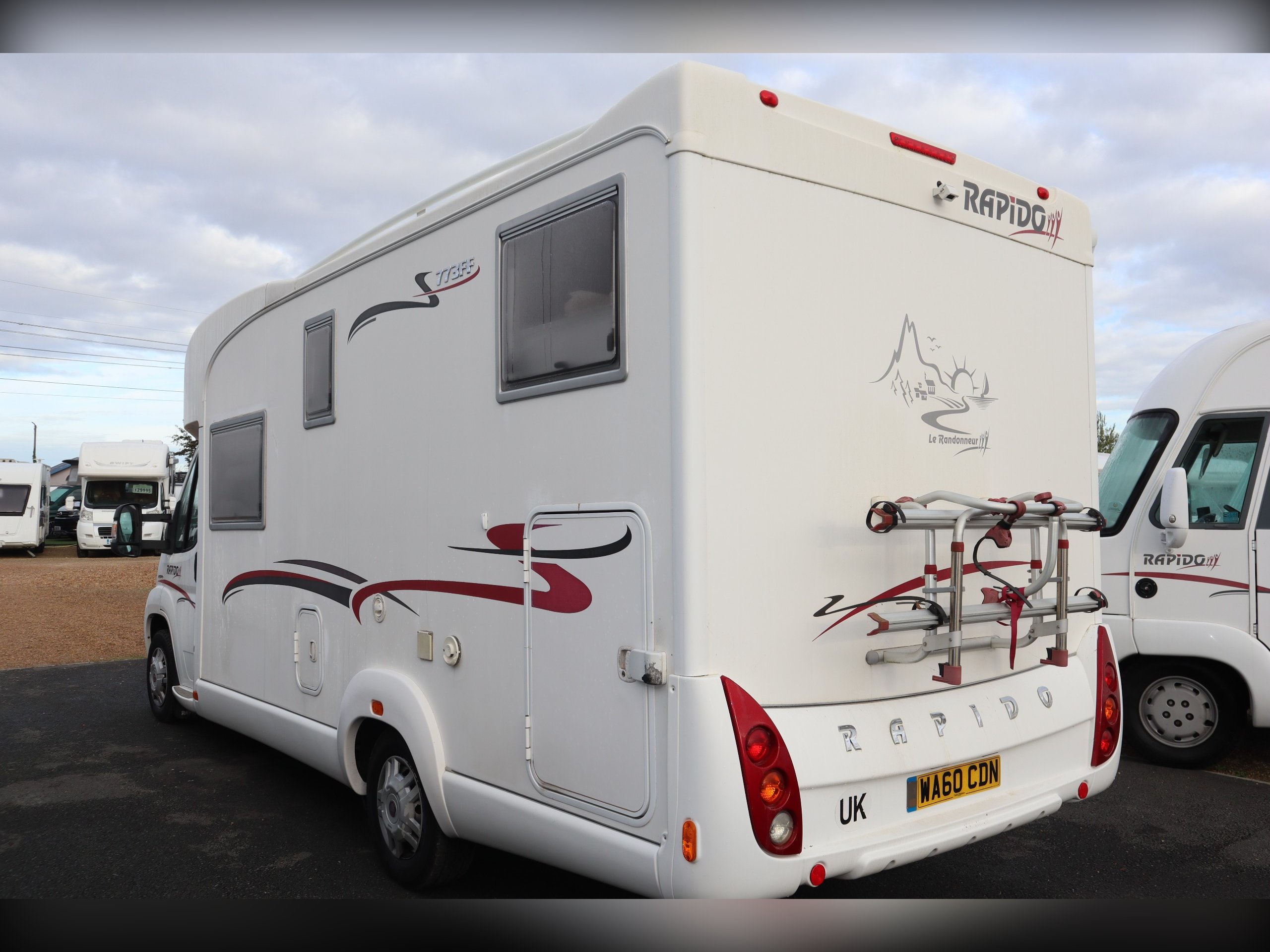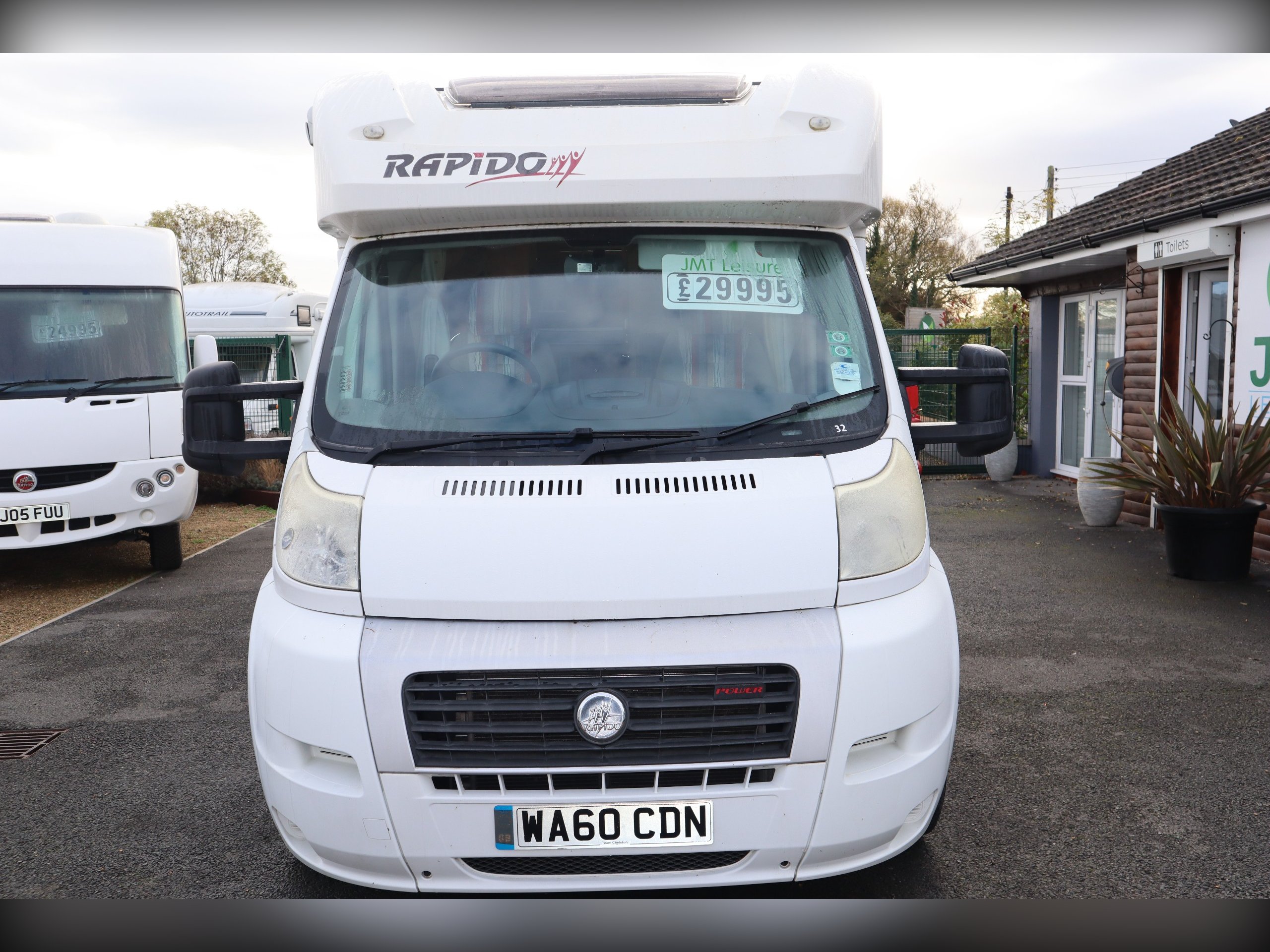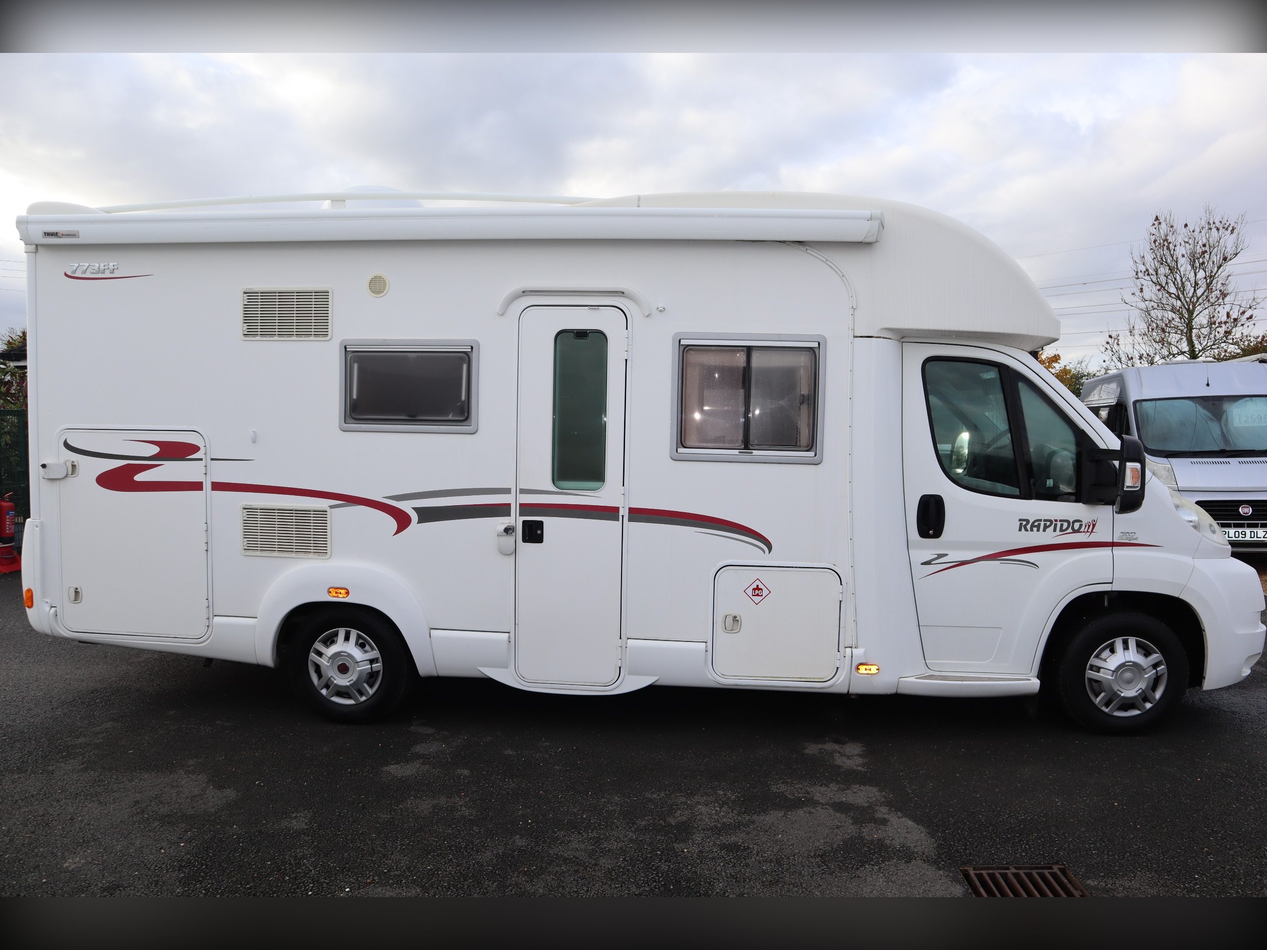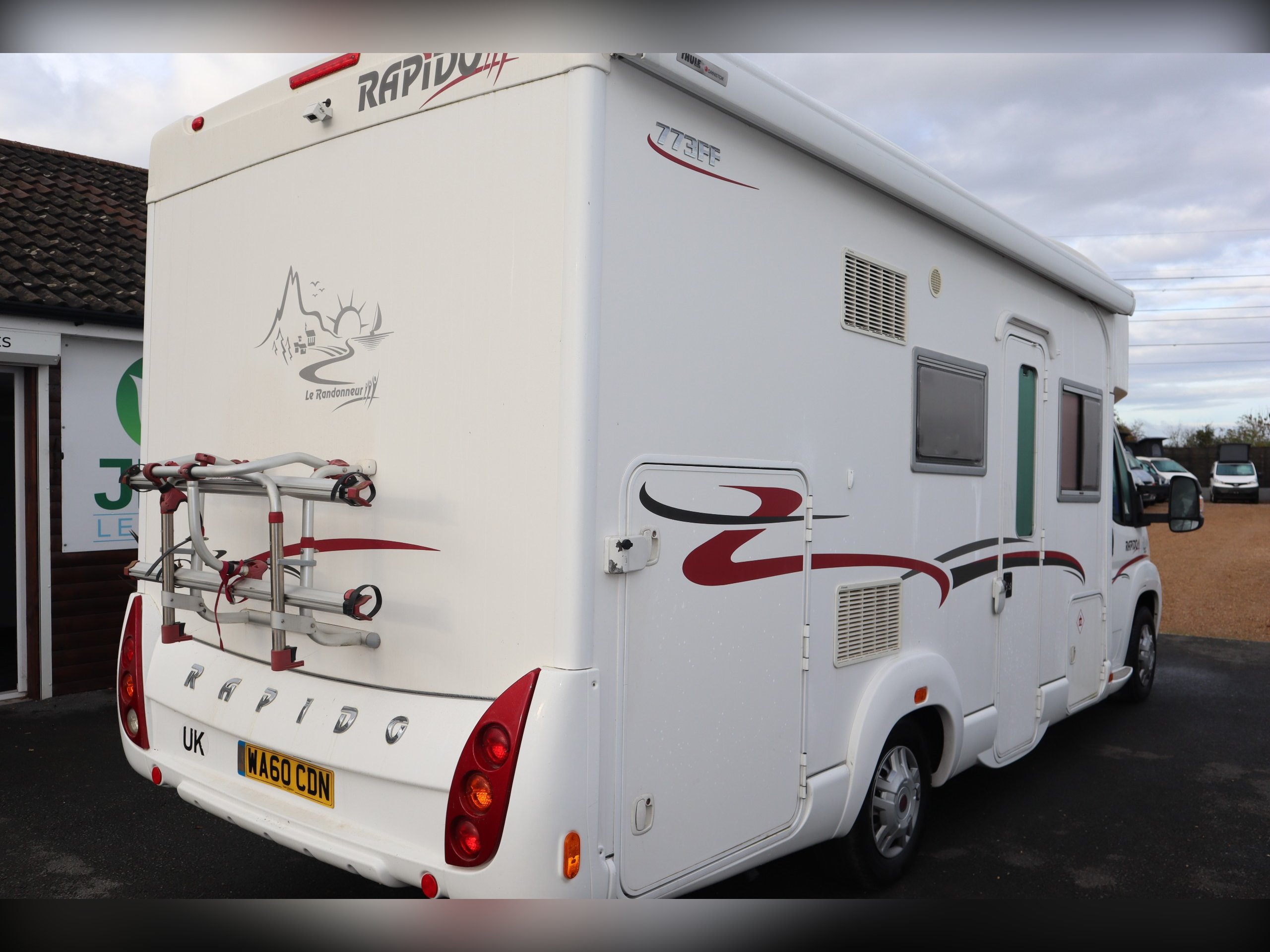 Rapido 773FF, 4 Berth, 4 Belts, Rear fixed bed, Garage. Front dinette with 2 additional seatbelts. Large drop down double bed. Well equipped side kitchen. Spacious bathroom with shower, cassette toilet and wash basin. Fiat Ducato cab with 6 speed gearbox, air conditioning, cruise control, electric windows & mirrors. Extras include a bike rack and awning. Hight quality well built Motorhome.