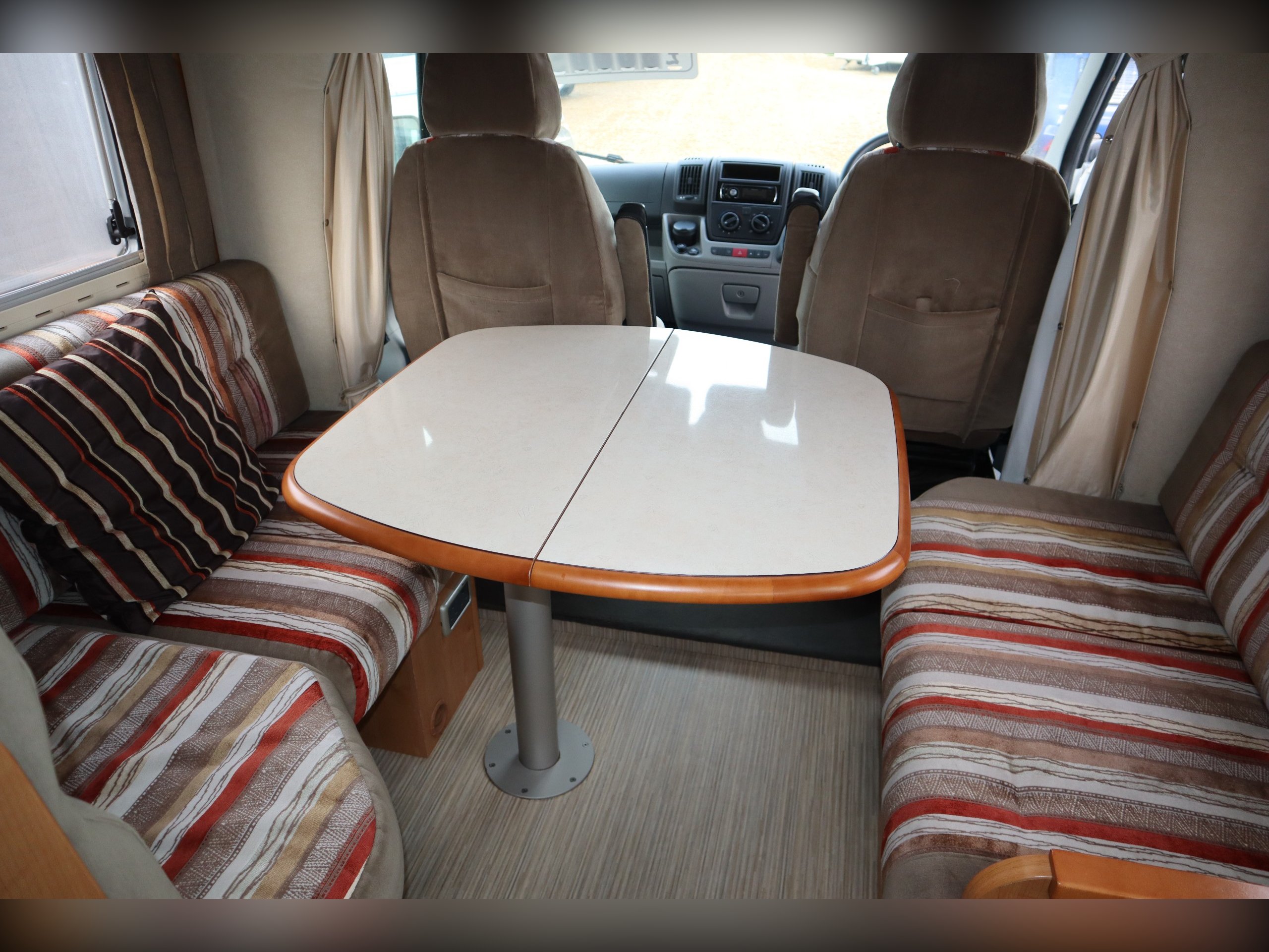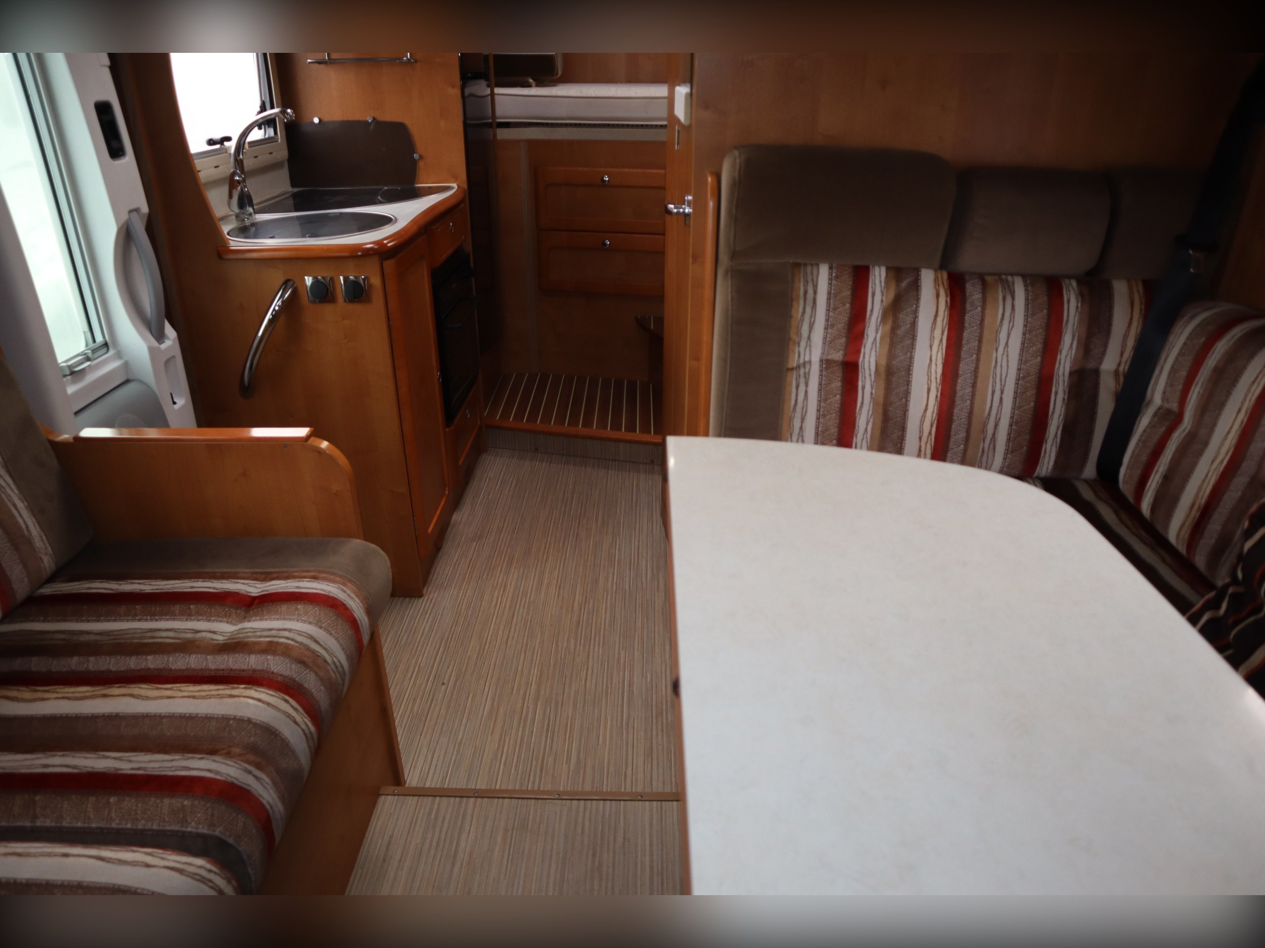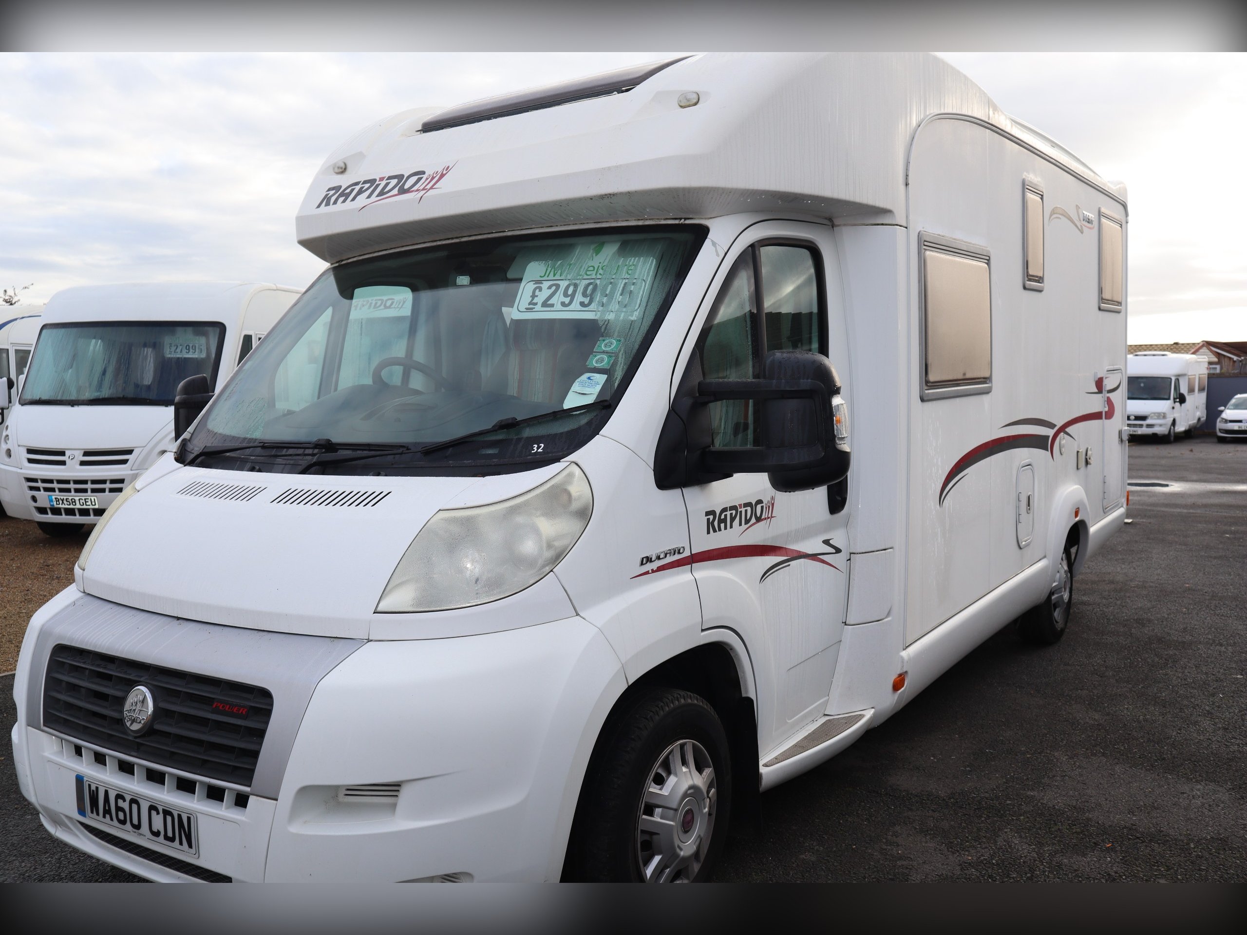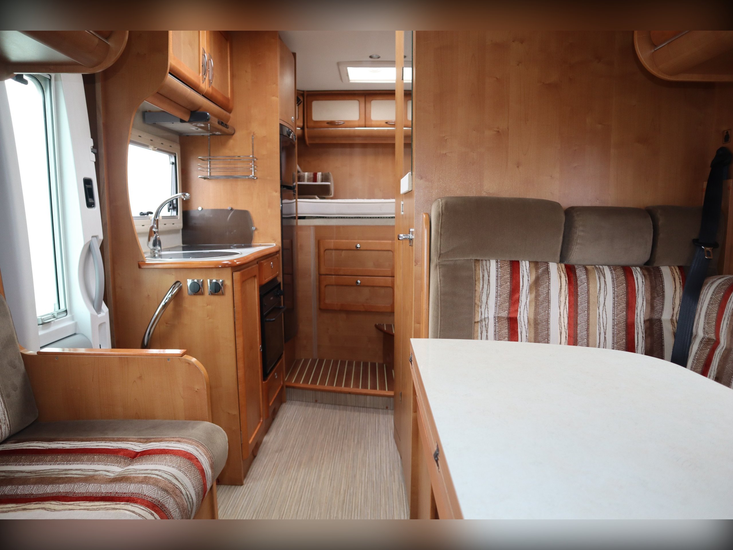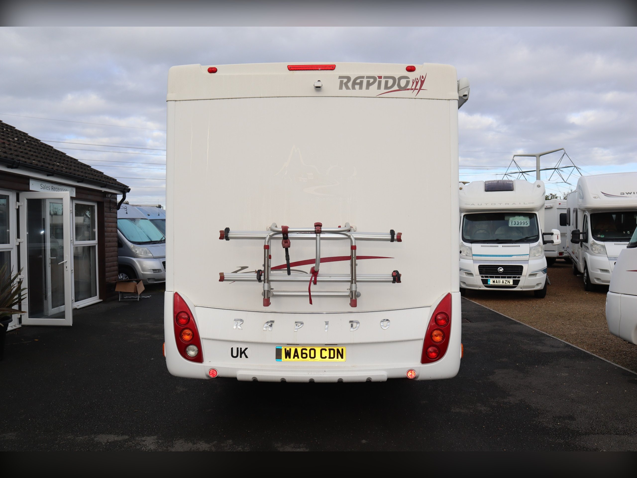 Rapido 773FF, 4 Berth, 4 Belts, Rear fixed bed, Garage. Front dinette with 2 additional seatbelts. Large drop down double bed. Well equipped side kitchen. Spacious bathroom with shower, cassette toilet and wash basin. Fiat Ducato cab with 6 speed gearbox, air conditioning, cruise control, electric windows & mirrors. Extras include a bike rack and awning. Hight quality well built Motorhome.