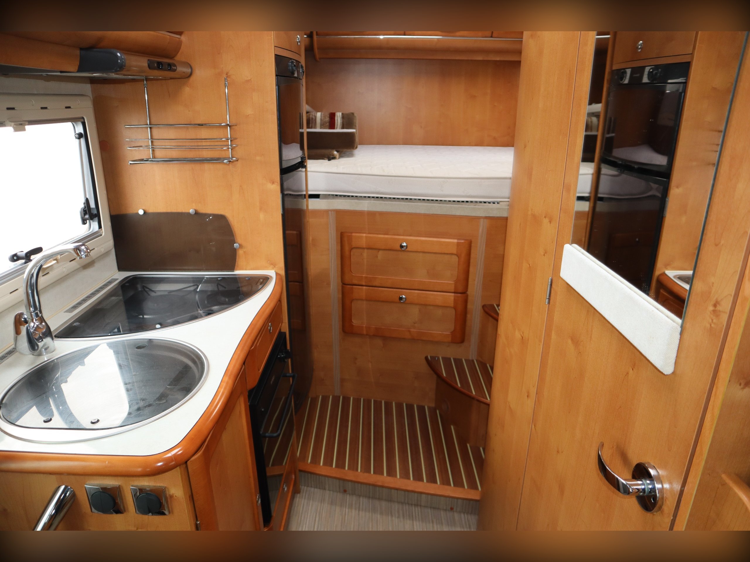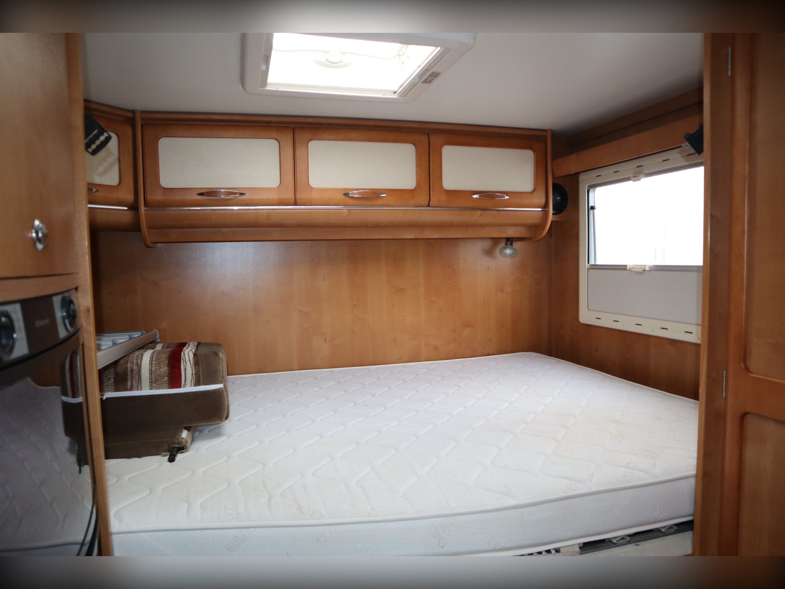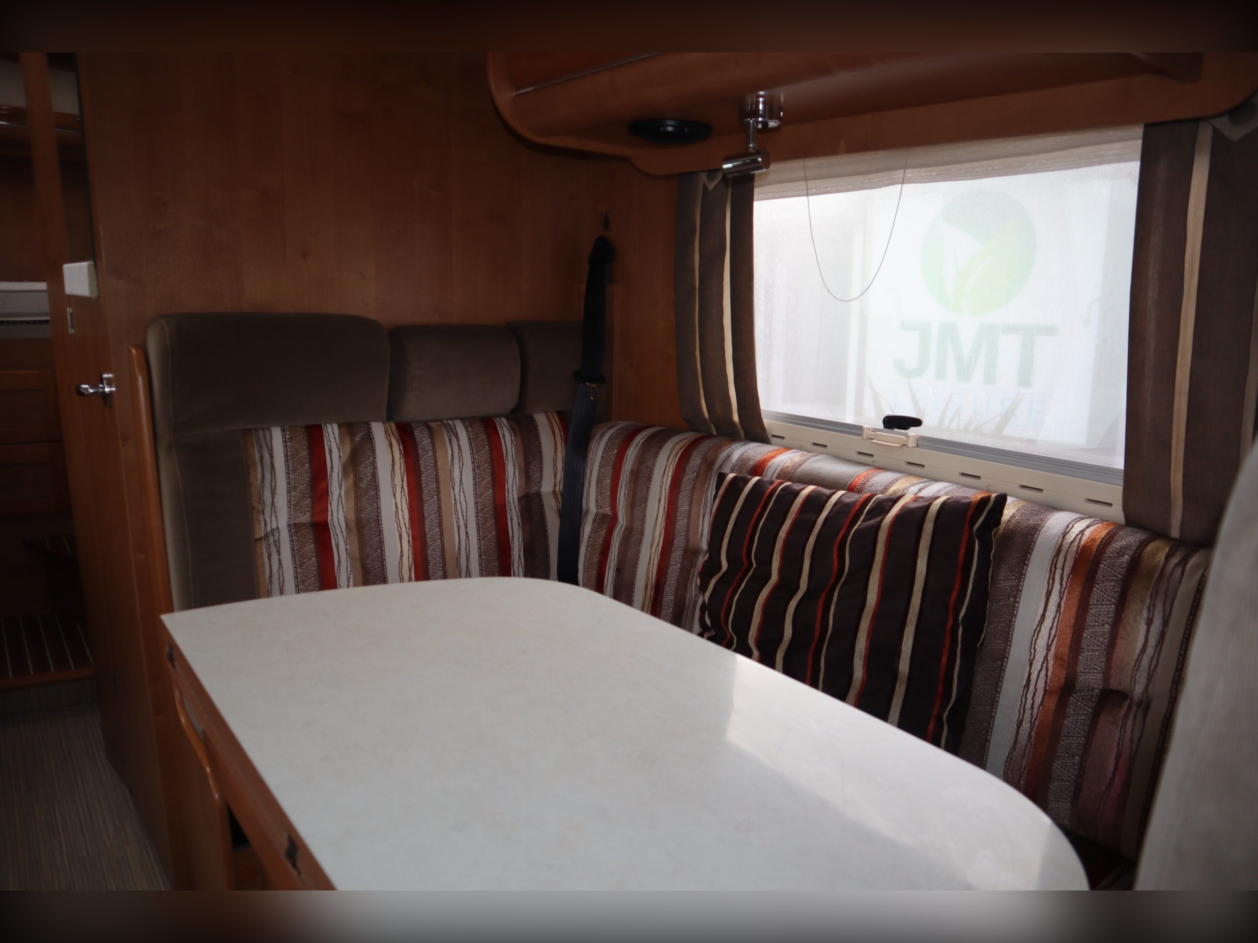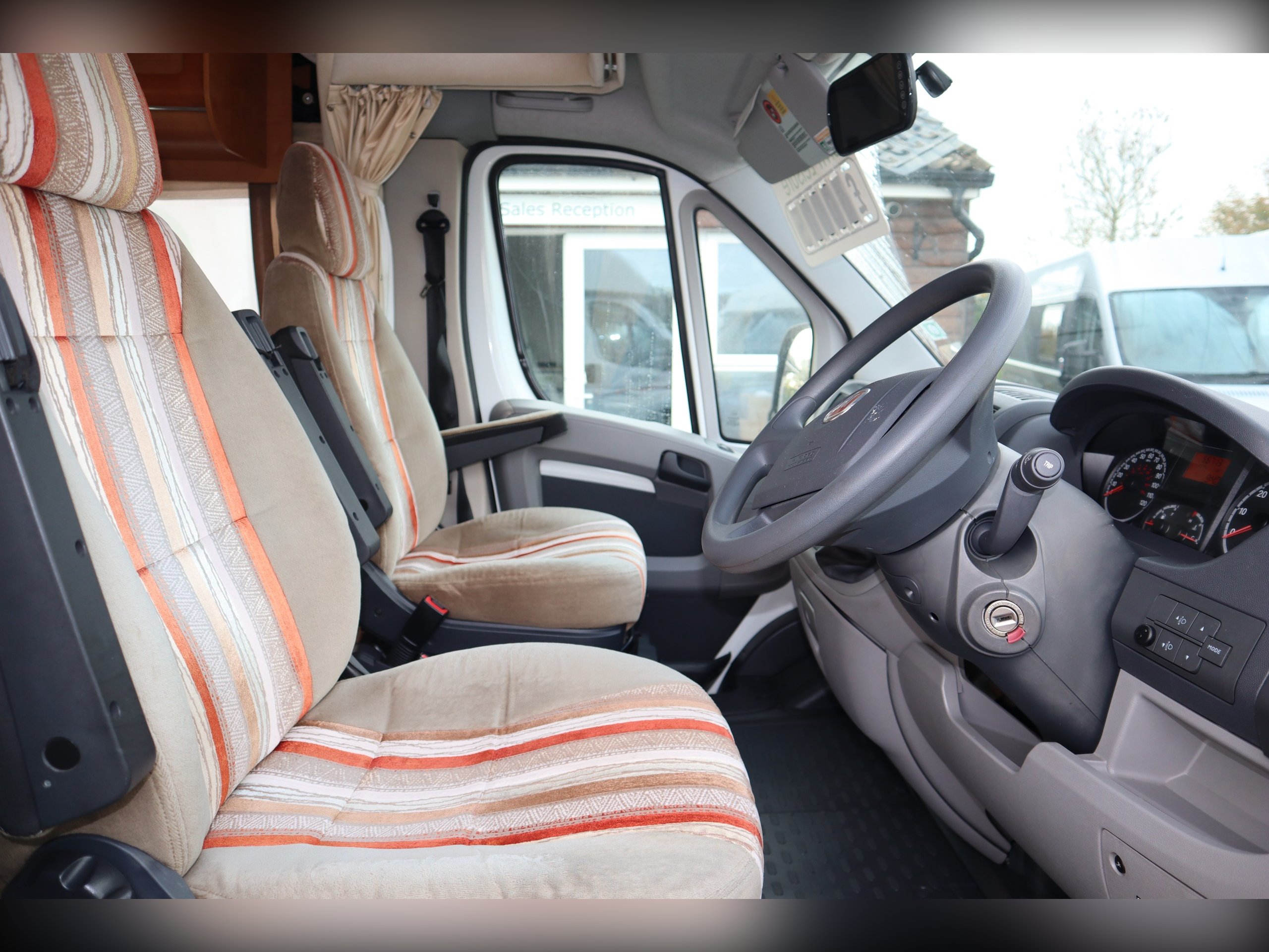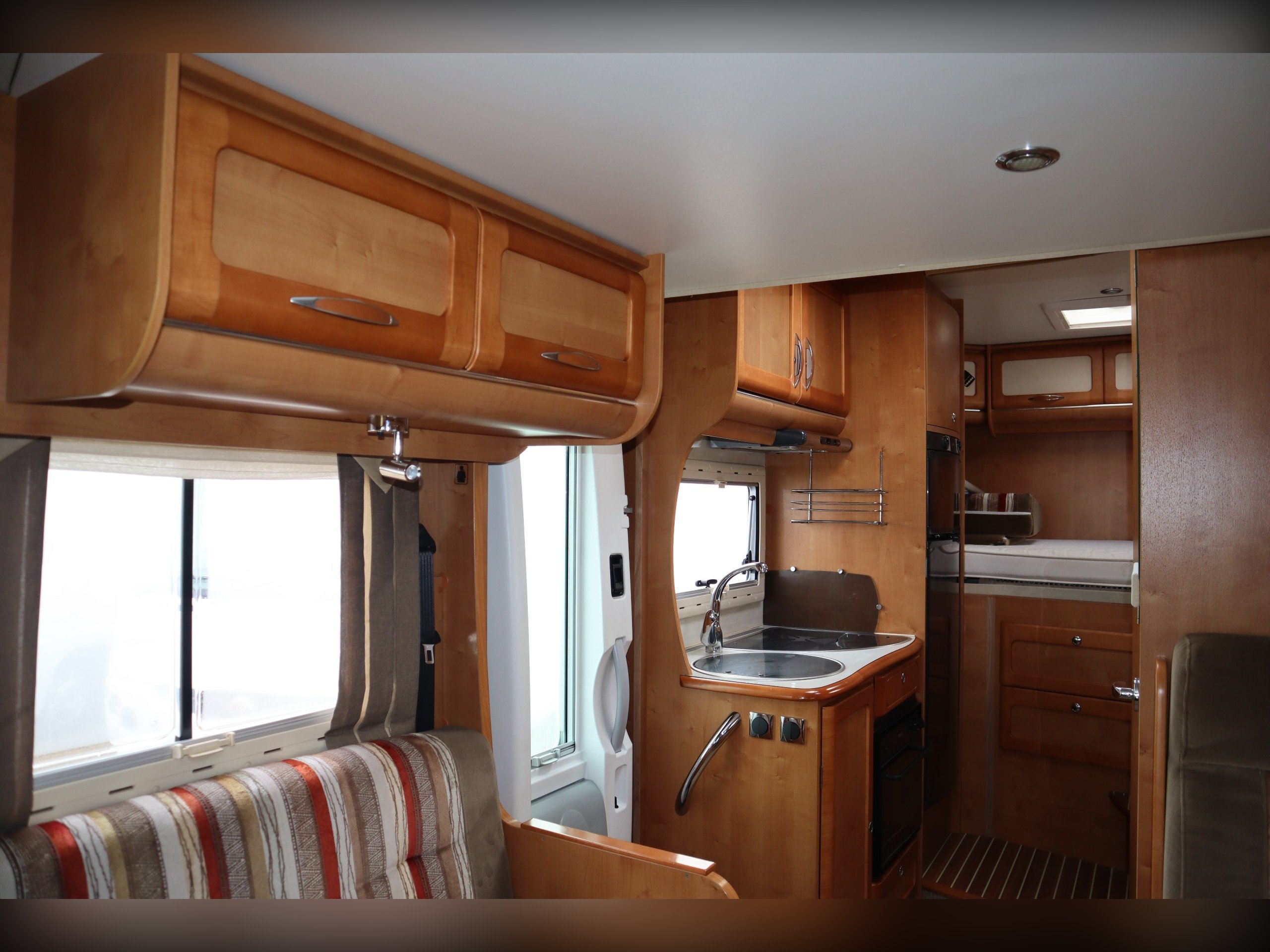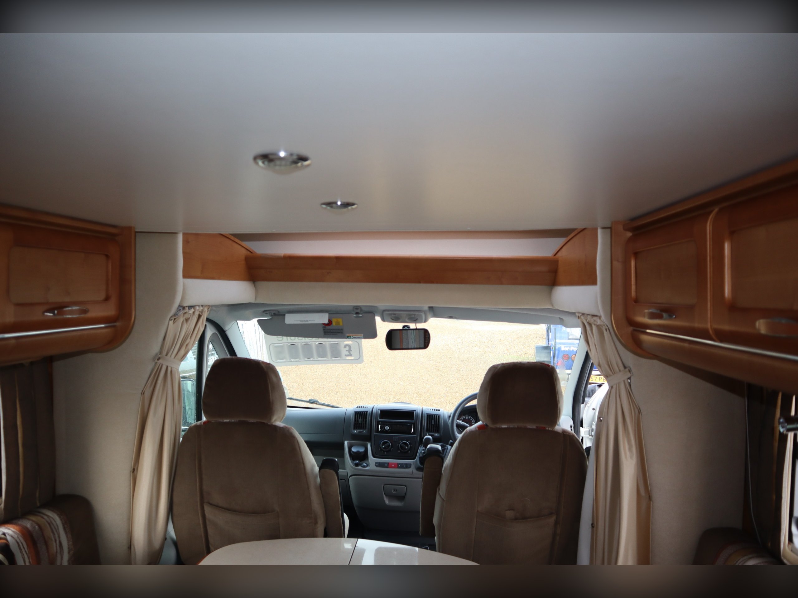 Rapido 773FF, 4 Berth, 4 Belts, Rear fixed bed, Garage. Front dinette with 2 additional seatbelts. Large drop down double bed. Well equipped side kitchen. Spacious bathroom with shower, cassette toilet and wash basin. Fiat Ducato cab with 6 speed gearbox, air conditioning, cruise control, electric windows & mirrors. Extras include a bike rack and awning. Hight quality well built Motorhome.