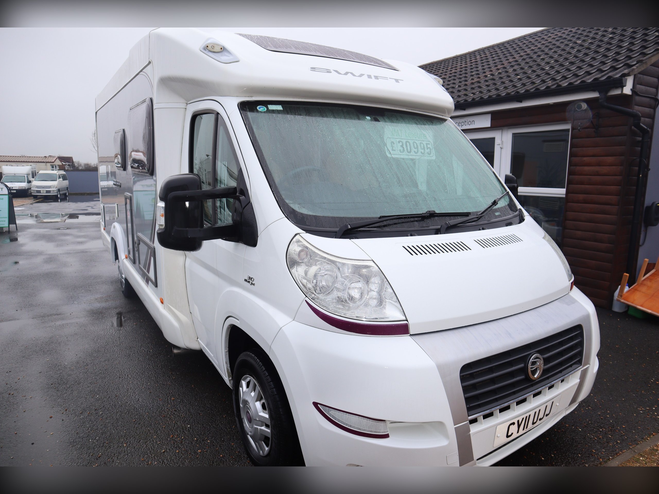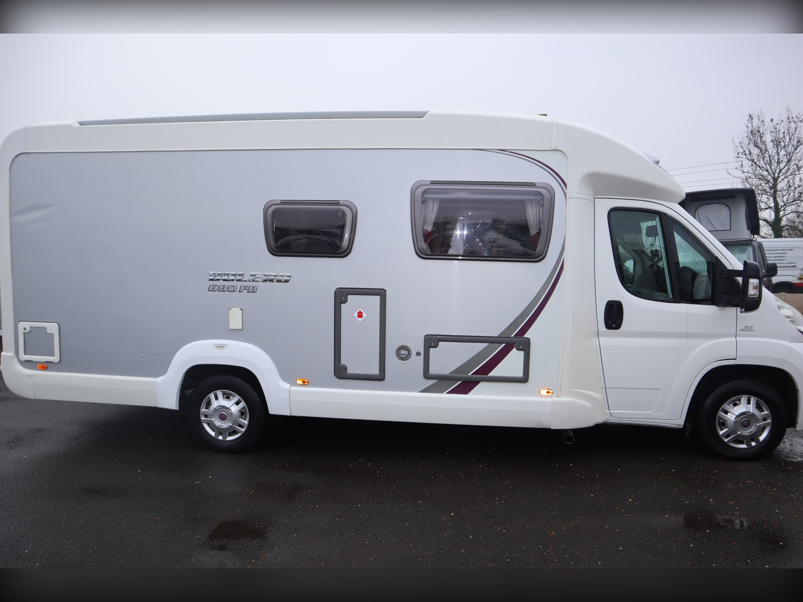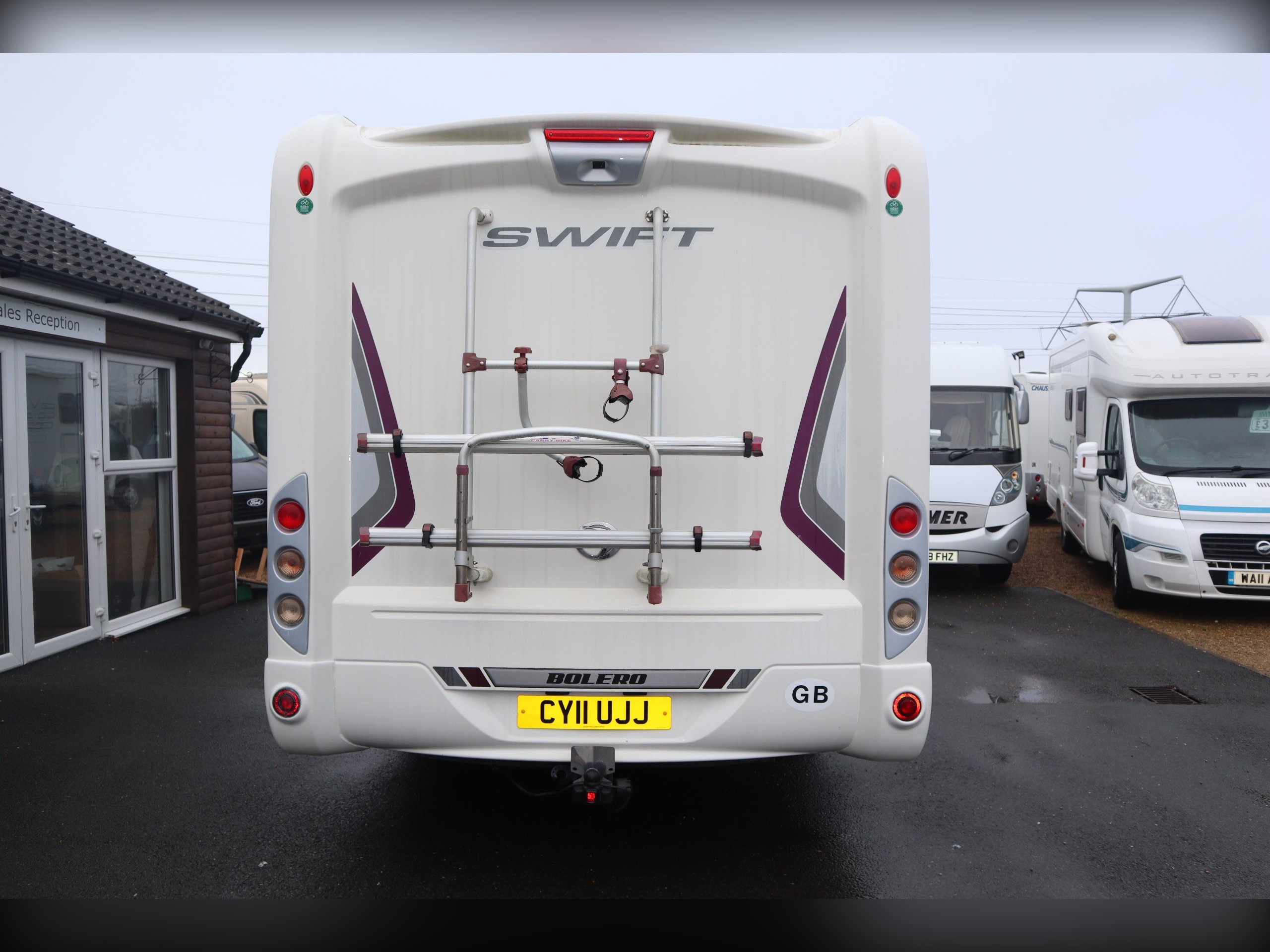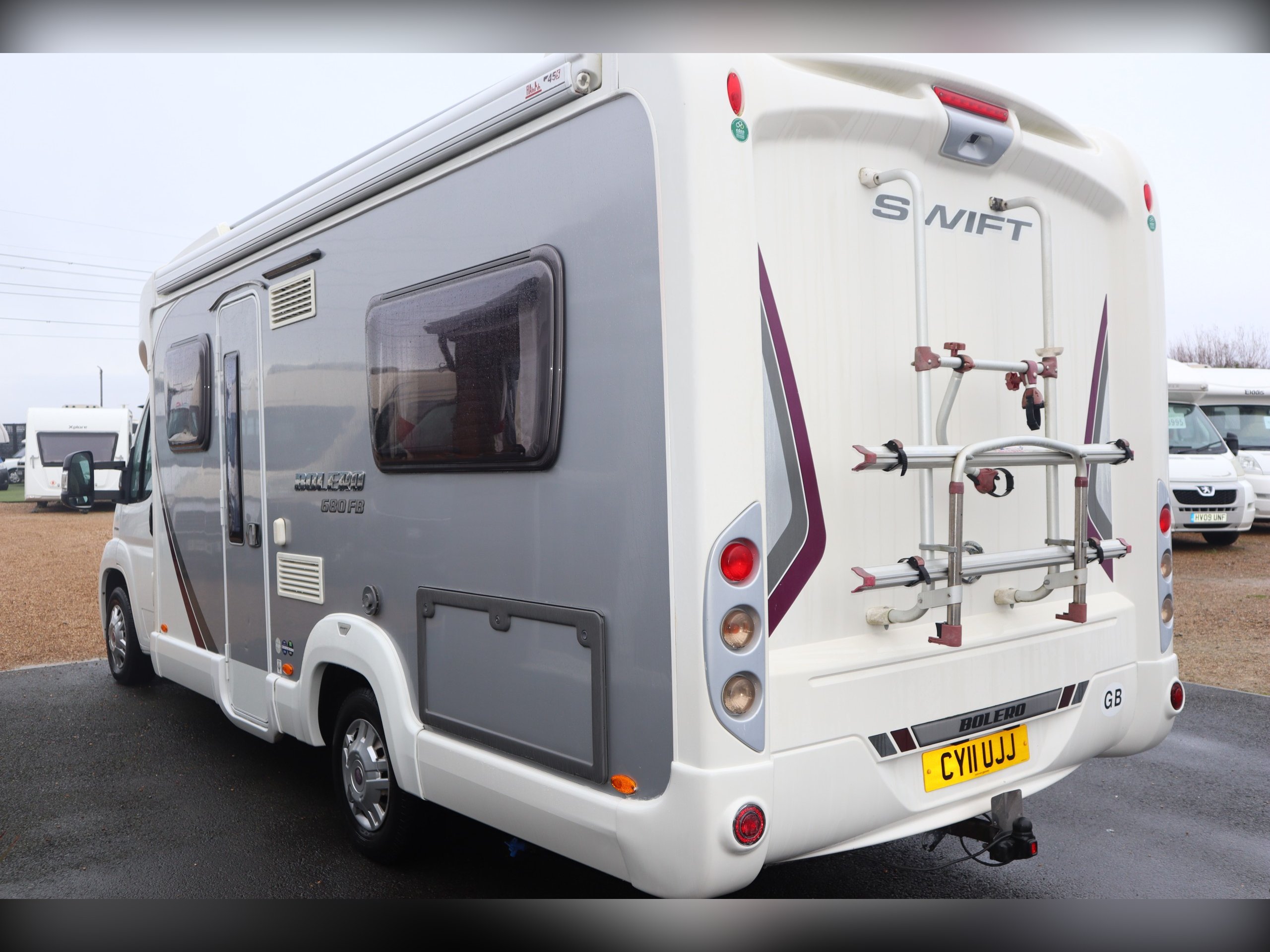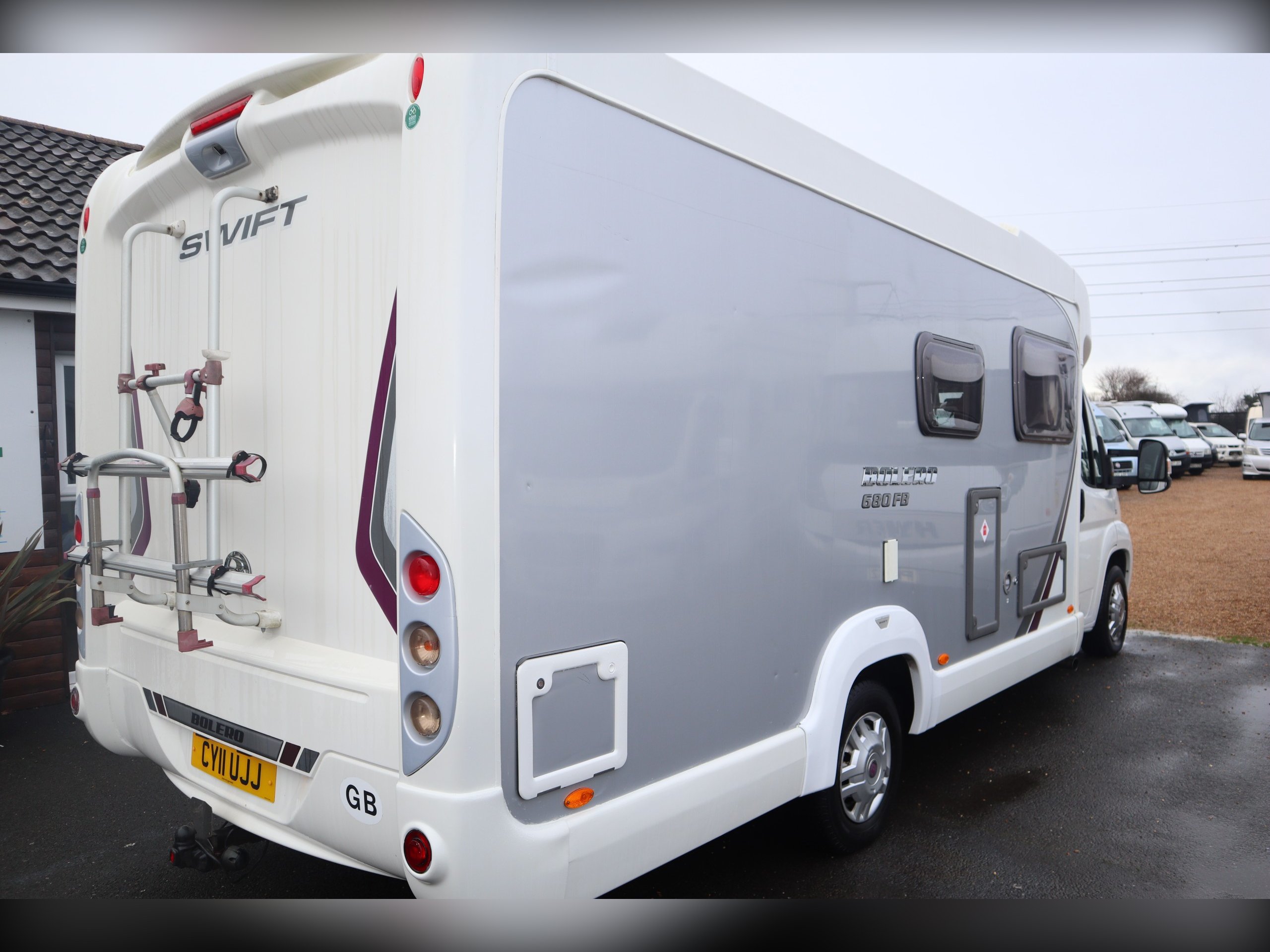 Swift Bolero 680 FB, 4 Berth, 2 Belts, Fixed rear Bed, Front seating that converts to a double bed, Side Kitchen, Rear side Bathroom with cassette toilet, wash basin and separate shower. Well equipped cab with Air Con, cruise control and reversing camera. Extras include Awning, bike rack and tow bar.