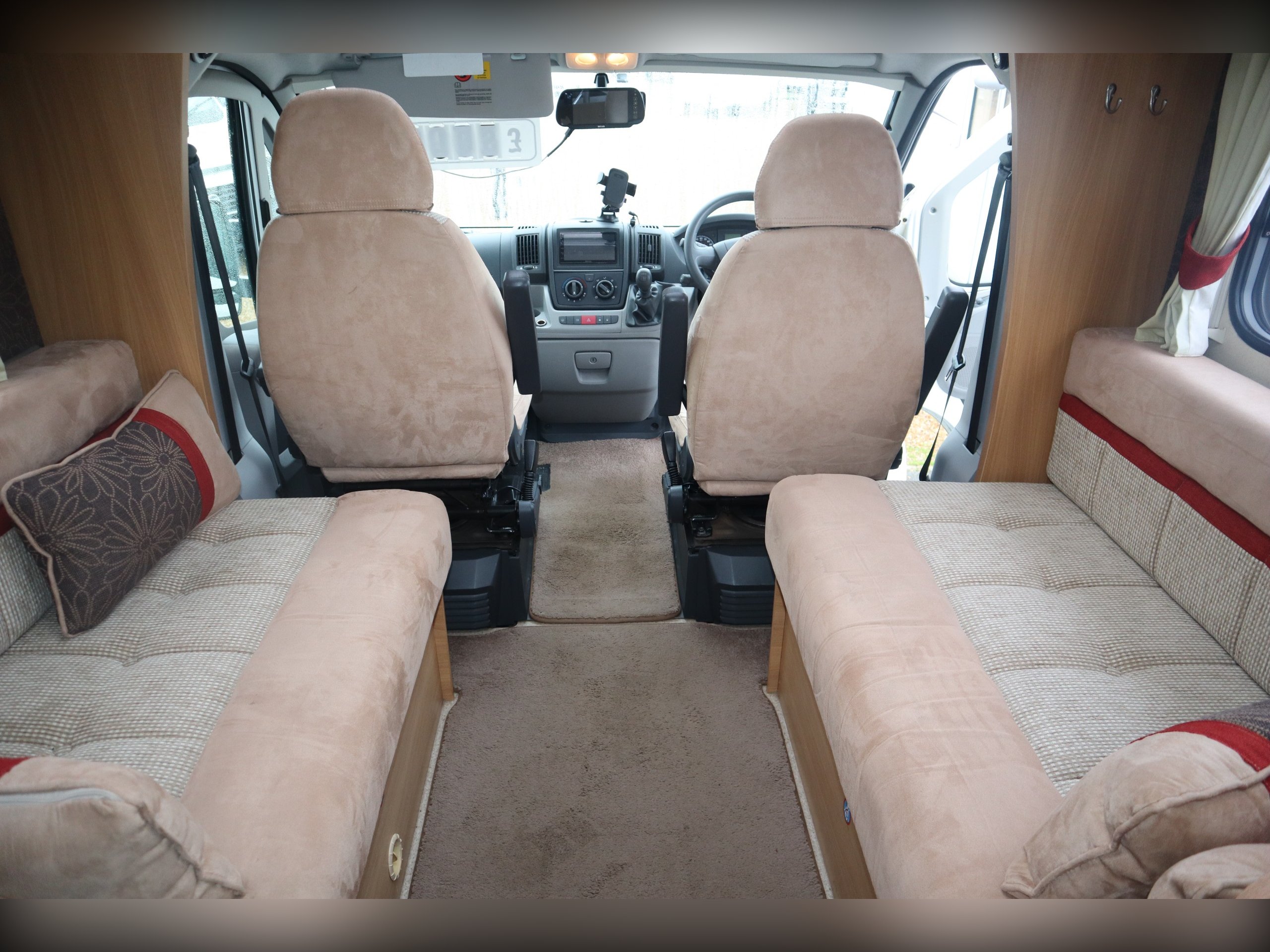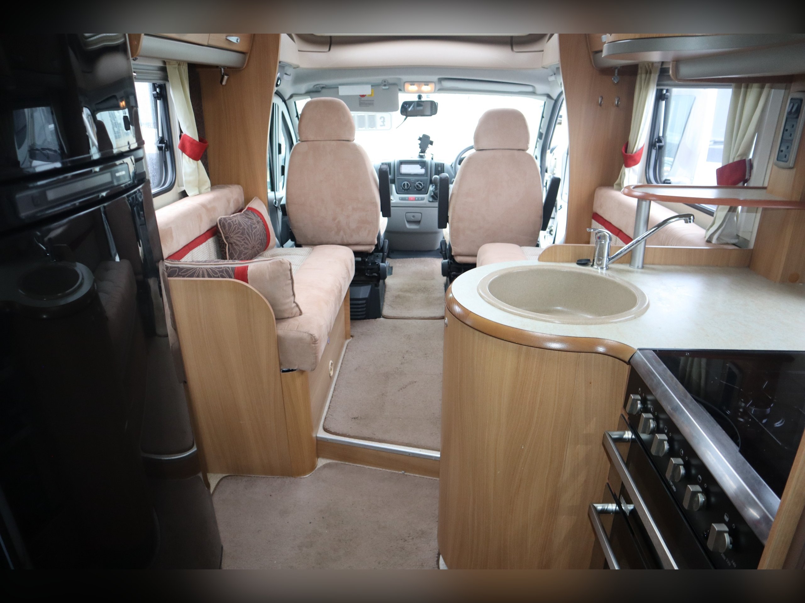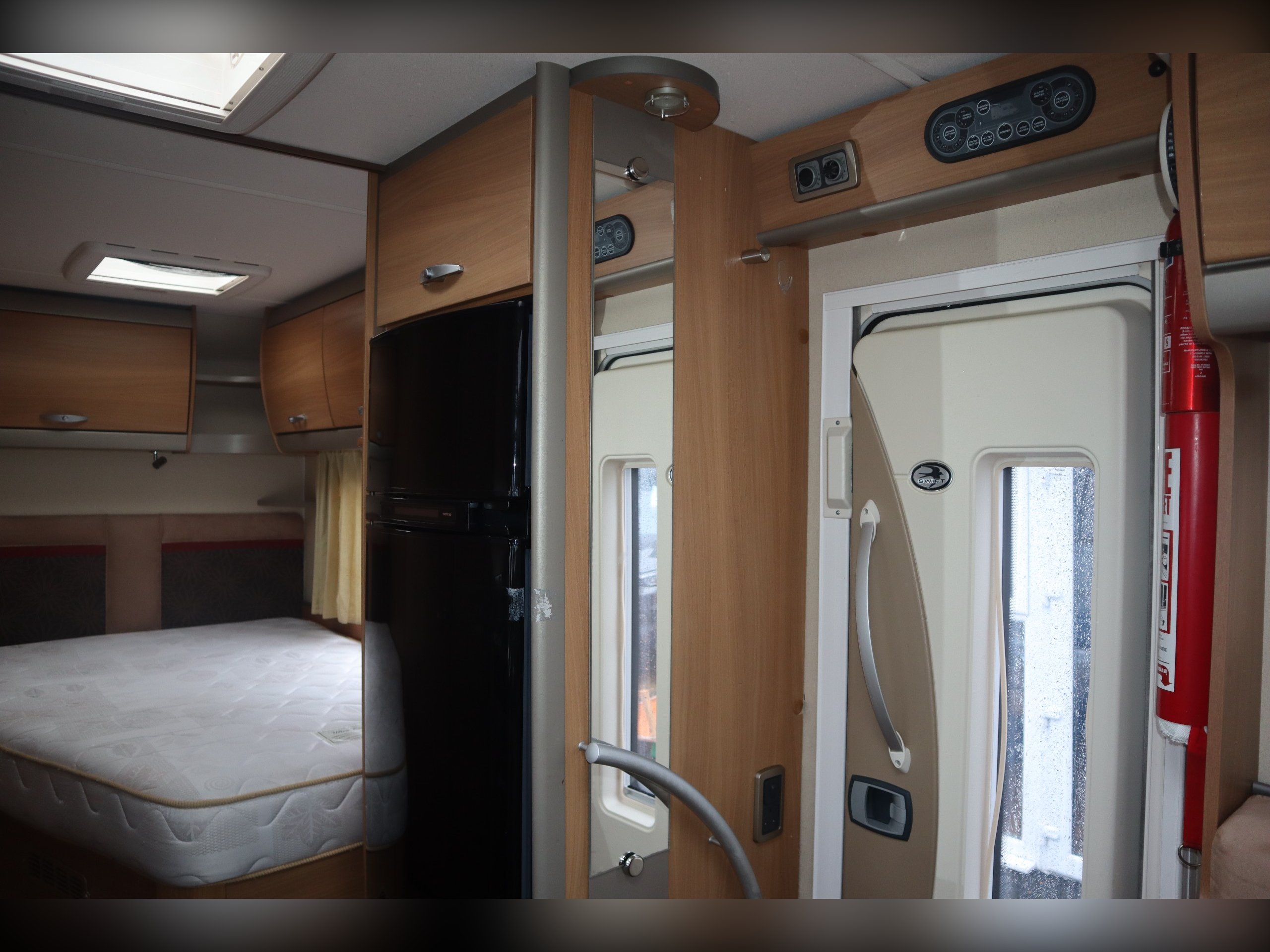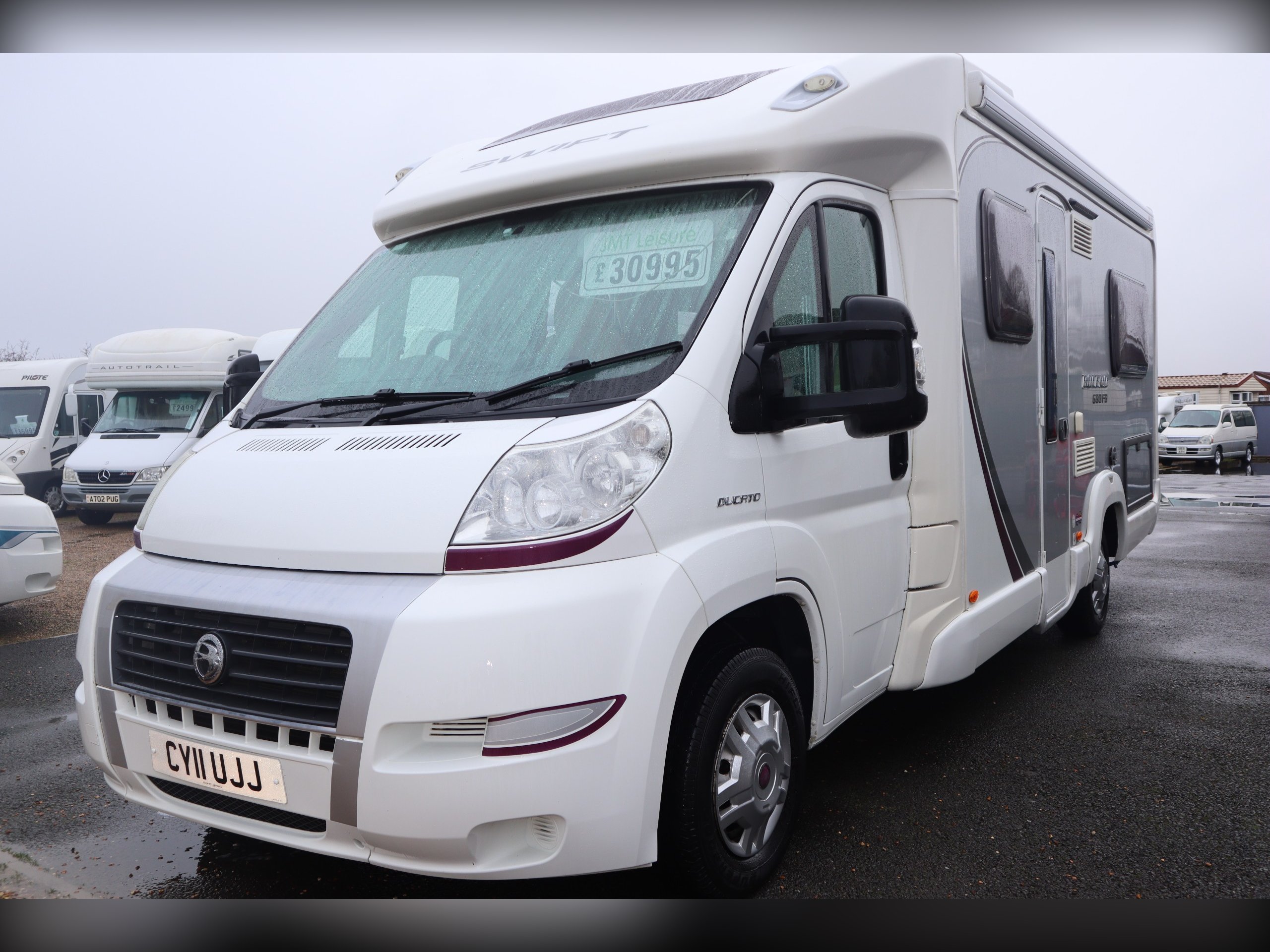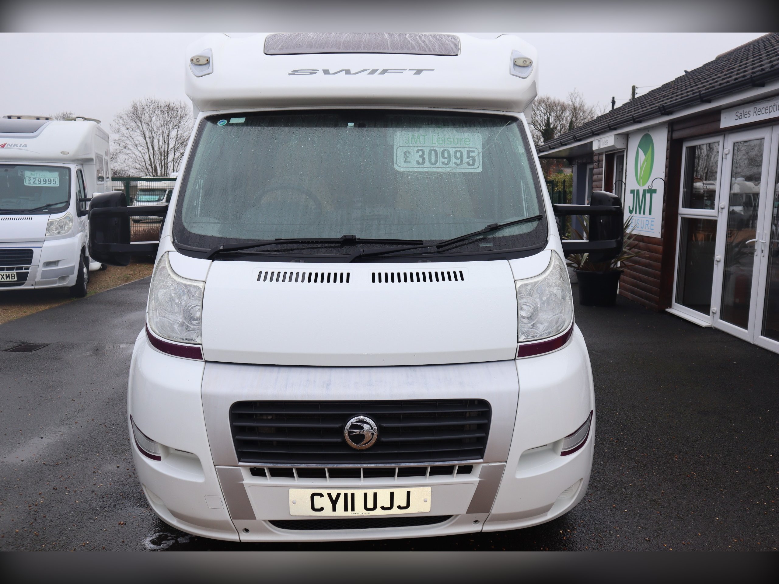 Swift Bolero 680 FB, 4 Berth, 2 Belts, Fixed rear Bed, Front seating that converts to a double bed, Side Kitchen, Rear side Bathroom with cassette toilet, wash basin and separate shower. Well equipped cab with Air Con, cruise control and reversing camera. Extras include Awning, bike rack and tow bar.