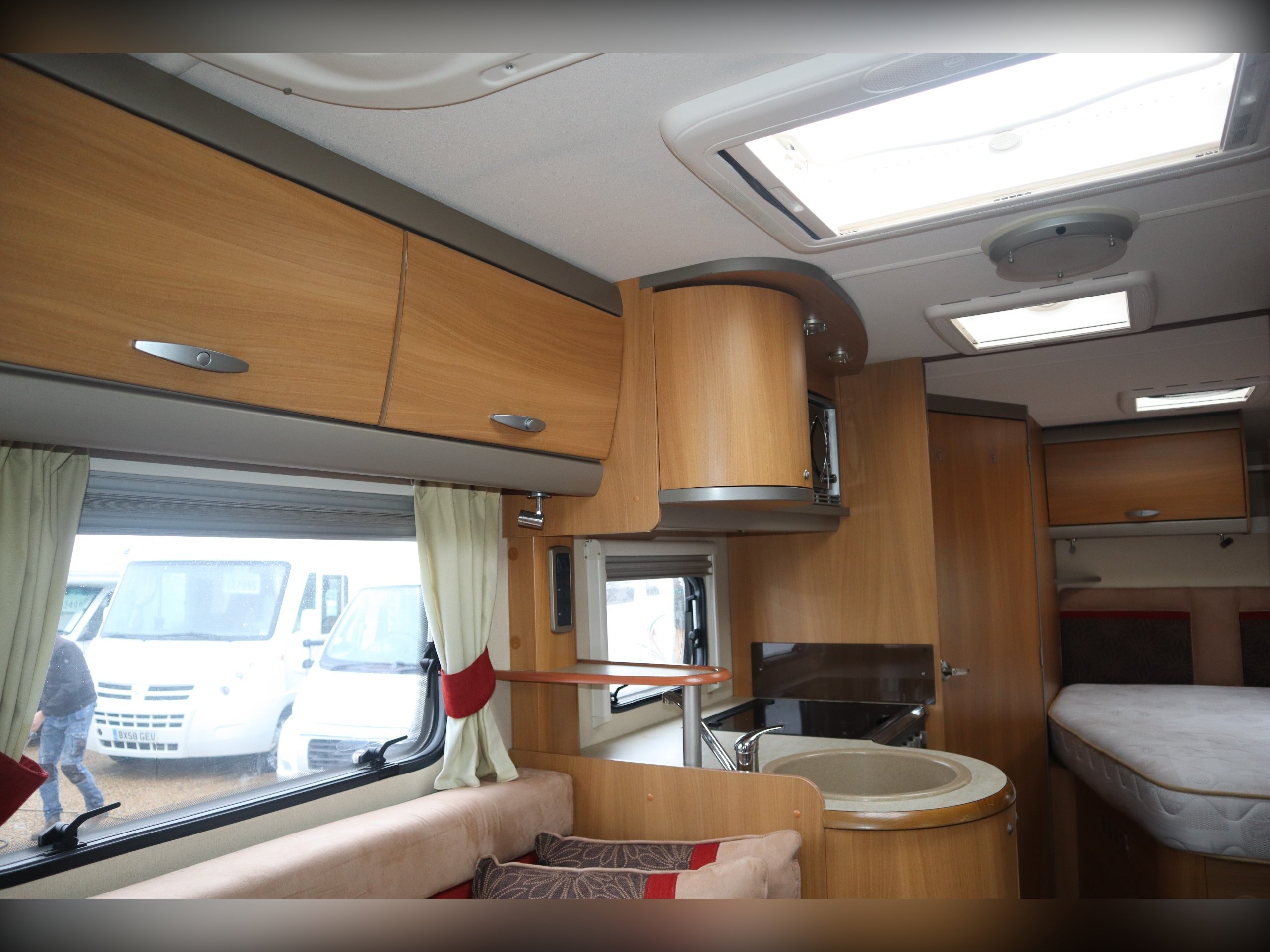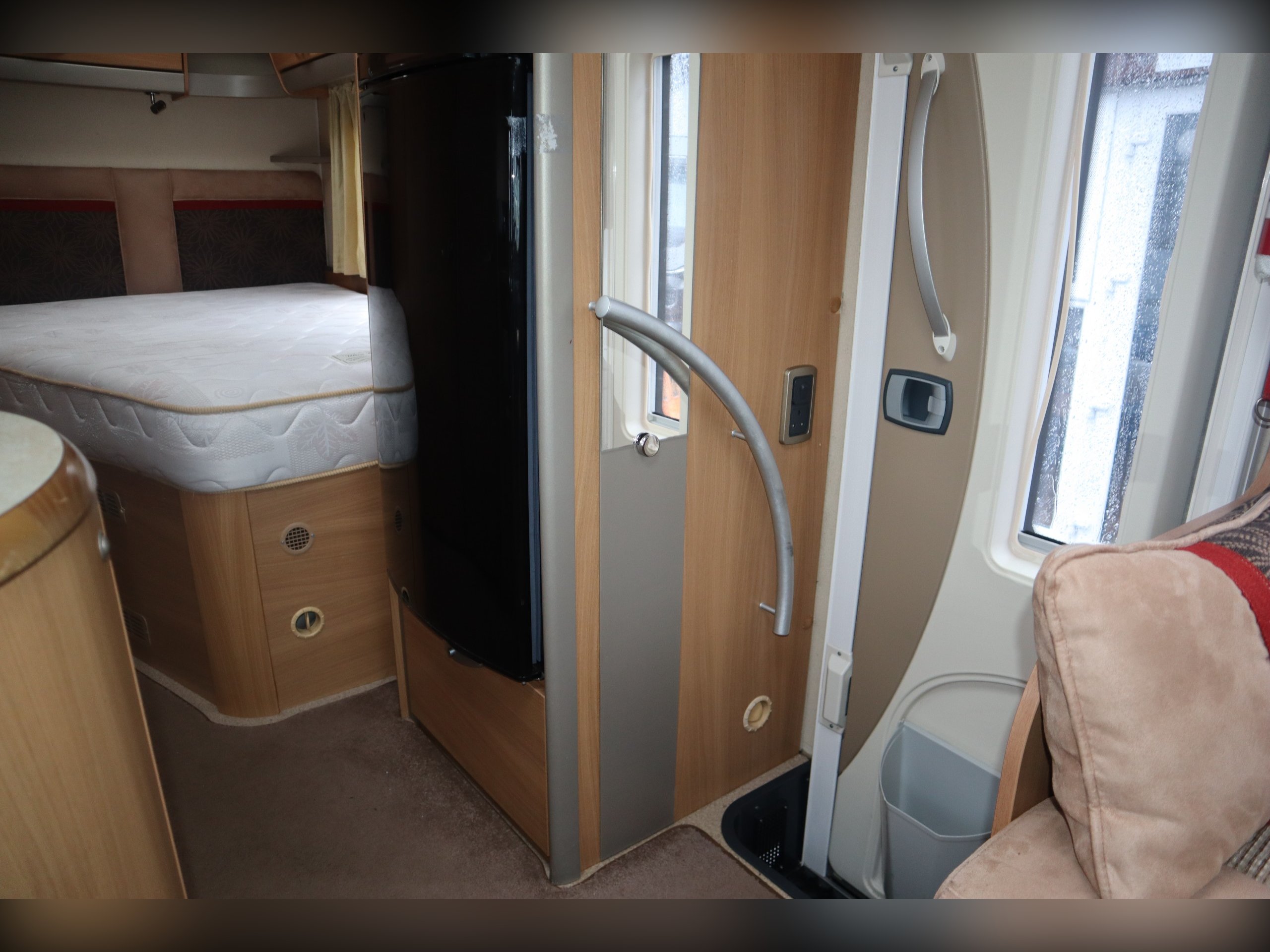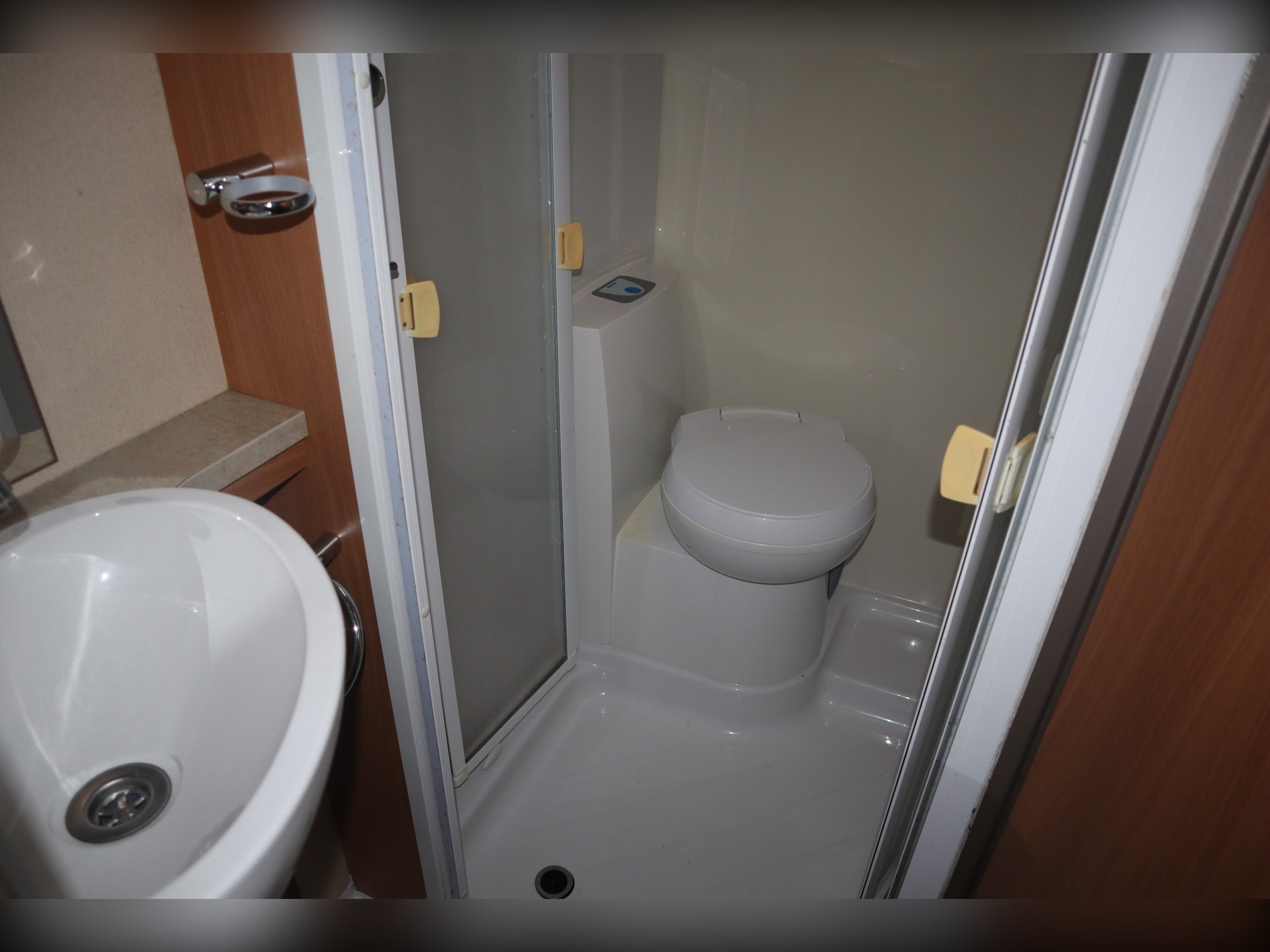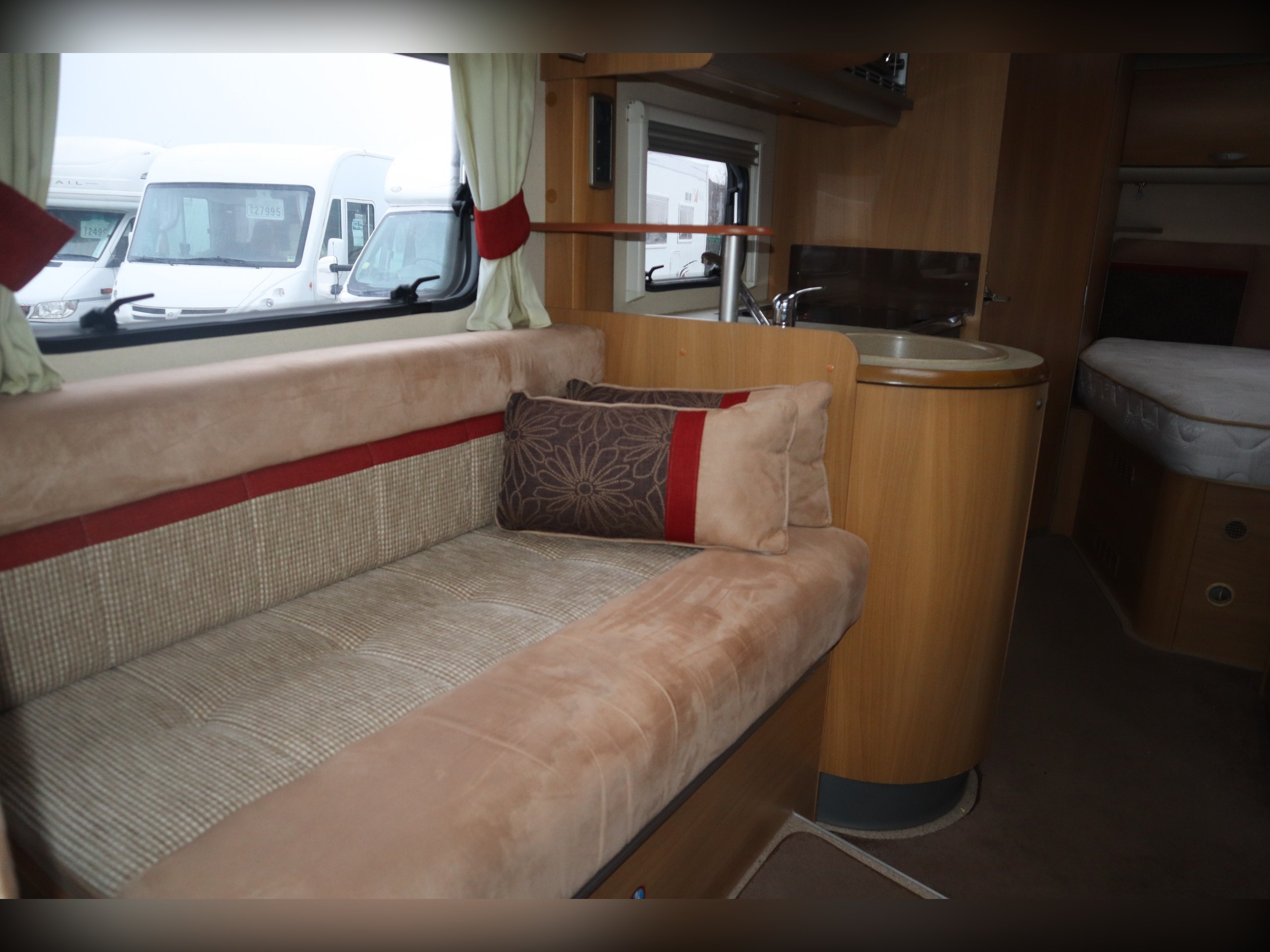 Swift Bolero 680 FB, 4 Berth, 2 Belts, Fixed rear Bed, Front seating that converts to a double bed, Side Kitchen, Rear side Bathroom with cassette toilet, wash basin and separate shower. Well equipped cab with Air Con, cruise control and reversing camera. Extras include Awning, bike rack and tow bar.