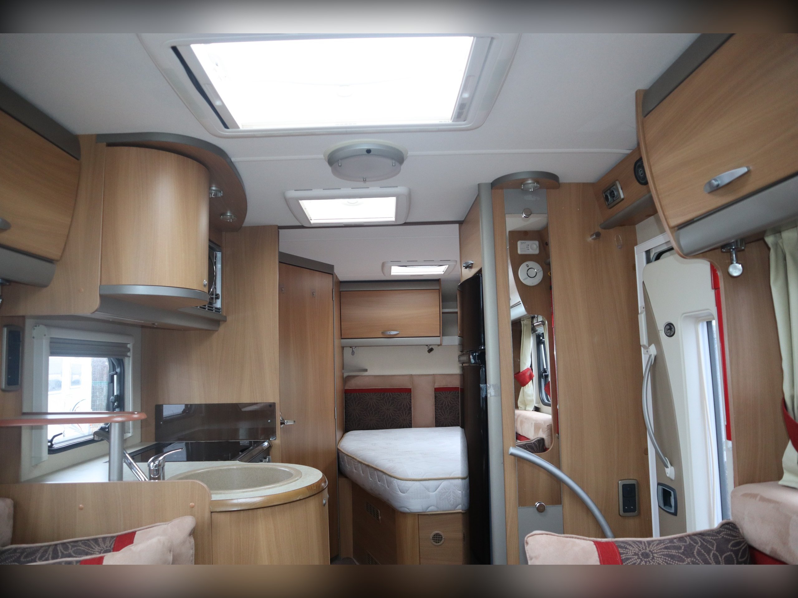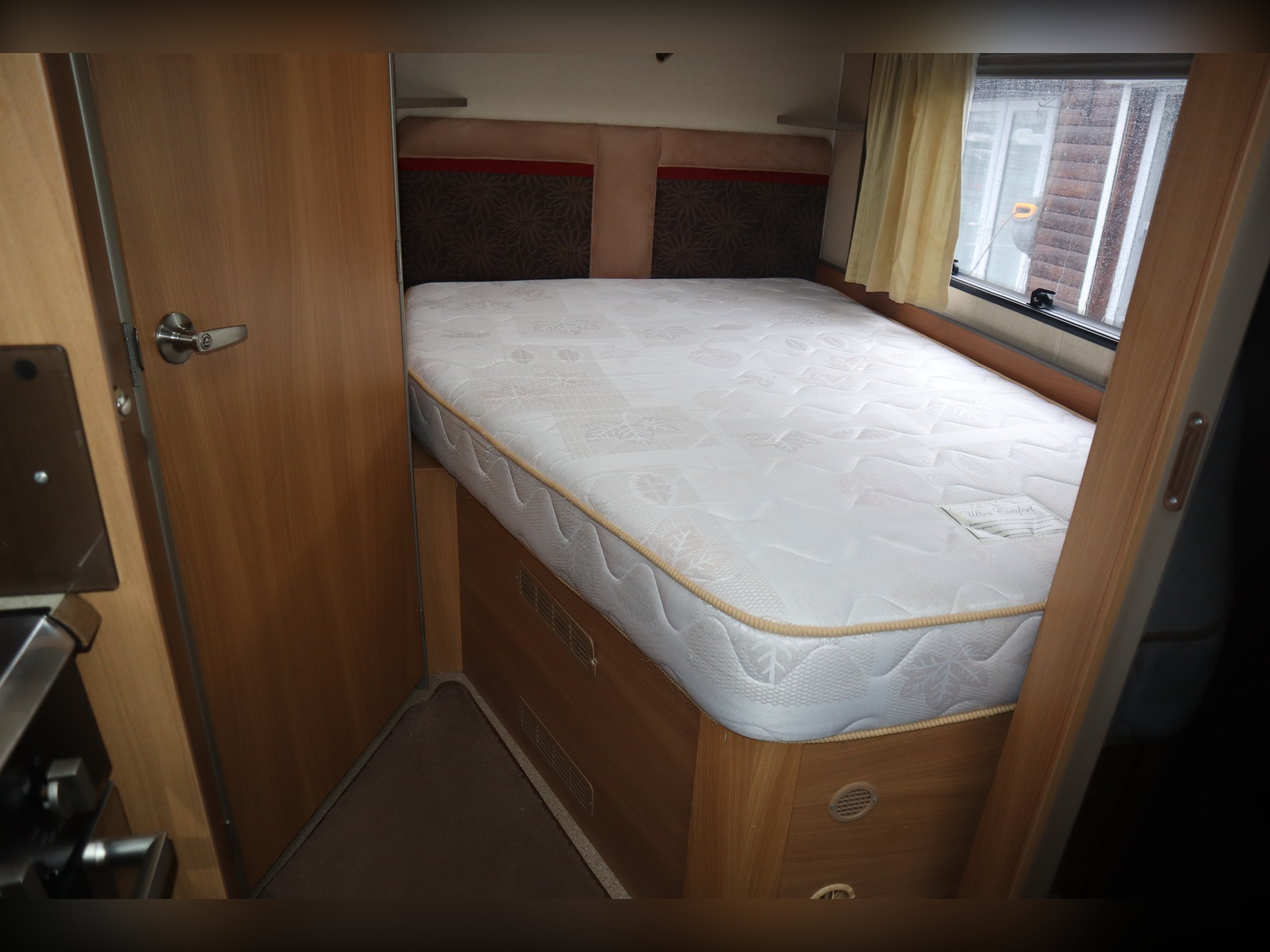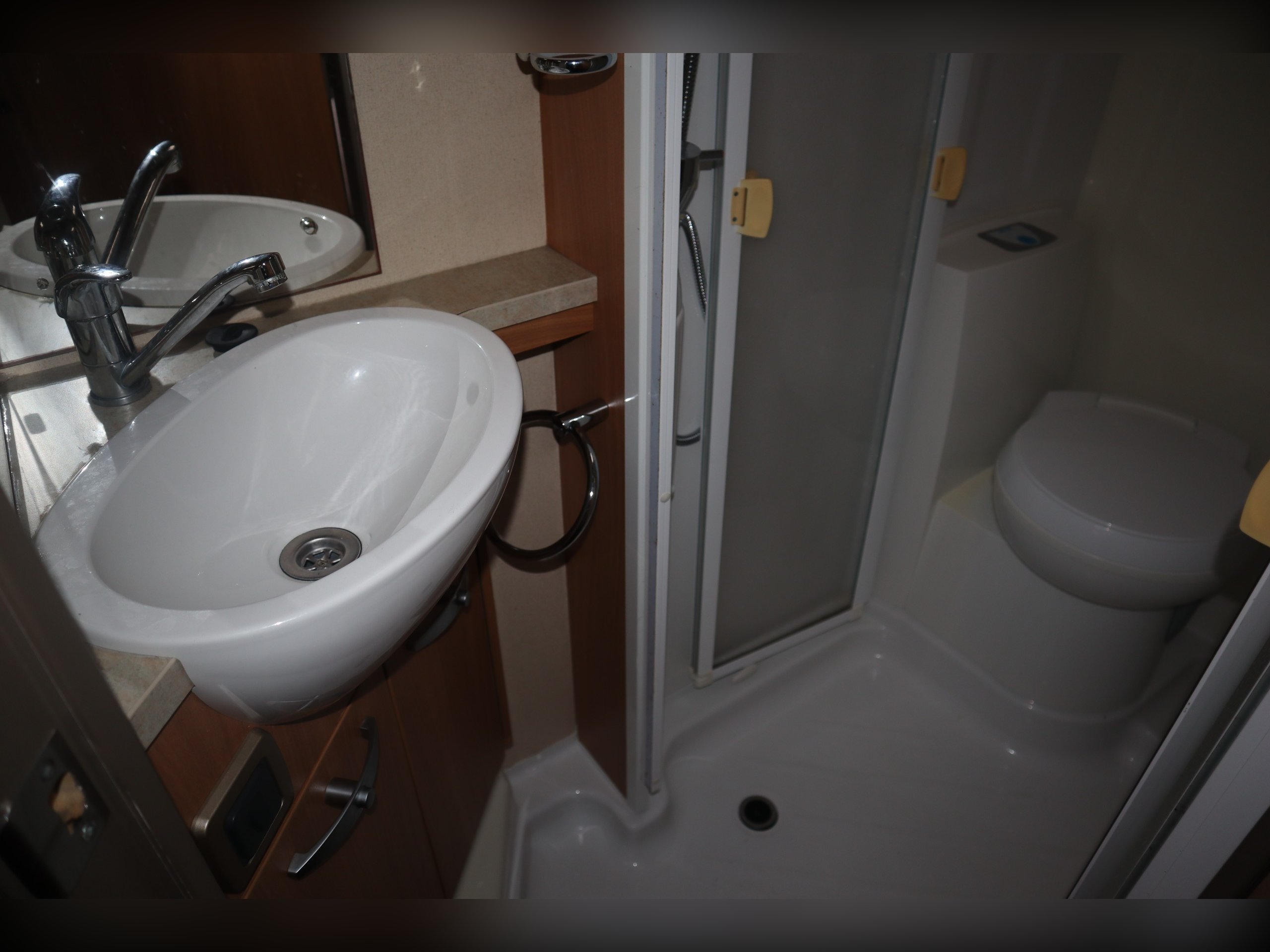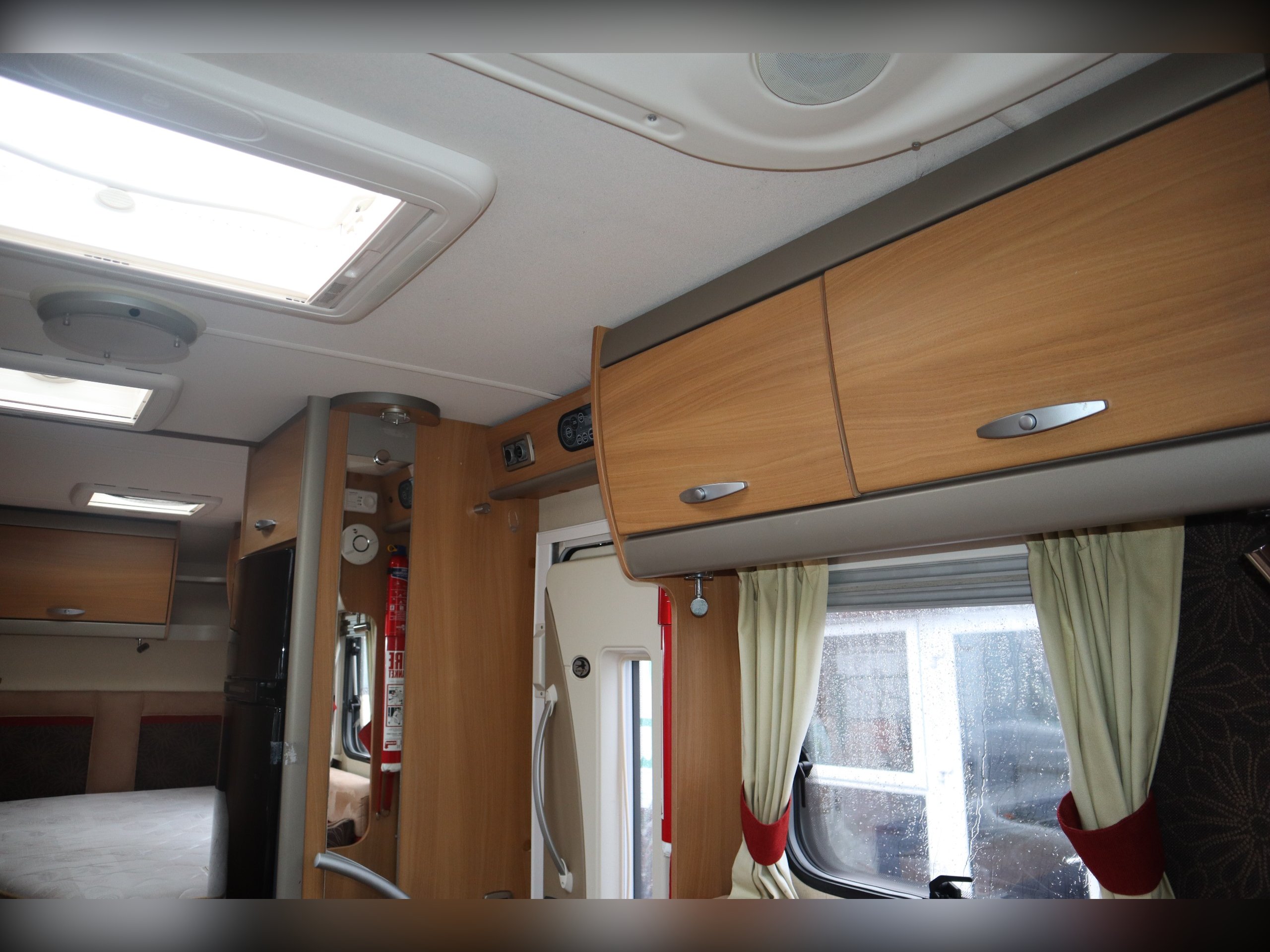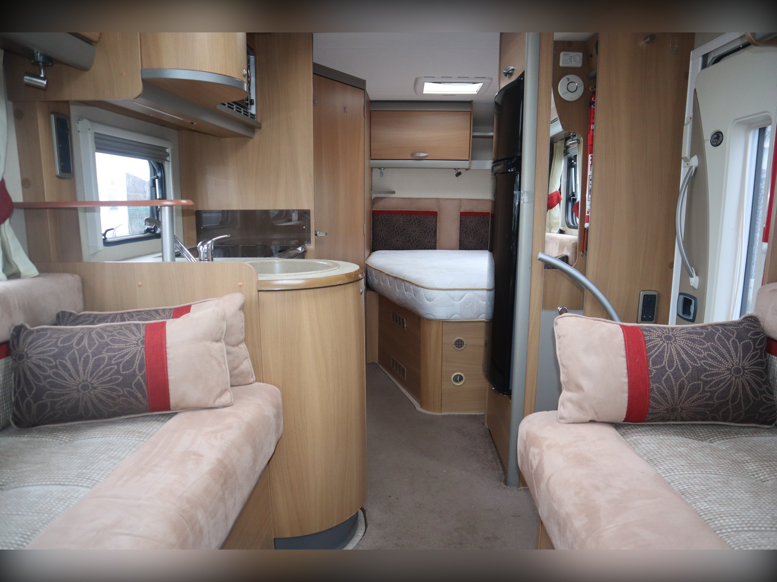 Swift Bolero 680 FB, 4 Berth, 2 Belts, Fixed rear Bed, Front seating that converts to a double bed, Side Kitchen, Rear side Bathroom with cassette toilet, wash basin and separate shower. Well equipped cab with Air Con, cruise control and reversing camera. Extras include Awning, bike rack and tow bar.