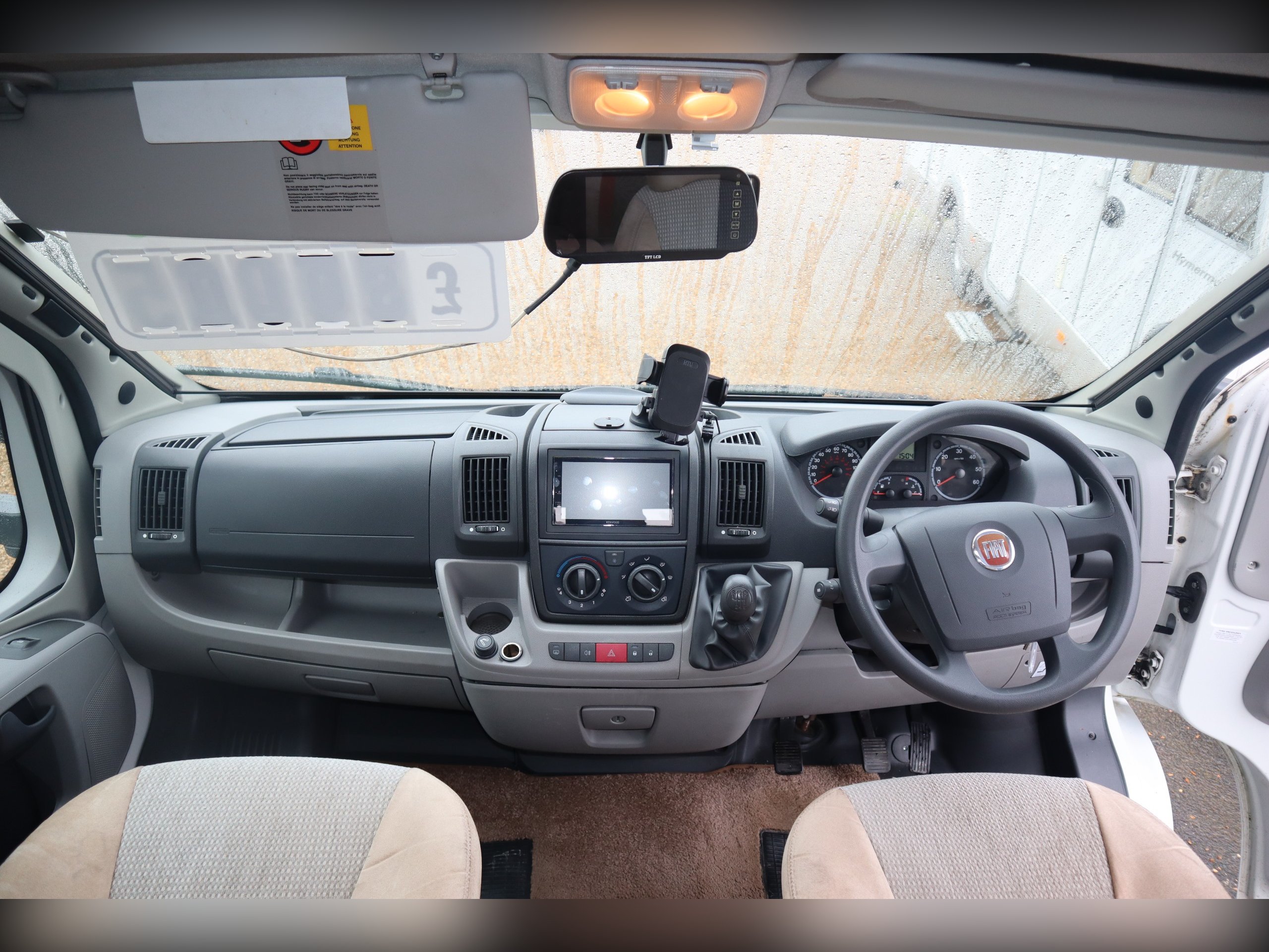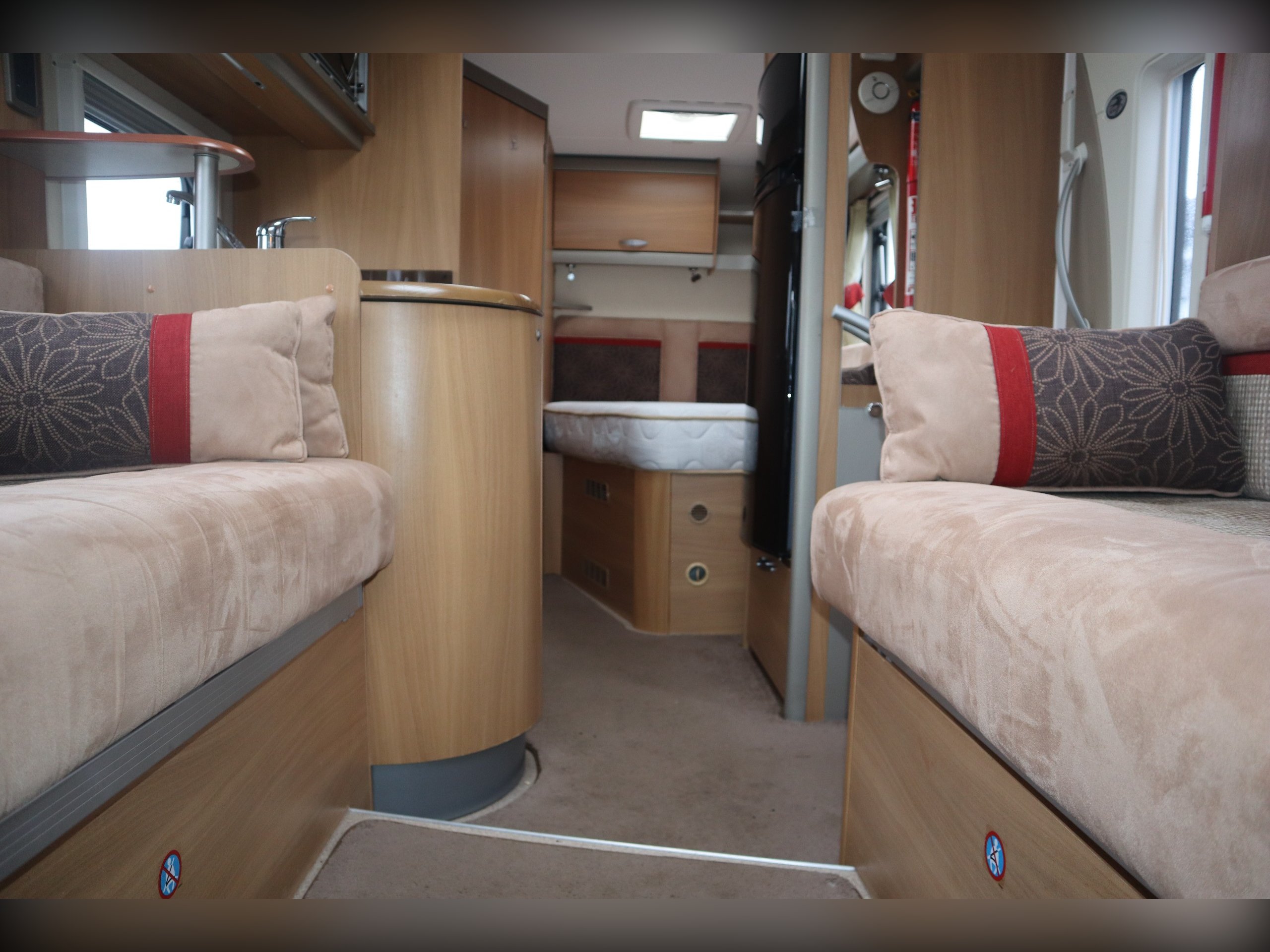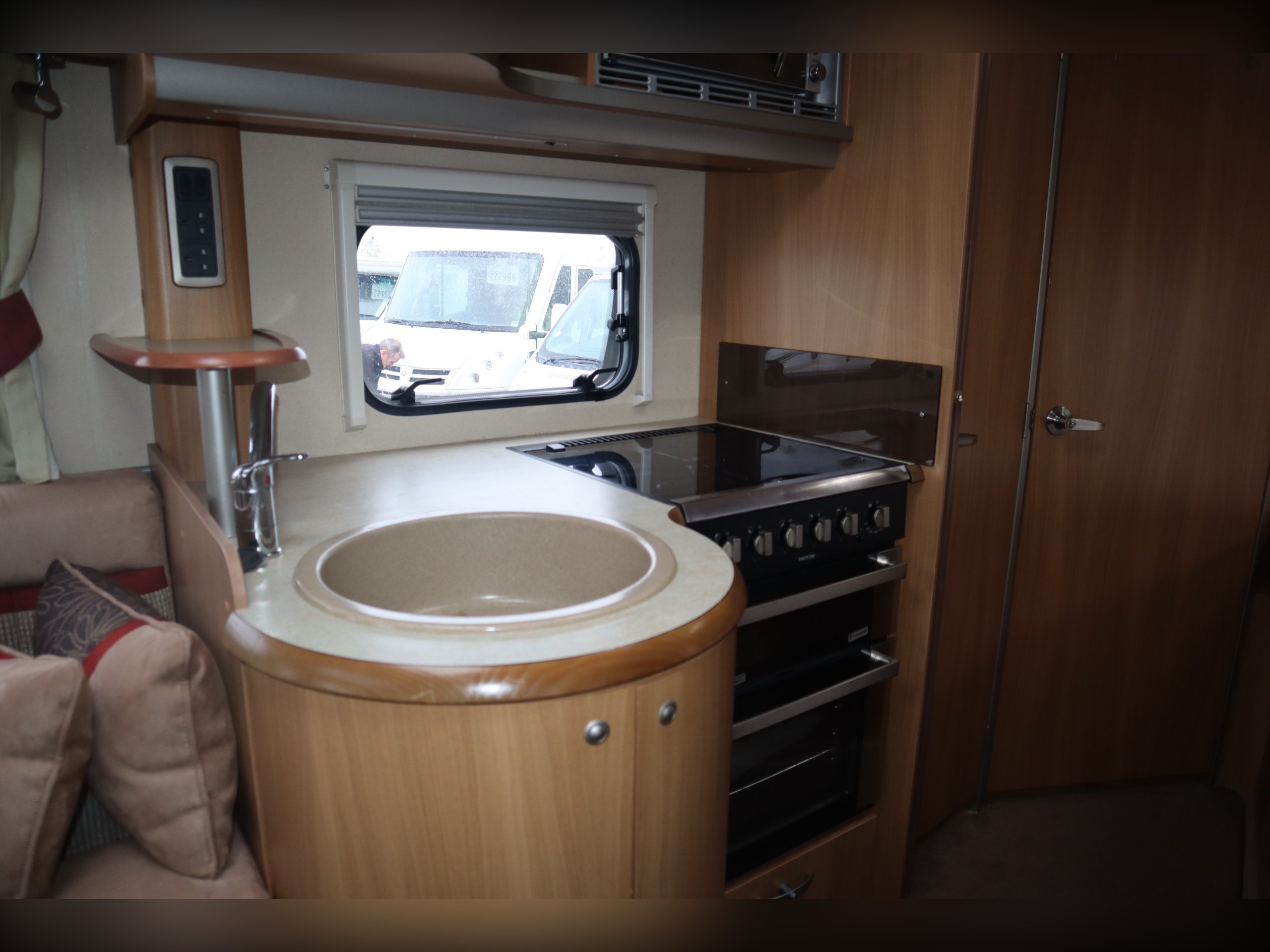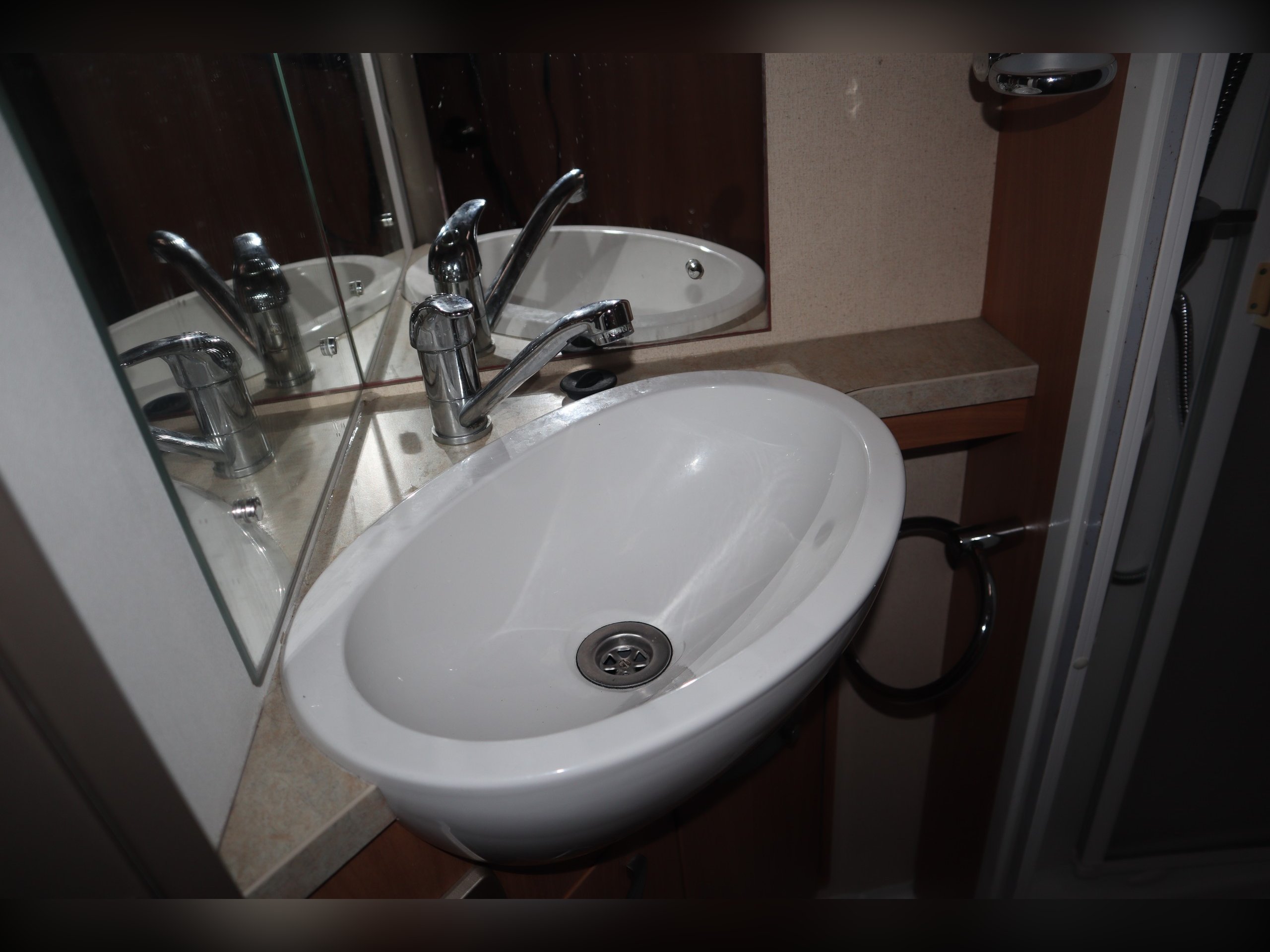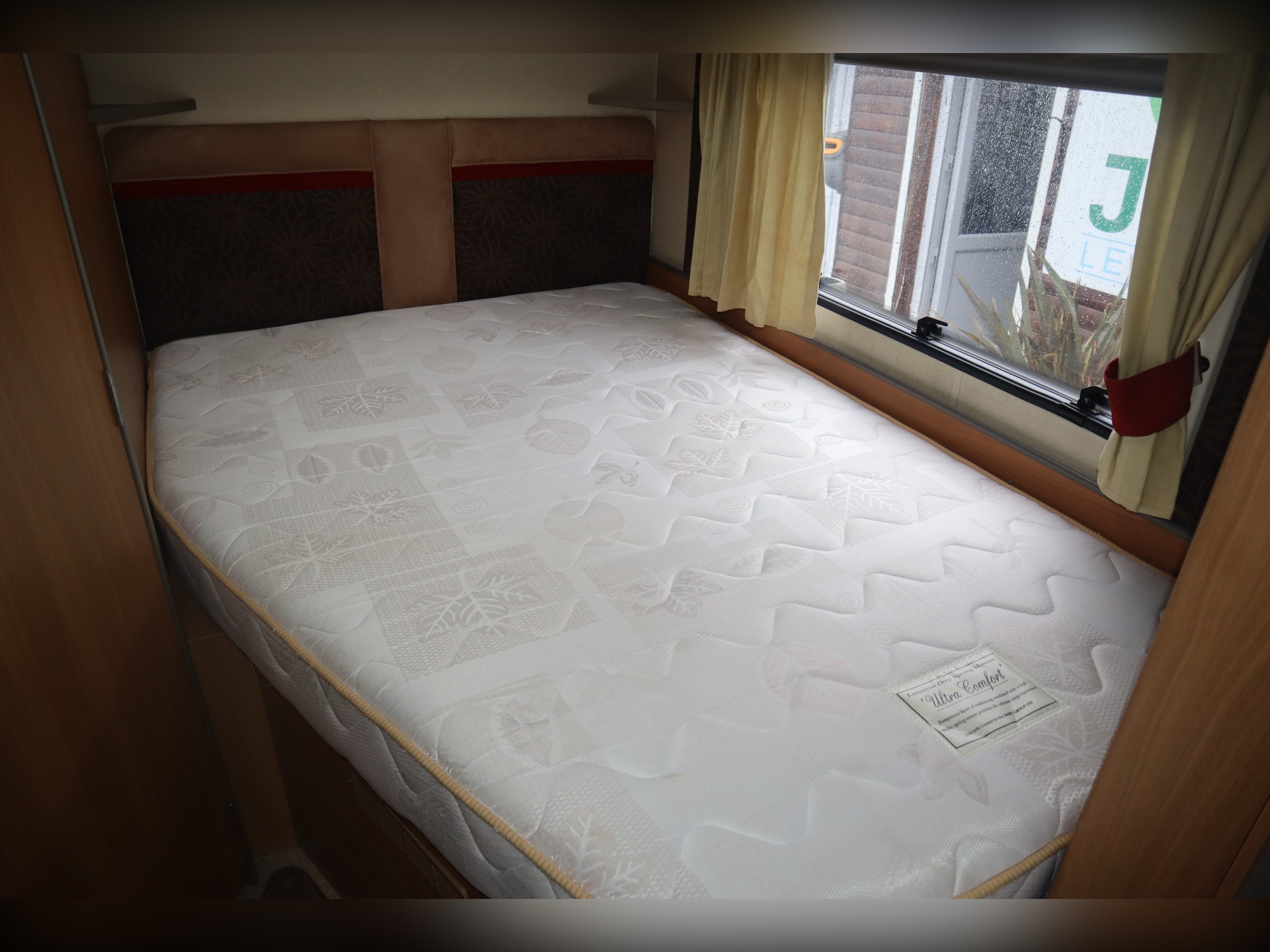 Swift Bolero 680 FB, 4 Berth, 2 Belts, Fixed rear Bed, Front seating that converts to a double bed, Side Kitchen, Rear side Bathroom with cassette toilet, wash basin and separate shower. Well equipped cab with Air Con, cruise control and reversing camera. Extras include Awning, bike rack and tow bar.