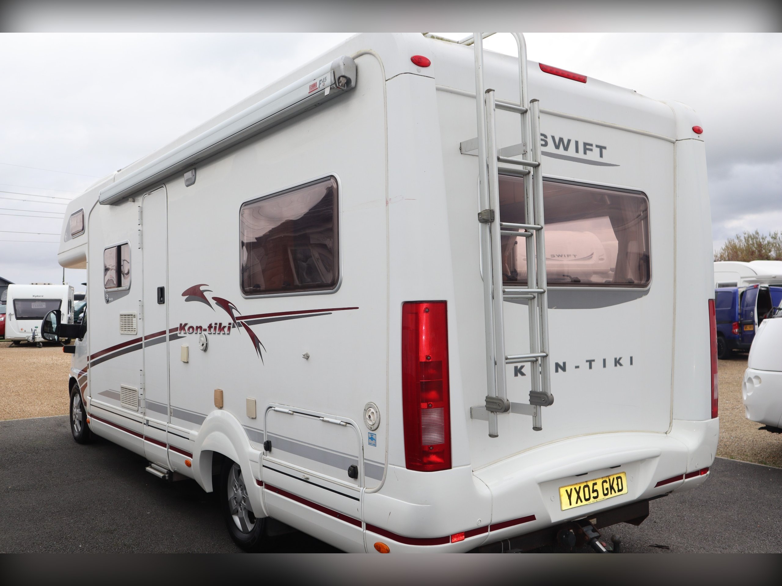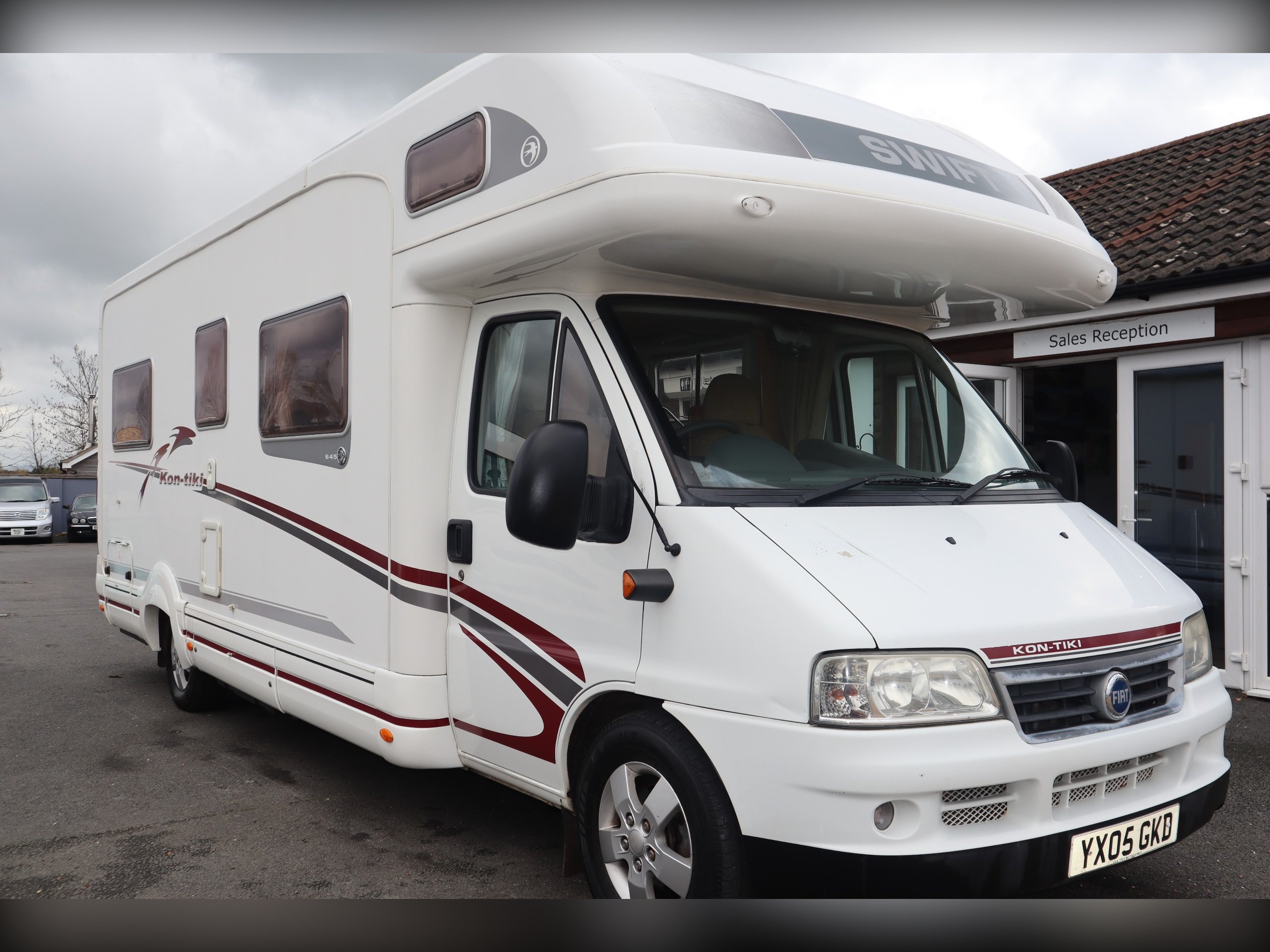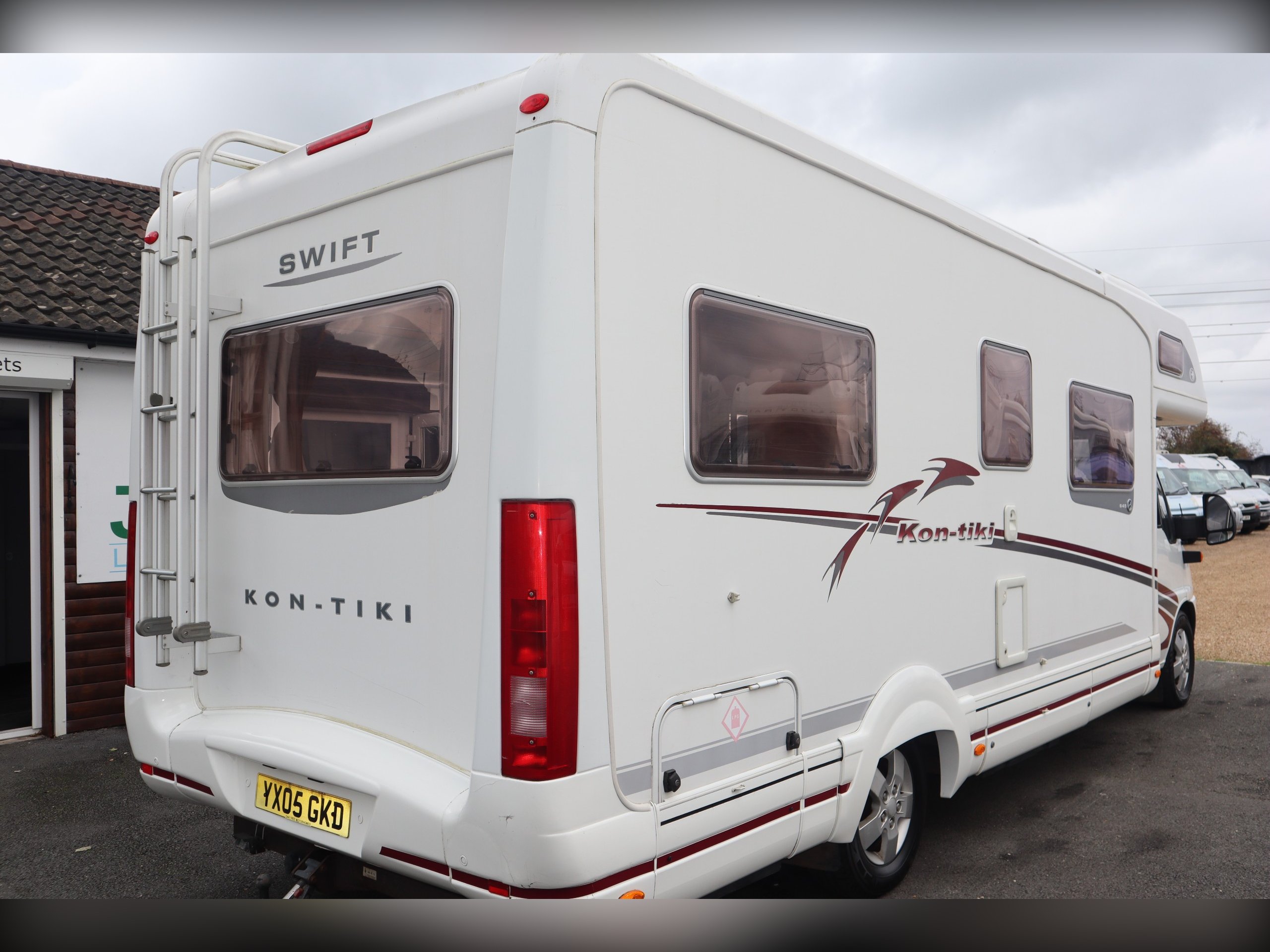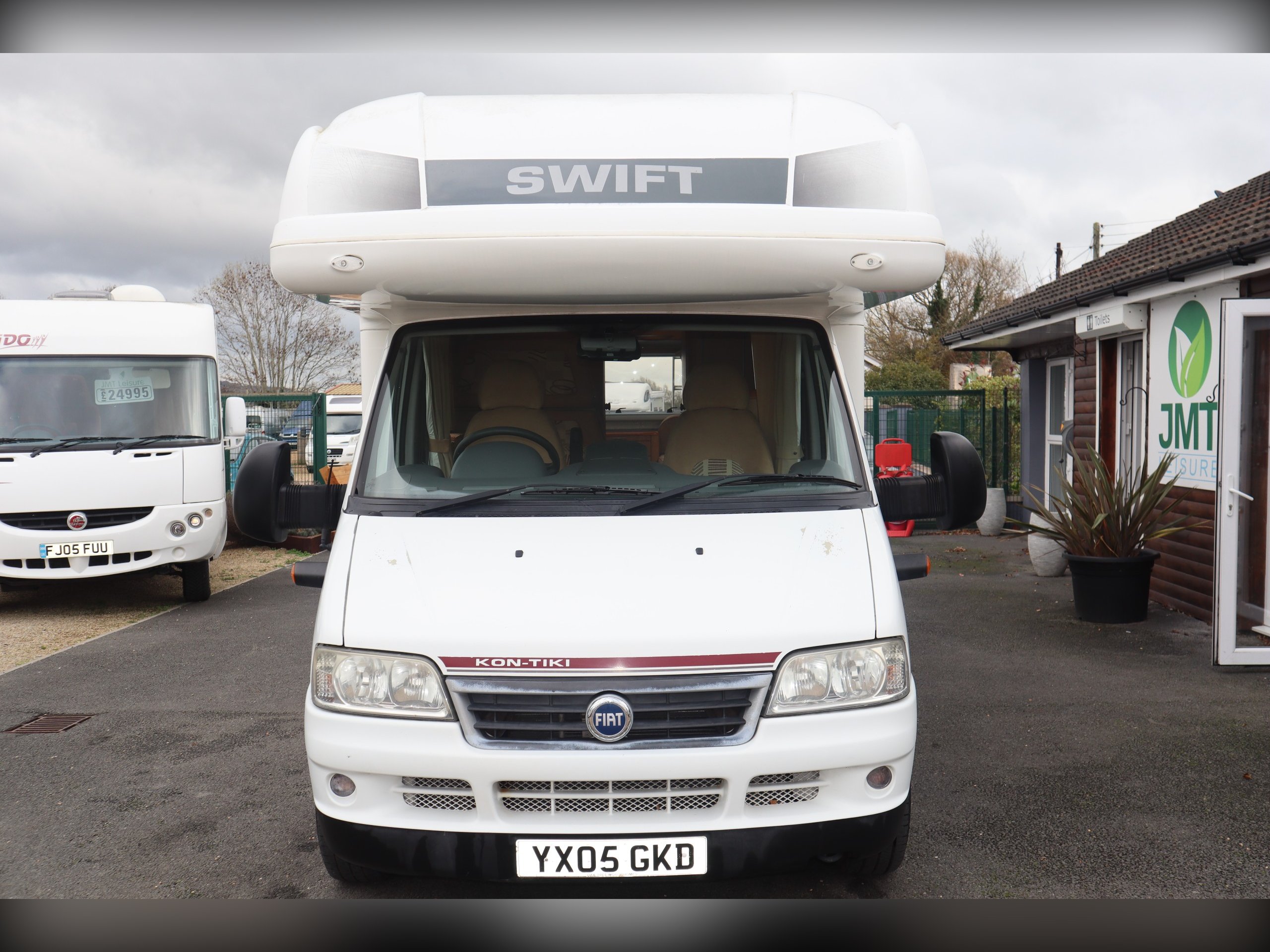 Swift Kon Tiki 645, 6 Berth, 4 Seatbelts, 3500kg, Sat Nav, Reversing Camera, Cab AC, Alloy Wheels, Rear Lounge, Over cab Bed, Front dinette with 2 additional belts, side well quipped kitchen, mid bathroom with cassette toilet, separate shower, sink and vanity unit. Extras include a tow bar, awning and alloy wheels. Lovey condition with low miles.