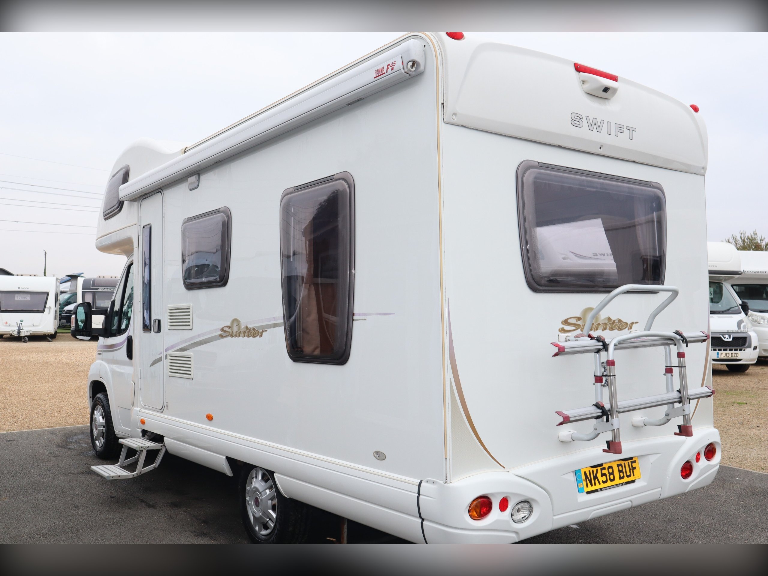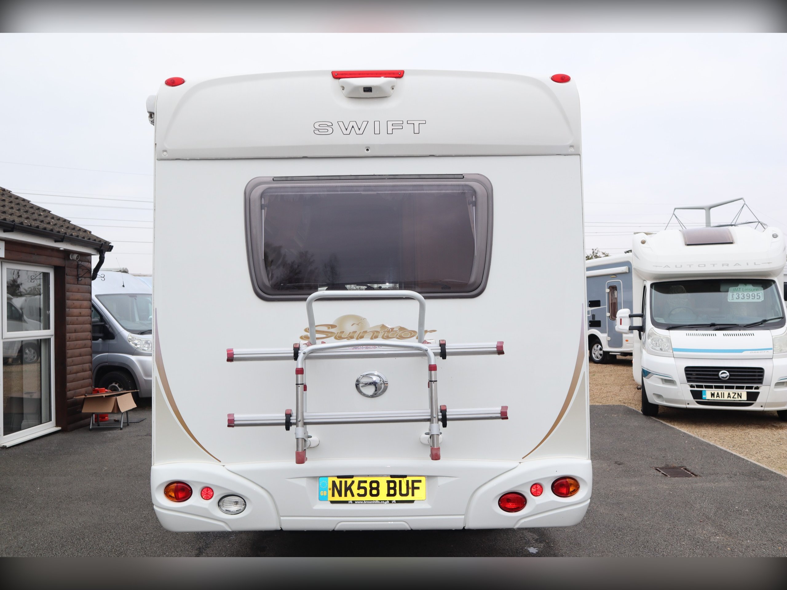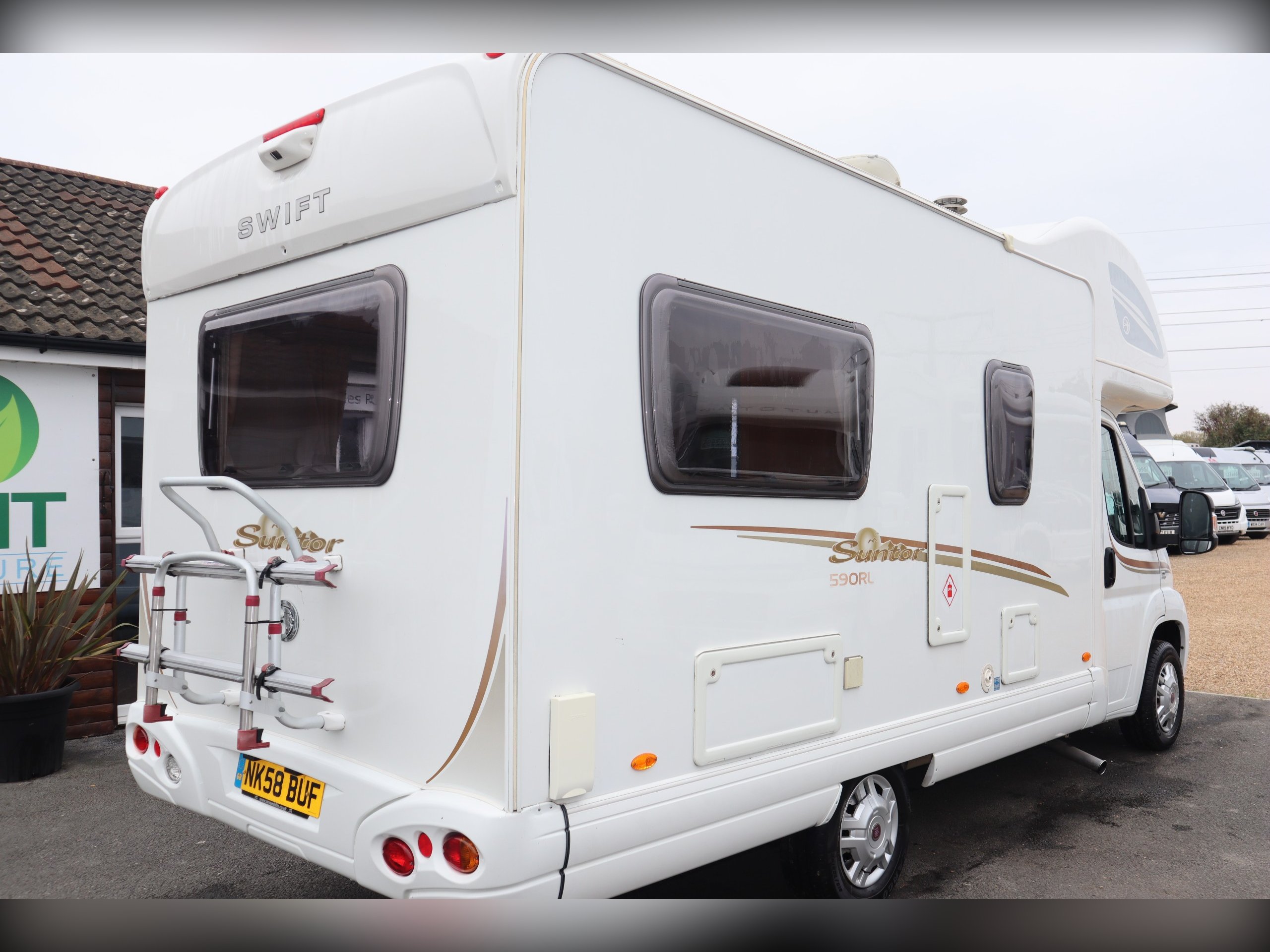 Swift Suntor 590 RL,4 berth, 2 belts, rear lounge, overcab bed. Mid kitchen with oven, hob, grill, sink and fridge freezer. side bathroom with cassette toilet, shower and wash basin. Extras include a bike rack and awning. Popular layout Motorhome with very low mileage.