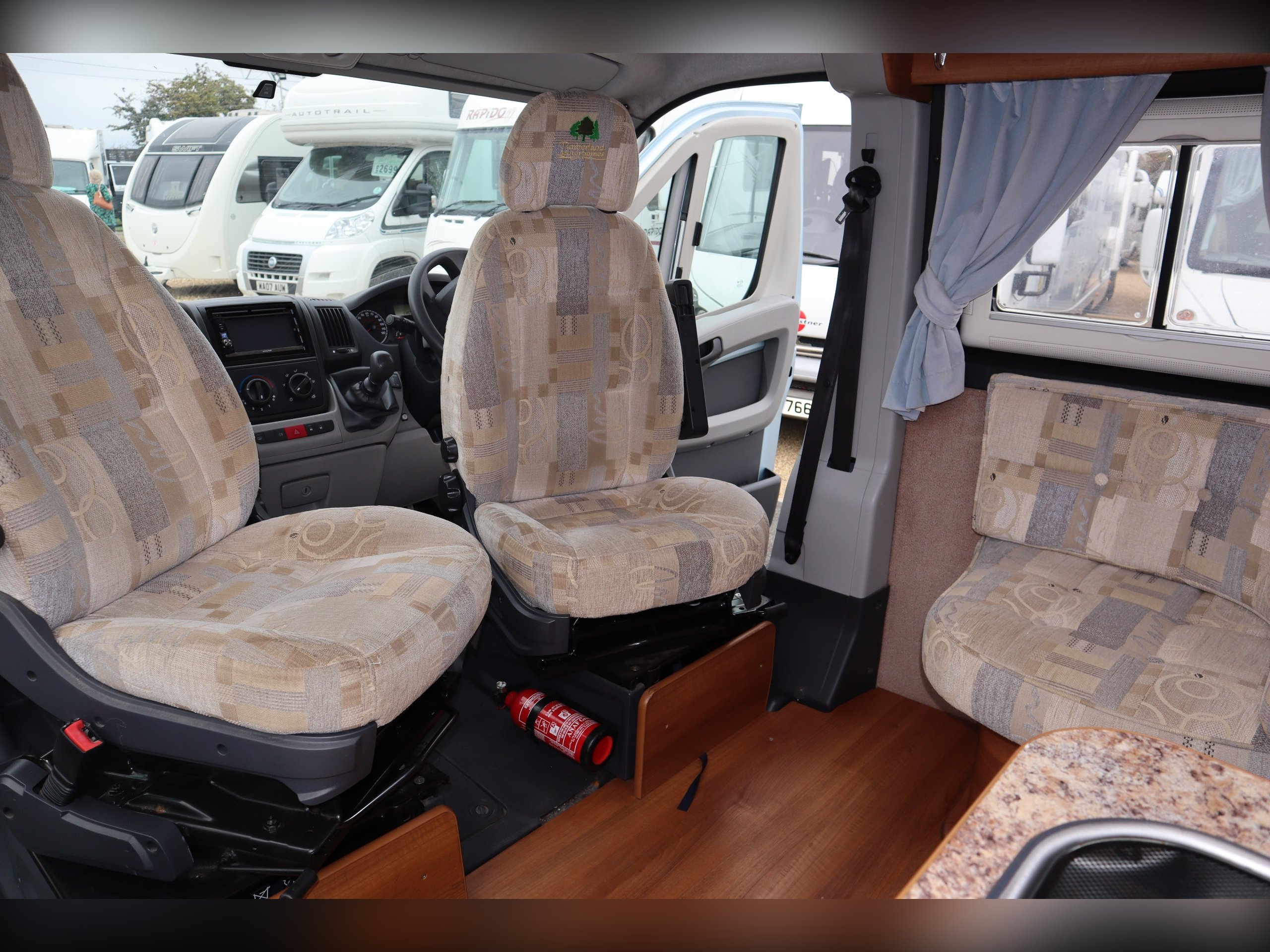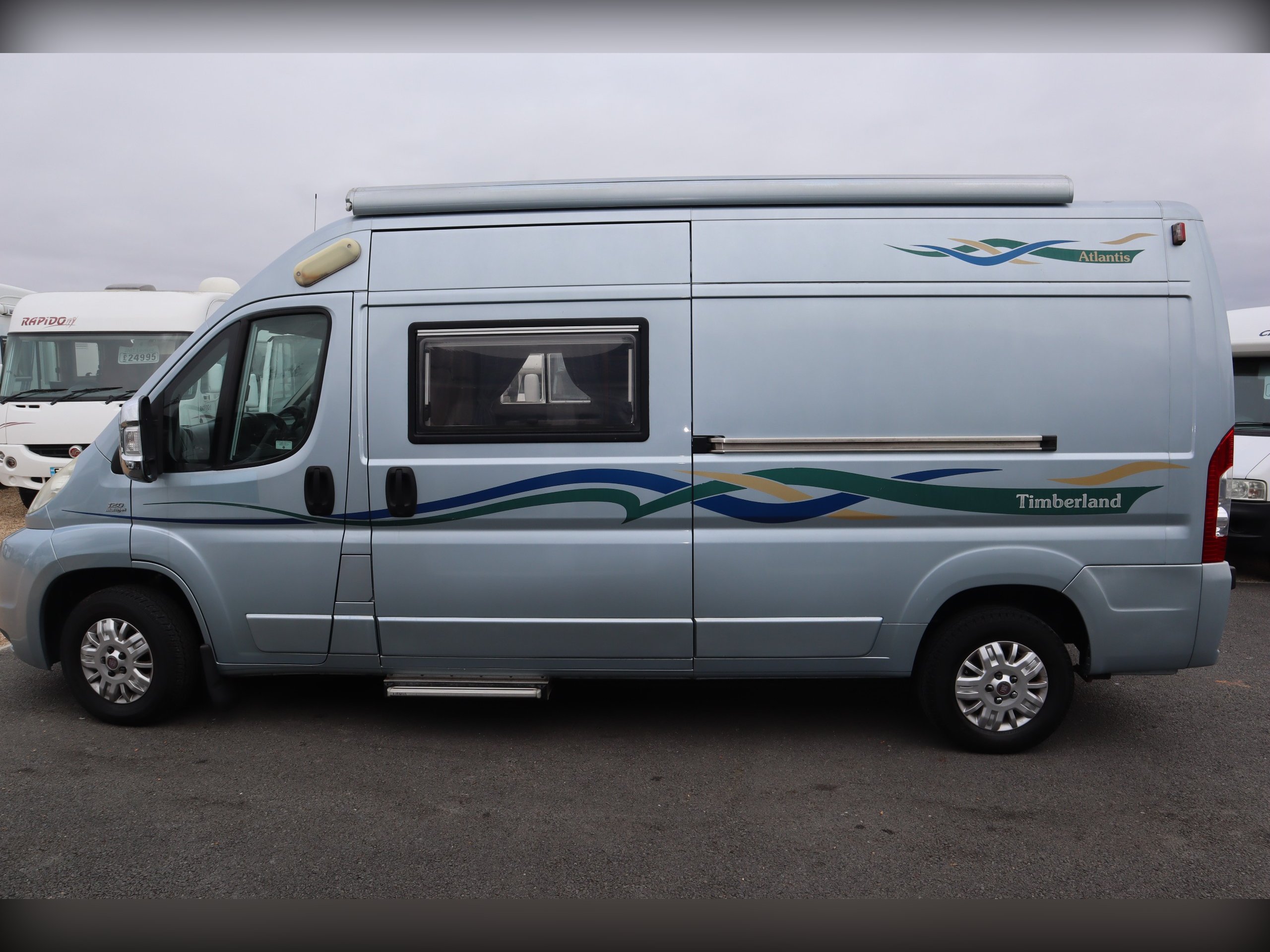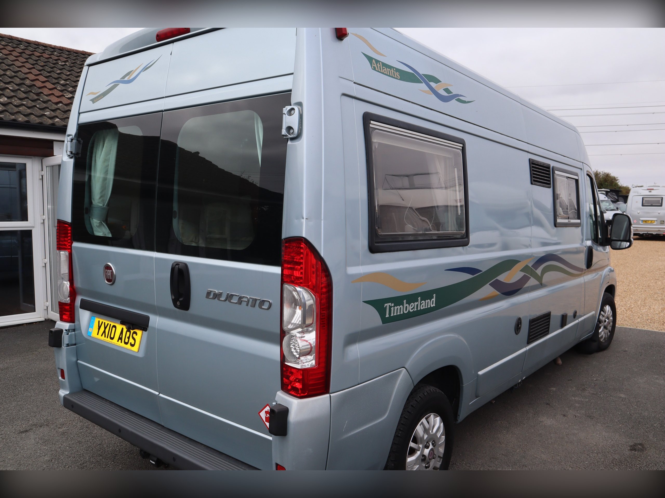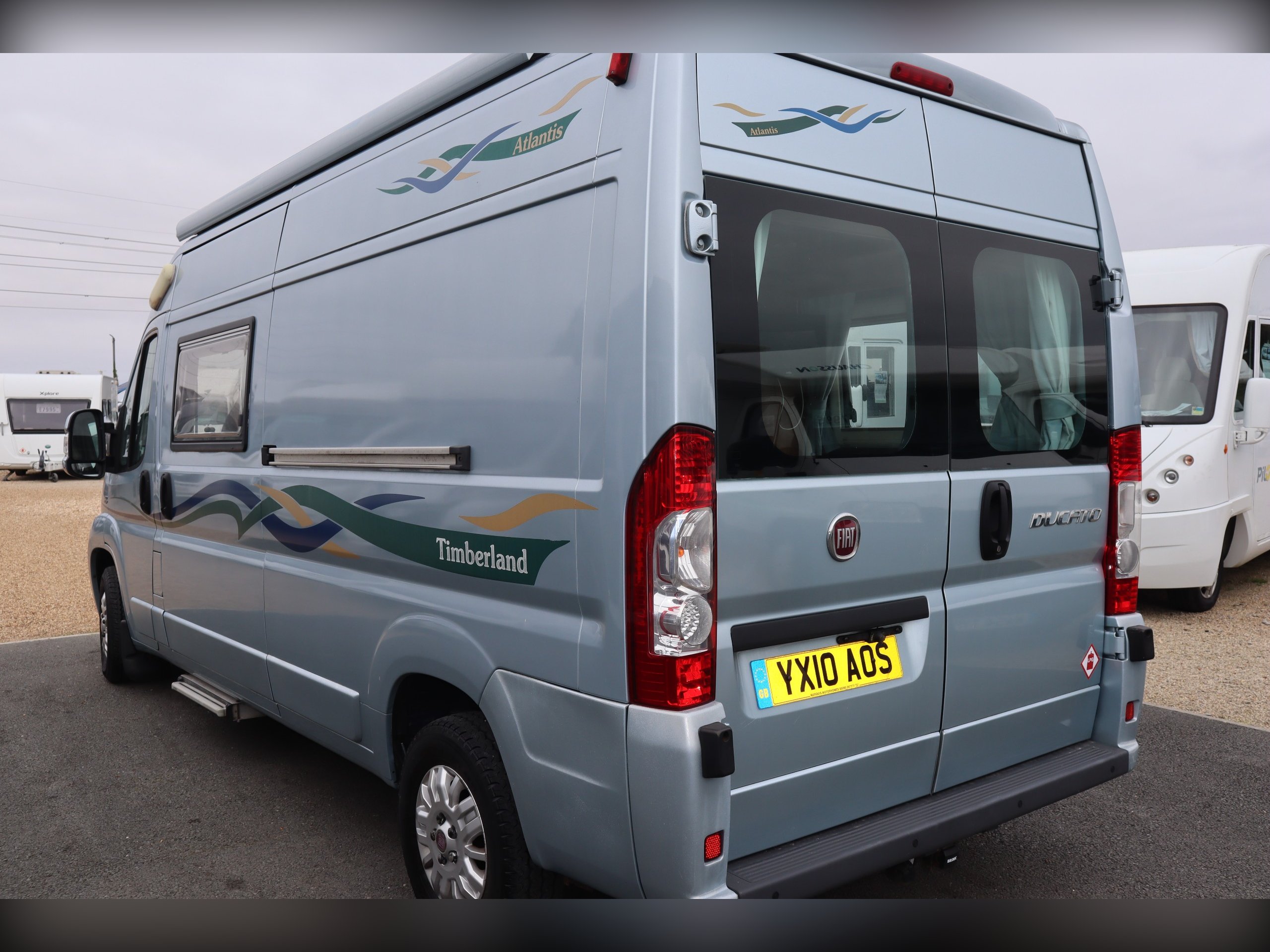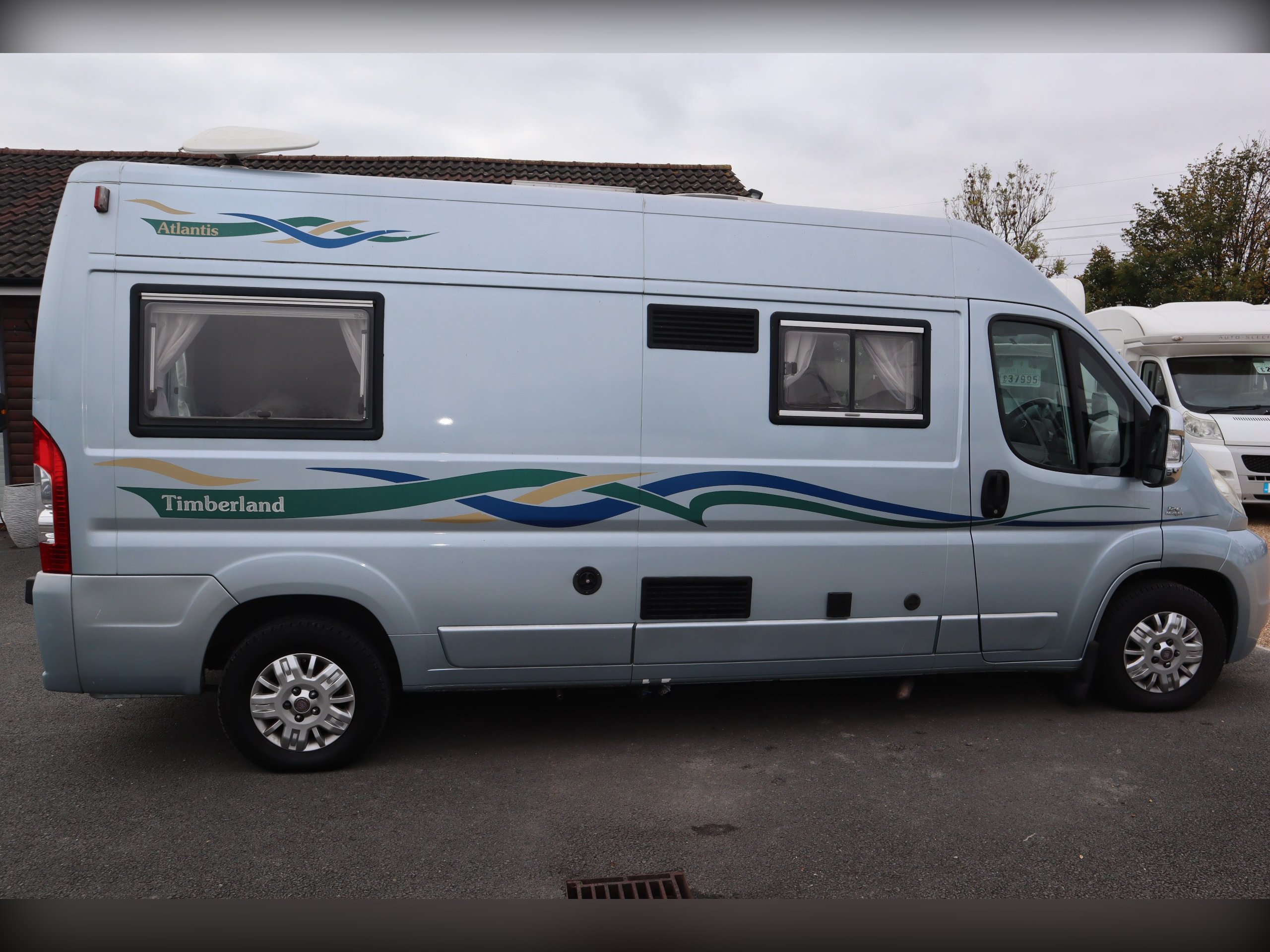 Timberland Atlantis, 2 Berth, 2 Belts, Awning. Large rear double bed that can be raised for additional storage. Mid centre bathroom with shower, cassette toilet basin and vanity unit. Front lounge area that incorporates the swivel captains seats. Mid kitchen with fridge freezer, hob, sink and combi oven. Fiat Ducato cab with electric windows and mirrors. Exceptional Timberland quality with versatile living accommodation.