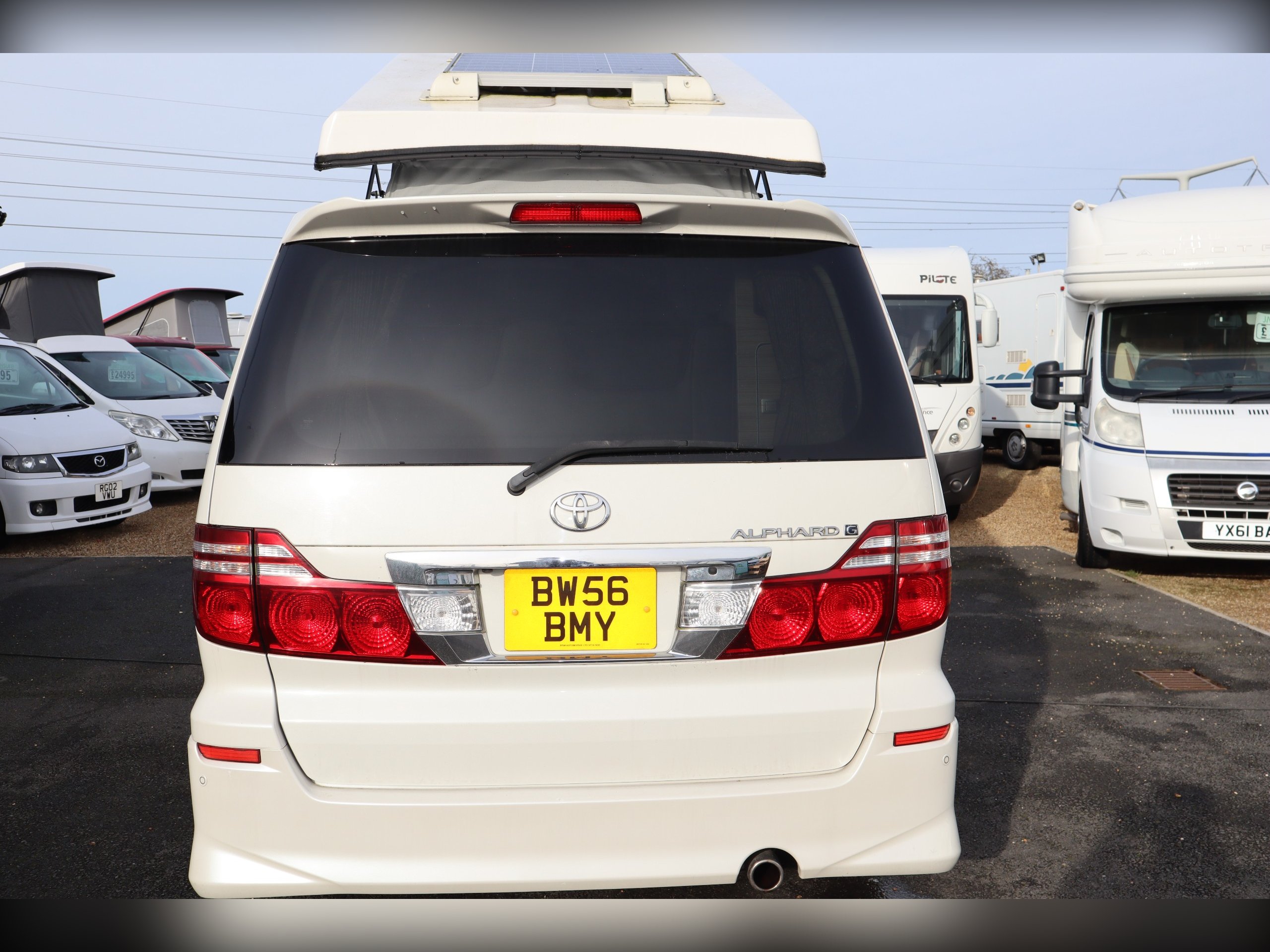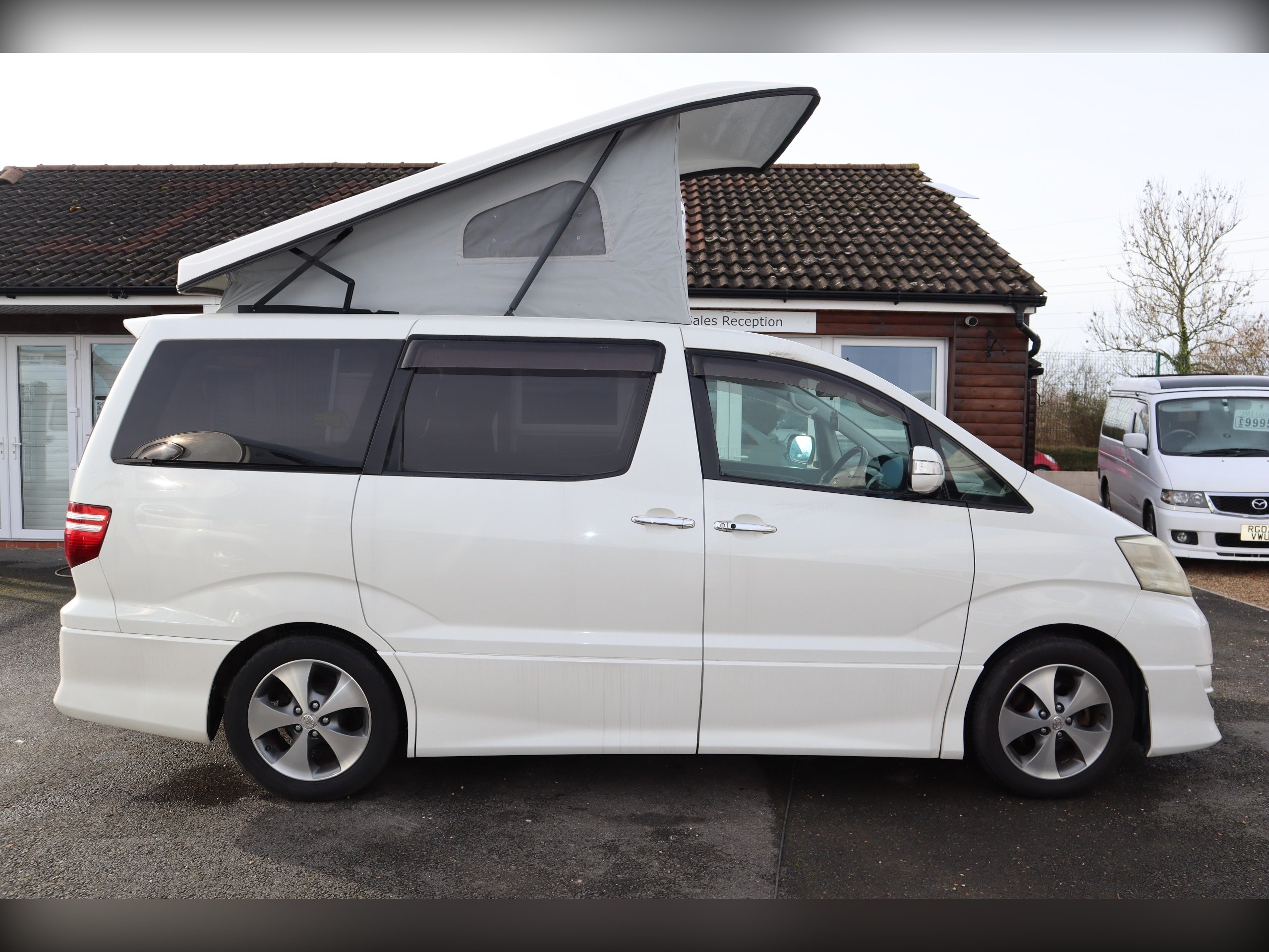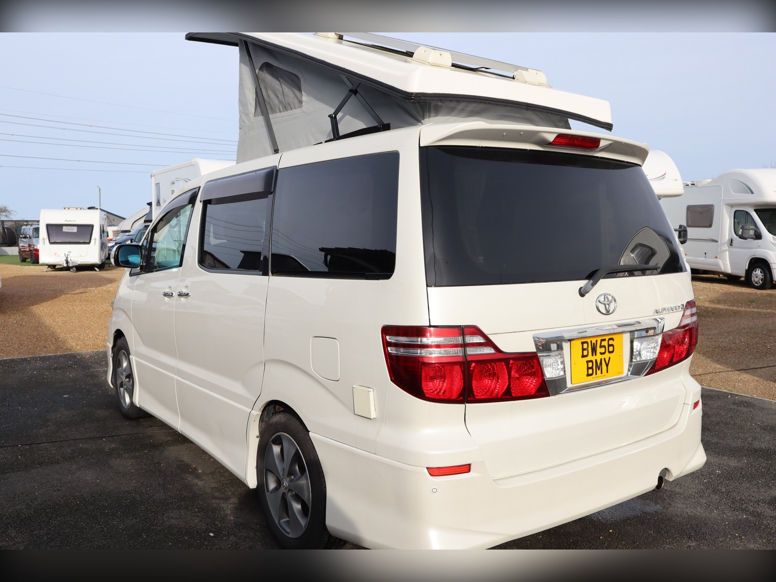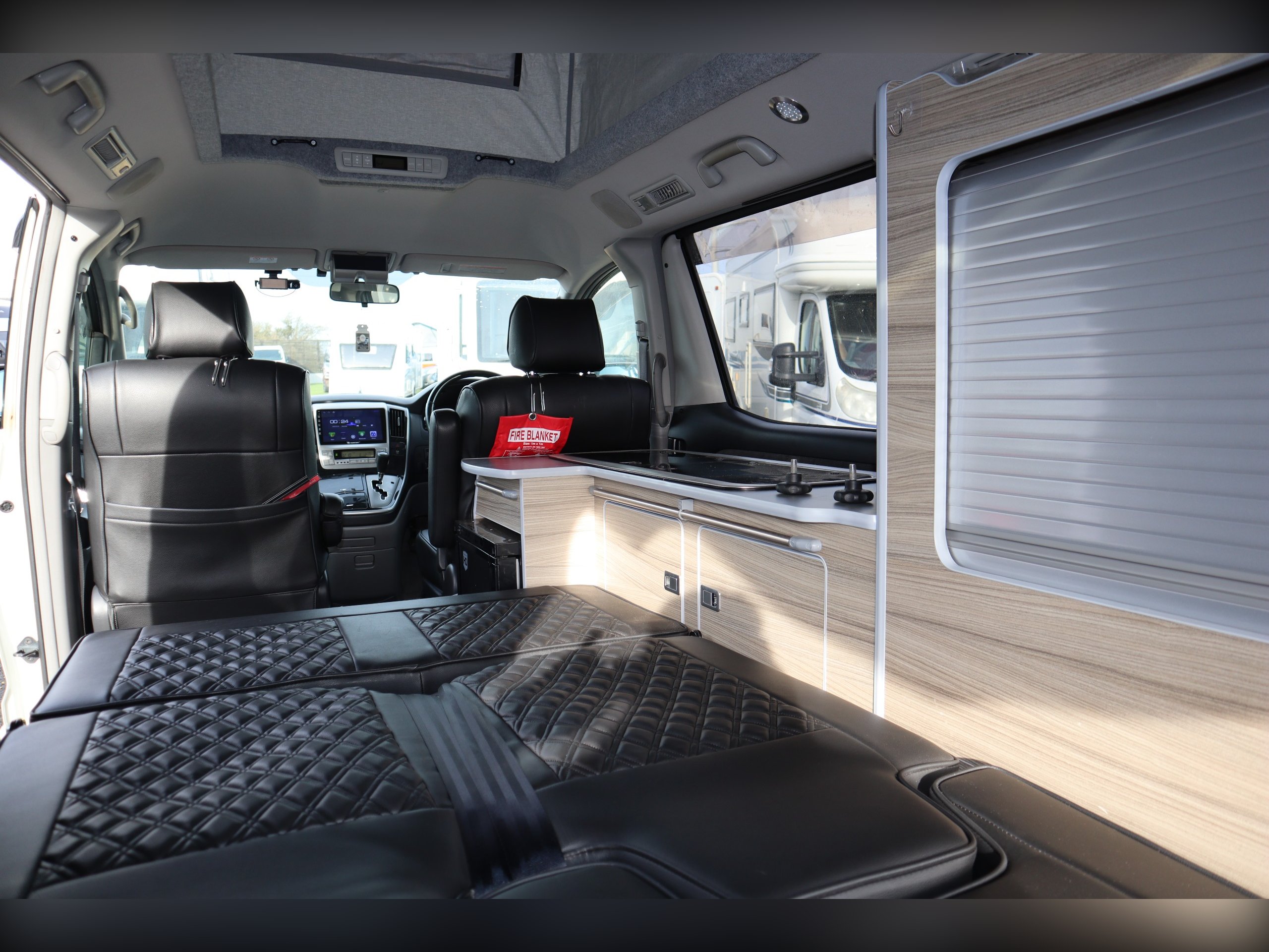 Toyota Alphard G, 4 Berth, 4 Belts, Automatic, Alloy Wheels, Solar Panel, Hob, Sink & Fridge. Rock n Roll Bed, Cab Air Con, UK Stereo. Superb camper example of the luxurious Toyota Alphard. 102500 km (63630 Miles)
