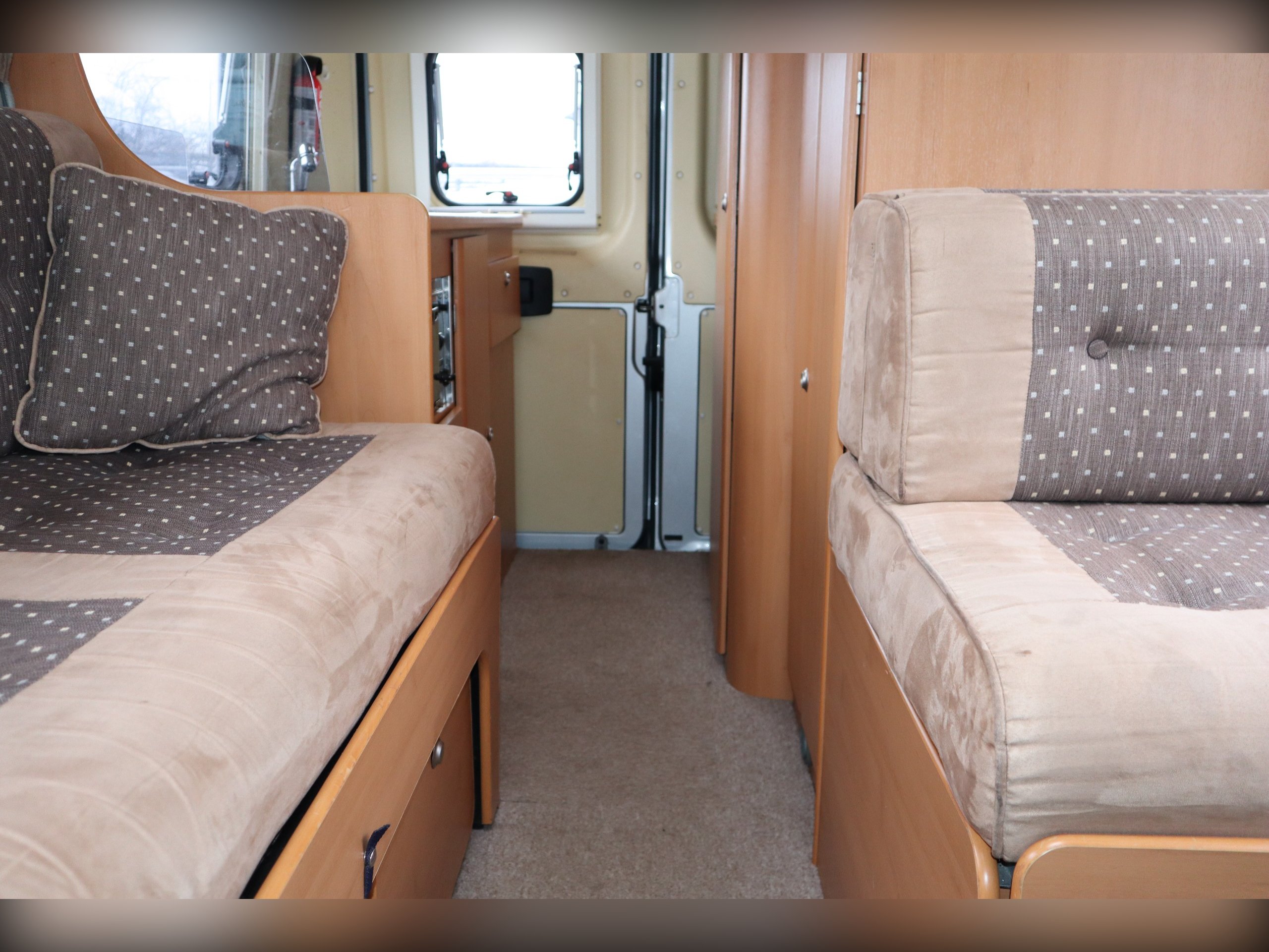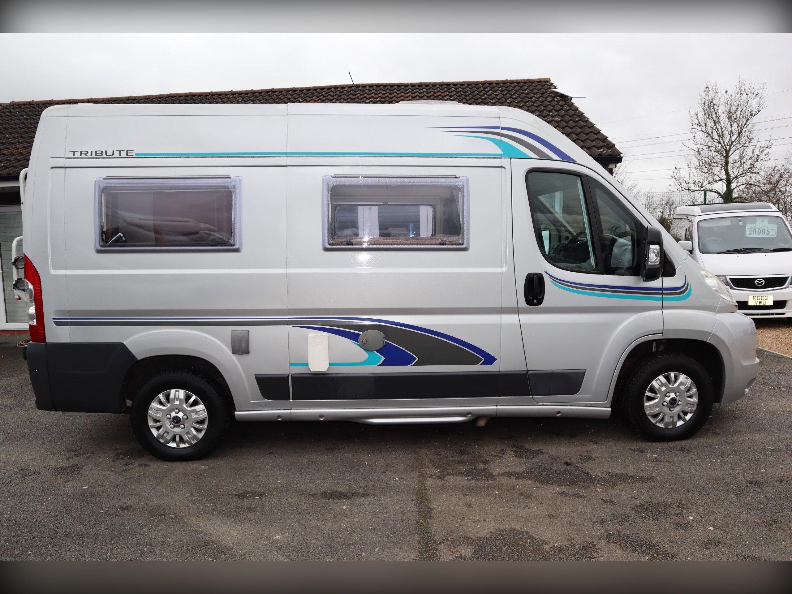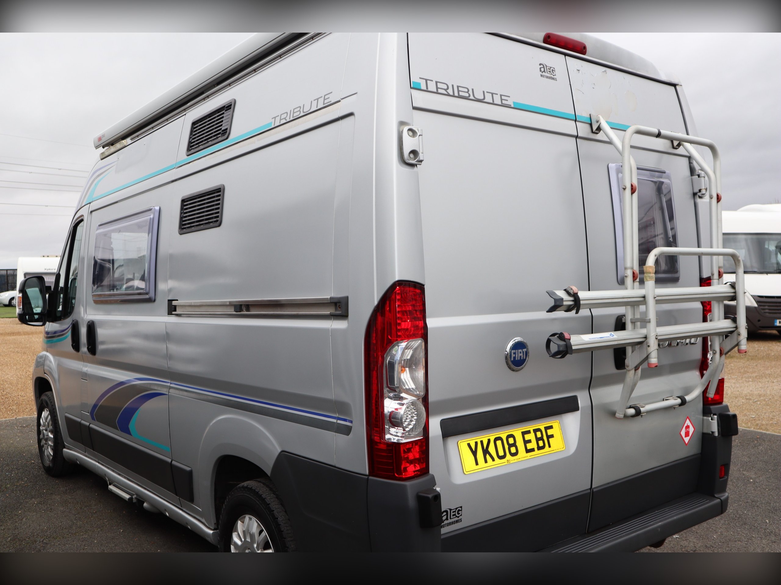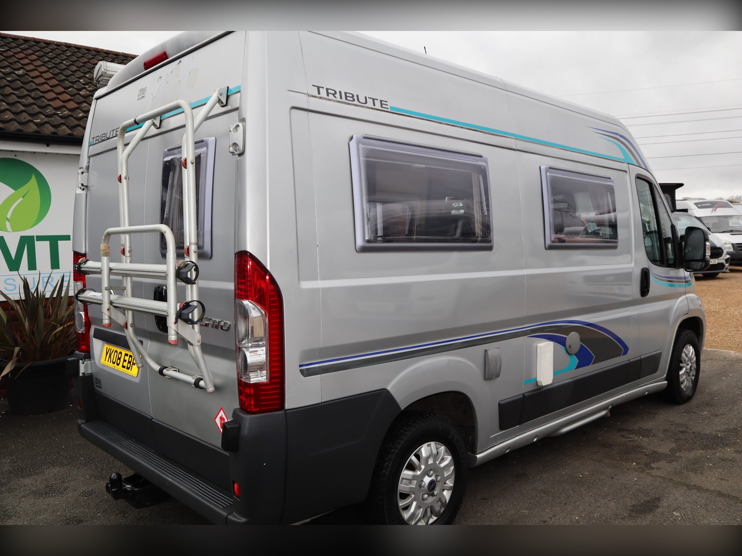 Trigano Tribute 550, 2 Berth, 3 Belts, Rear Side Kitchen, Bathroom Opposite, Front lounge area that can be made up to make 2 single or 1 double bed. Extras include Tow Bar, Awning, Bike rack, Alloy Wheels and Solar Panel.