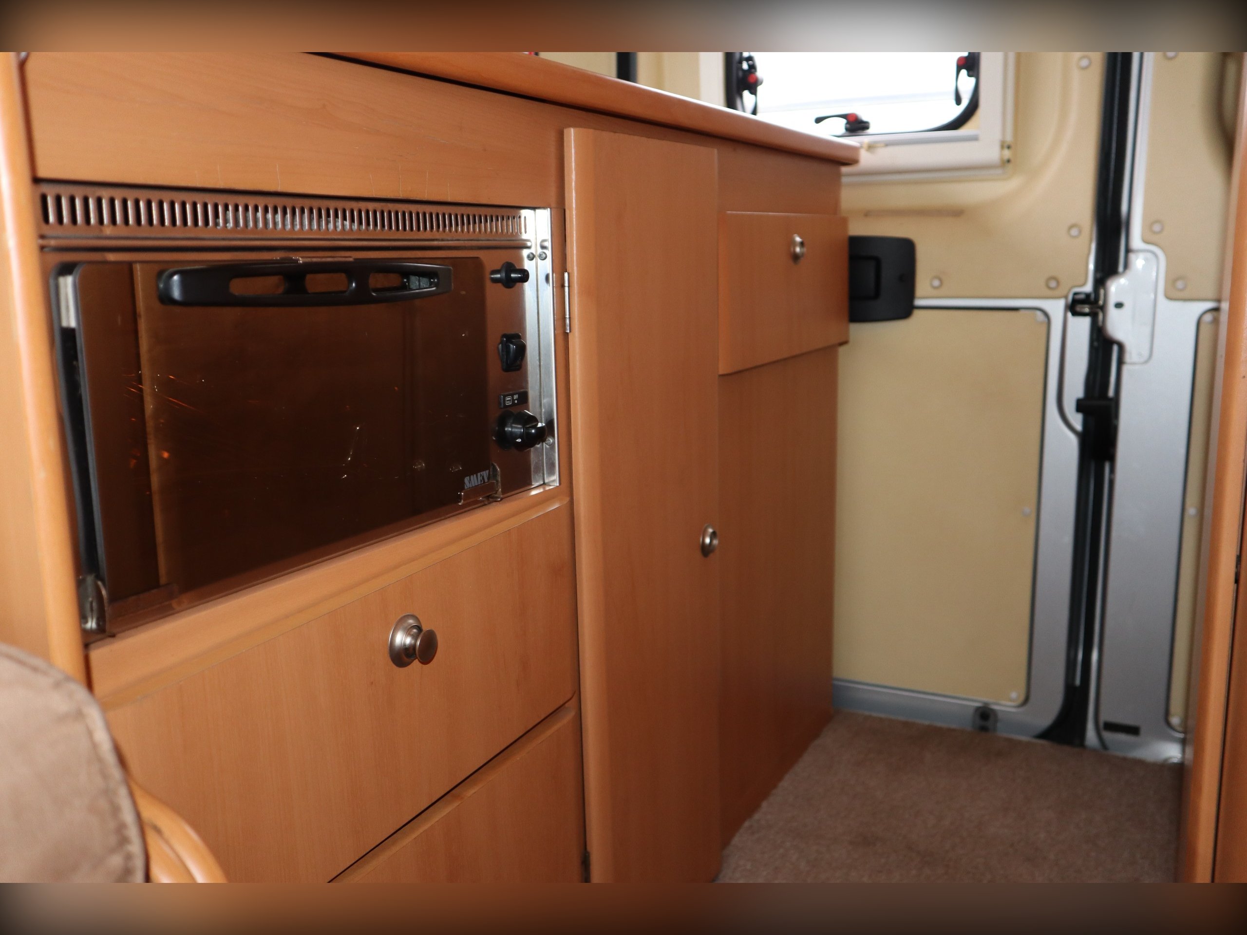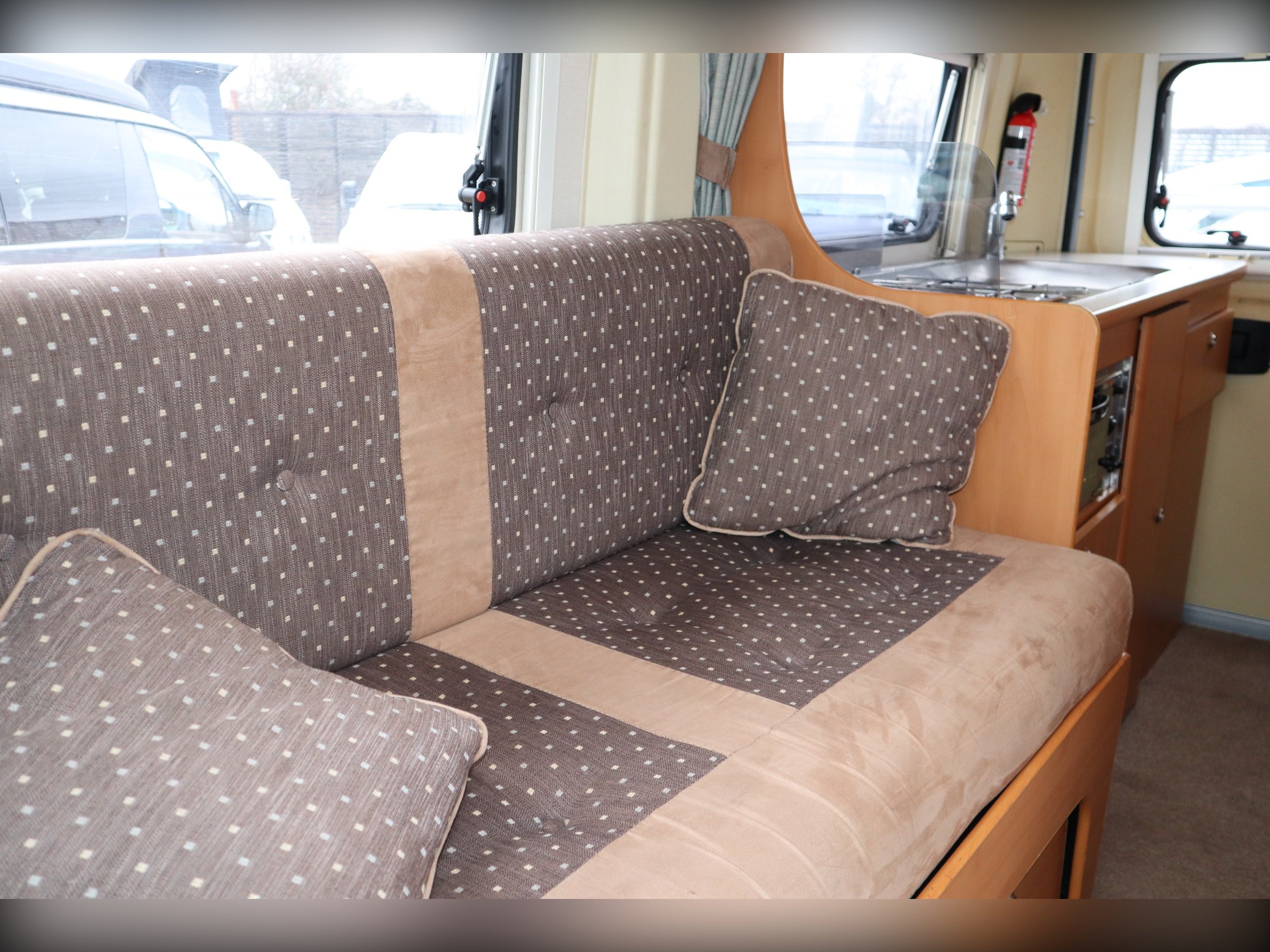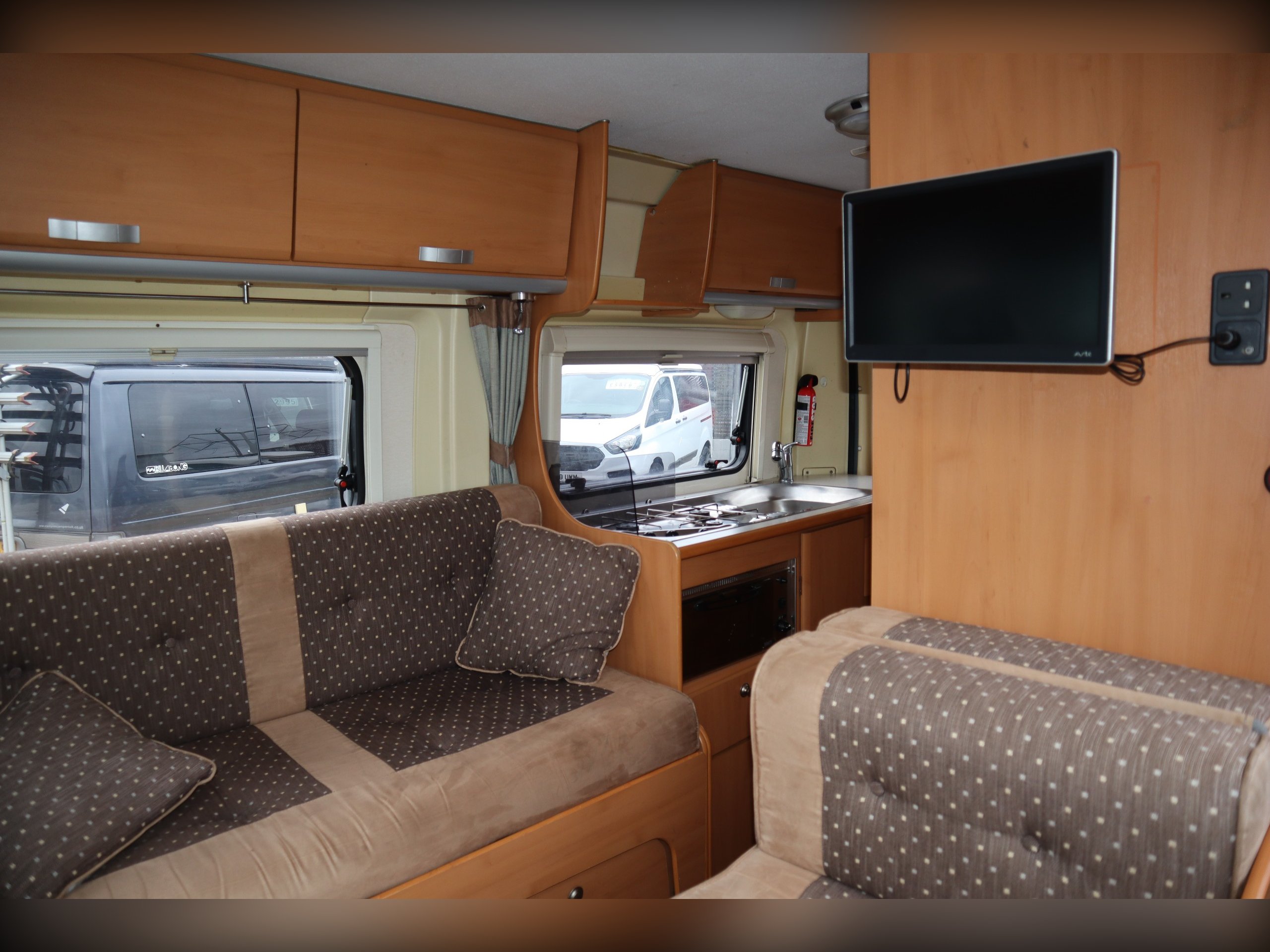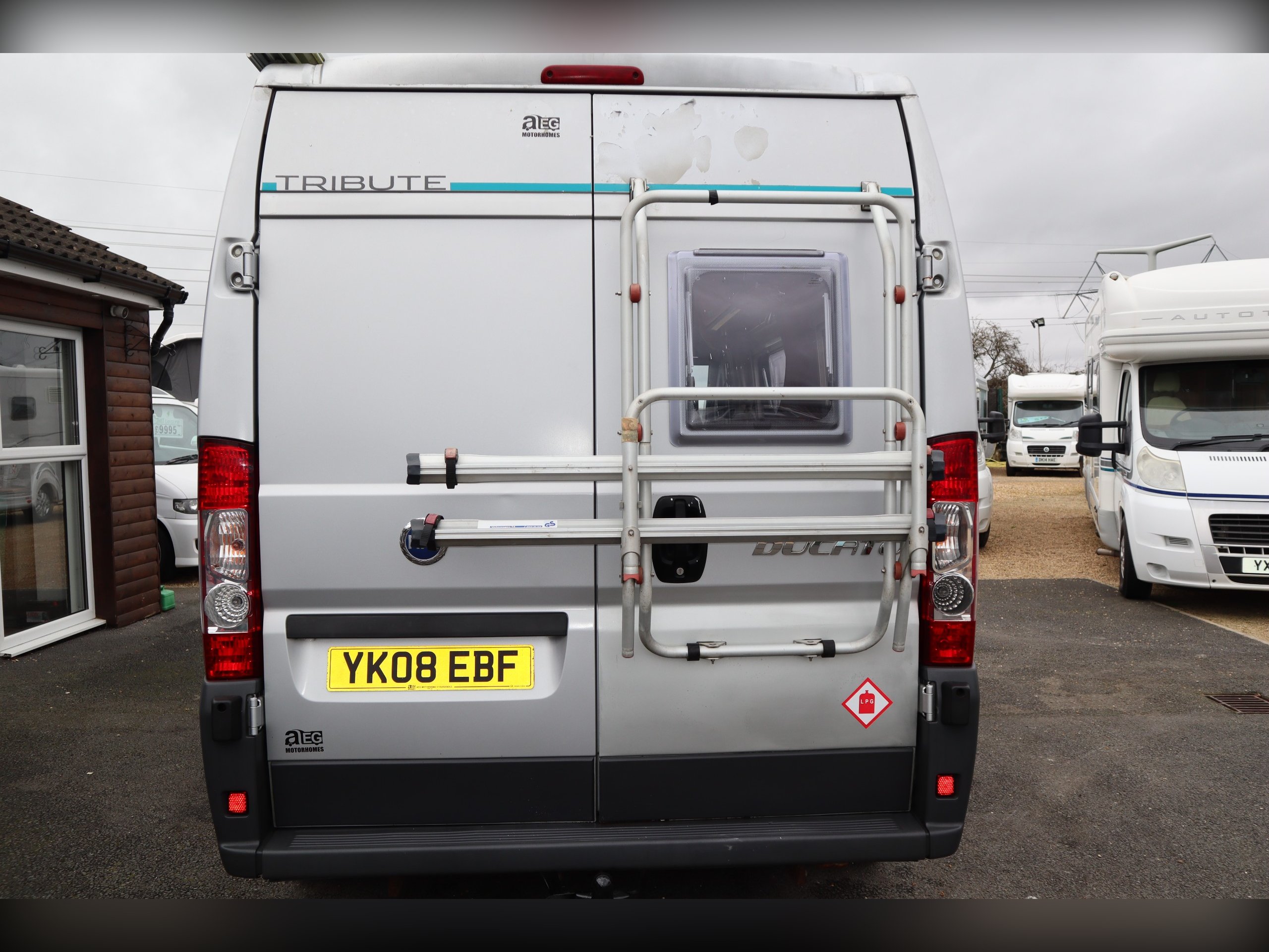 Trigano Tribute 550, 2 Berth, 3 Belts, Rear Side Kitchen, Bathroom Opposite, Front lounge area that can be made up to make 2 single or 1 double bed. Extras include Tow Bar, Awning, Bike rack, Alloy Wheels and Solar Panel.