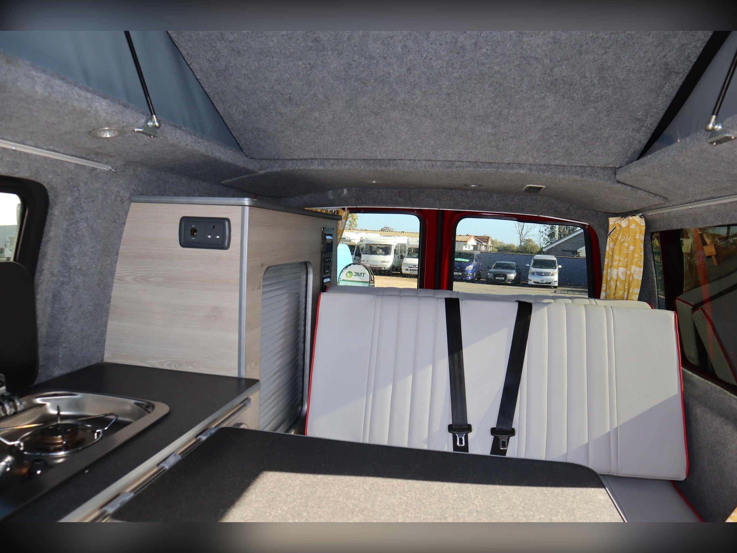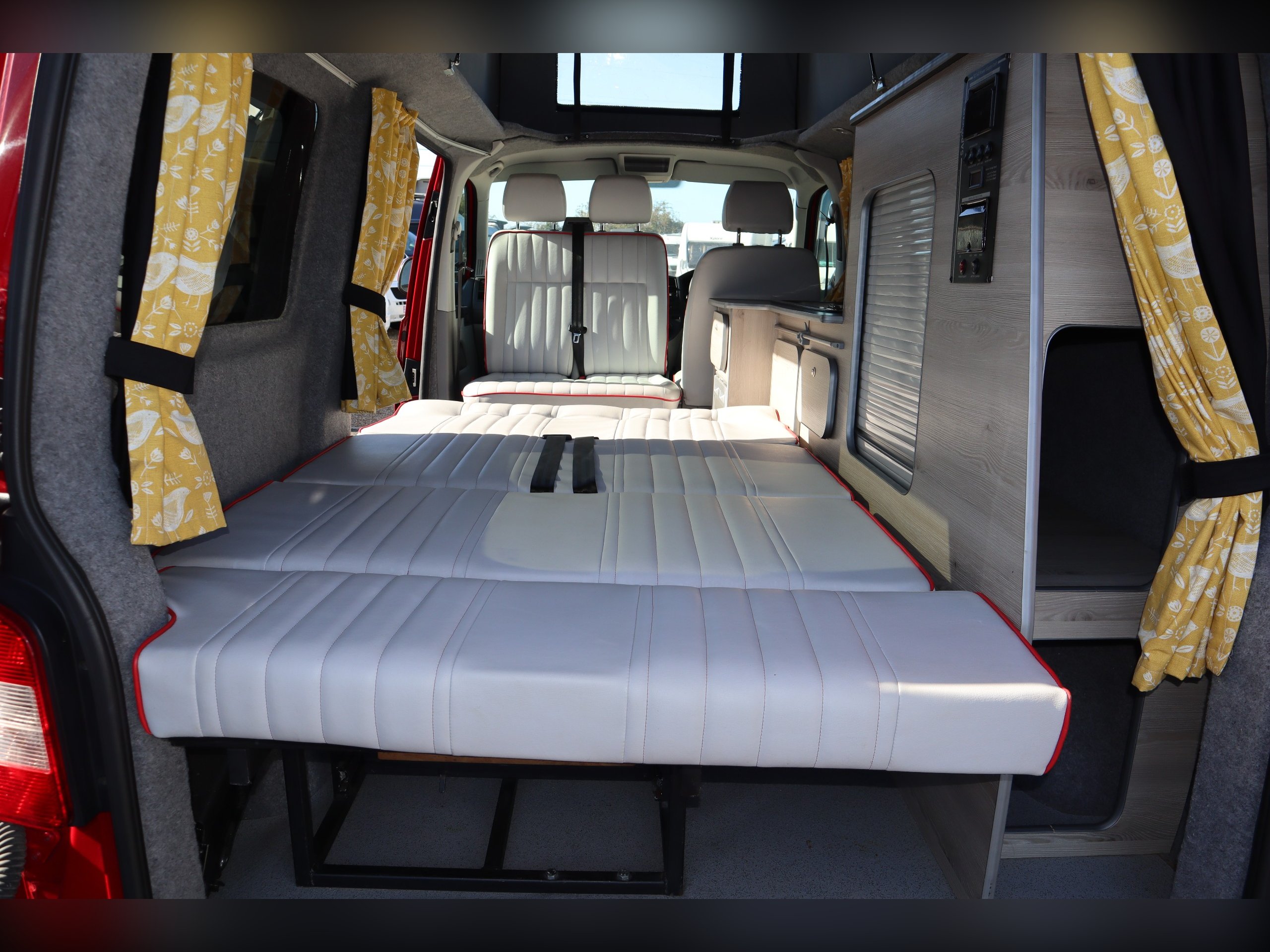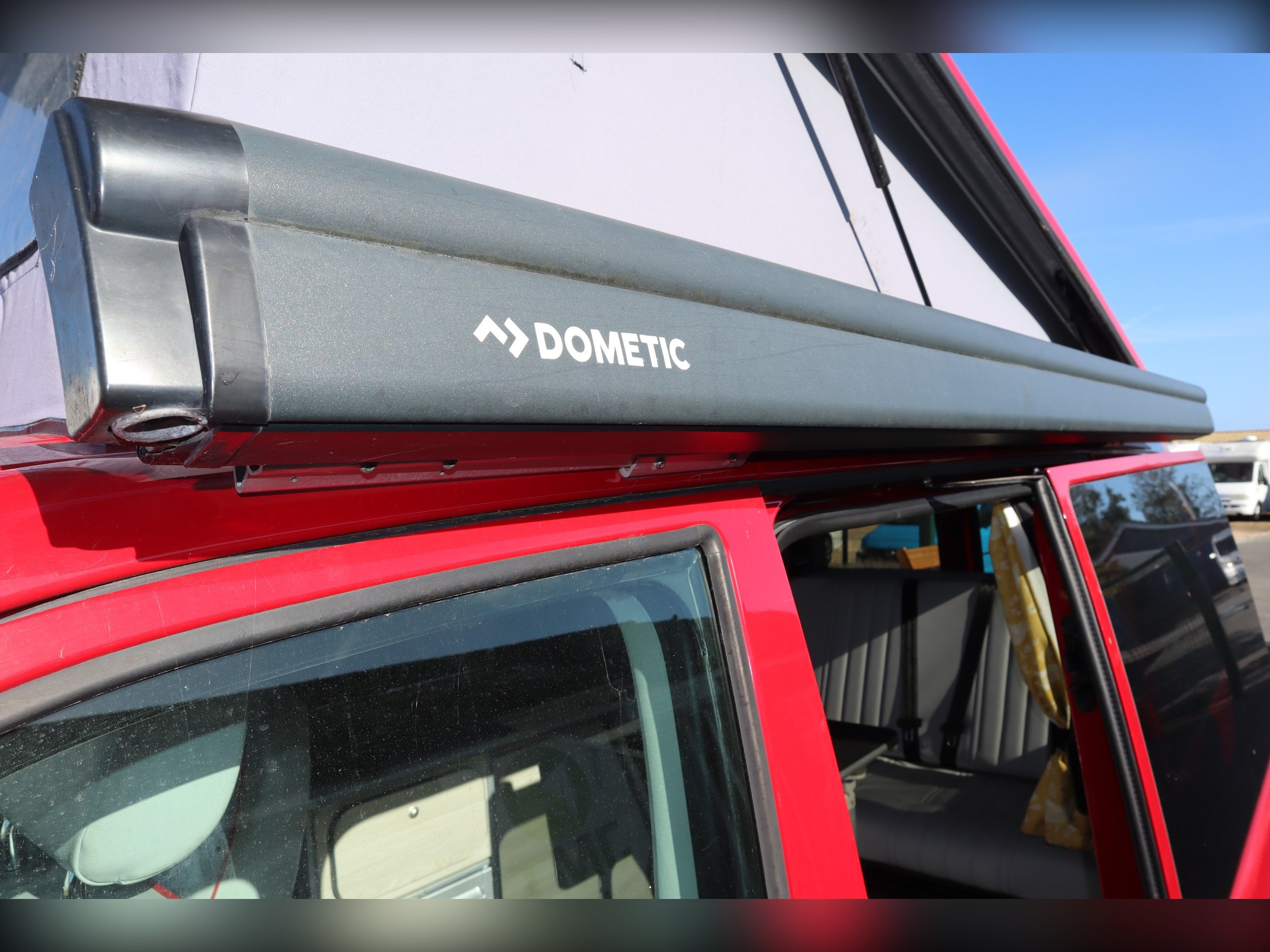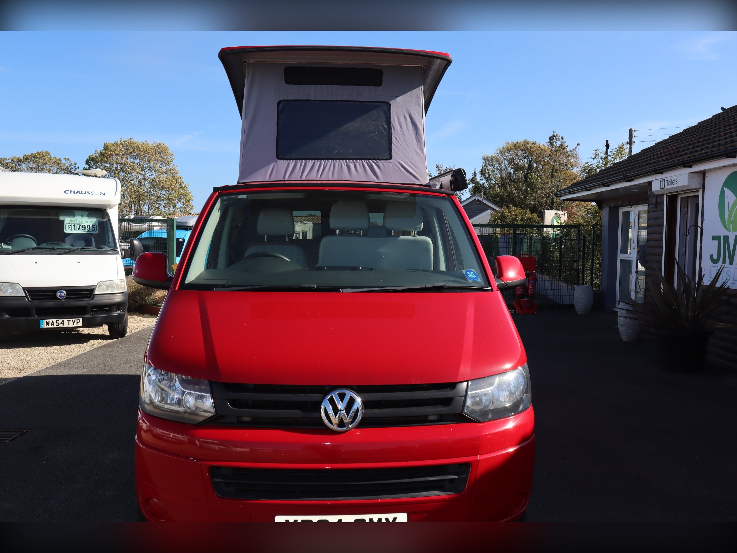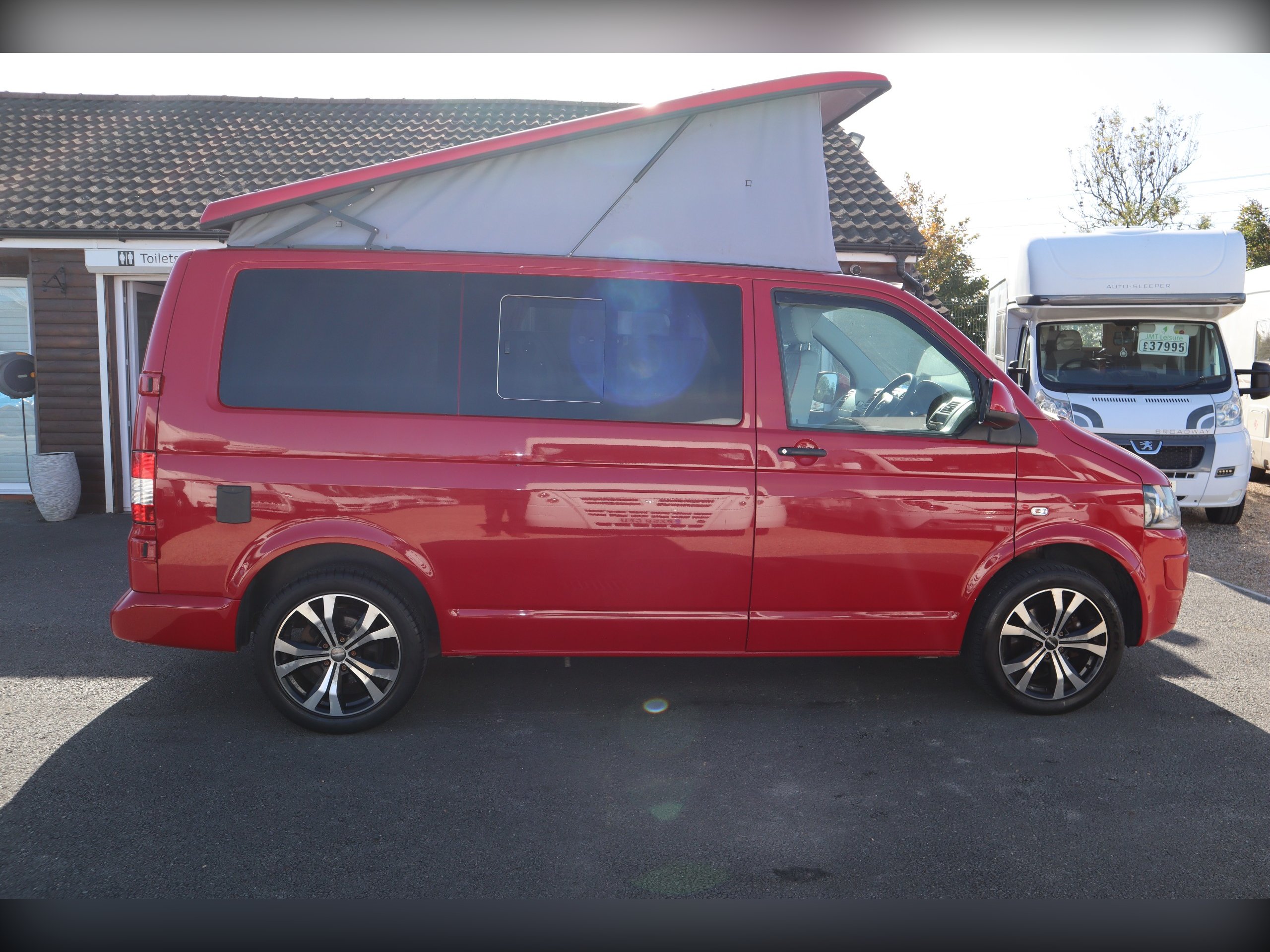 VW T32 Starline professional camper conversion. 4 Berth, 5 belts, pop top roof, rock n roll bed. Full service history including recent cambelt kit change. Matching front and rear upholstered seats. Cab air conditioning, awning, elevating roof, fridge, hob and sink. Only 2 previous keepers, stunning in red with privacy glass and alloy wheels.