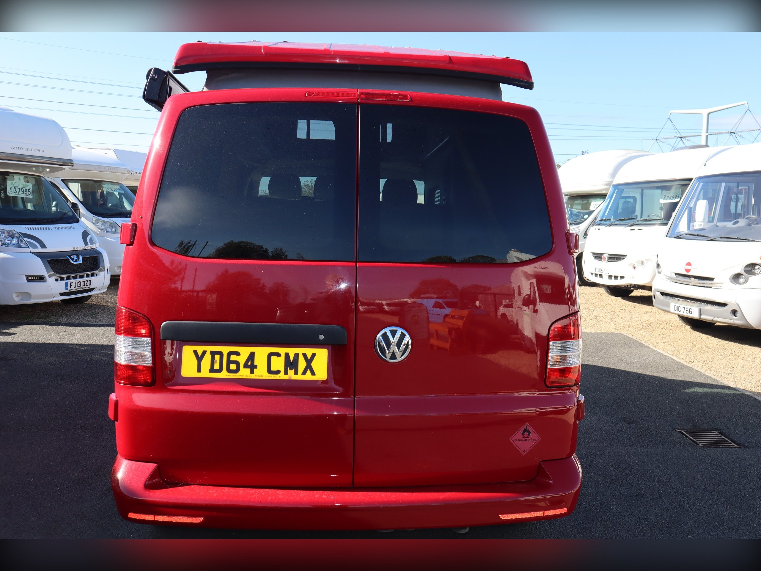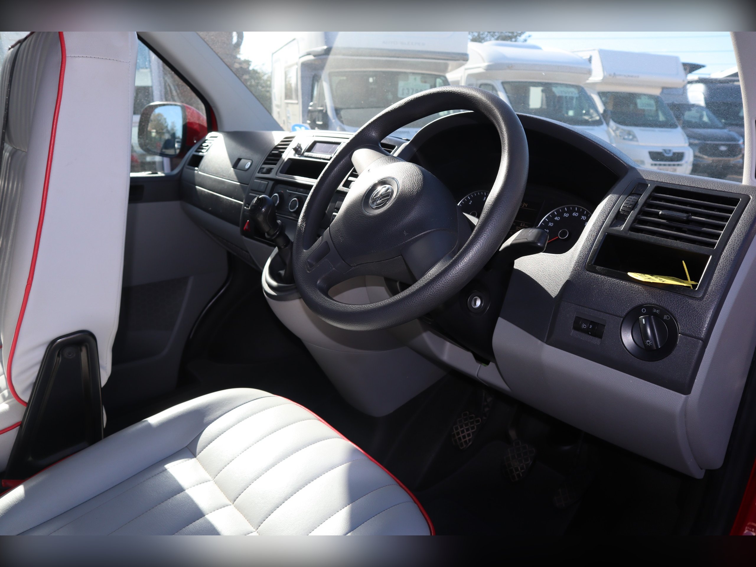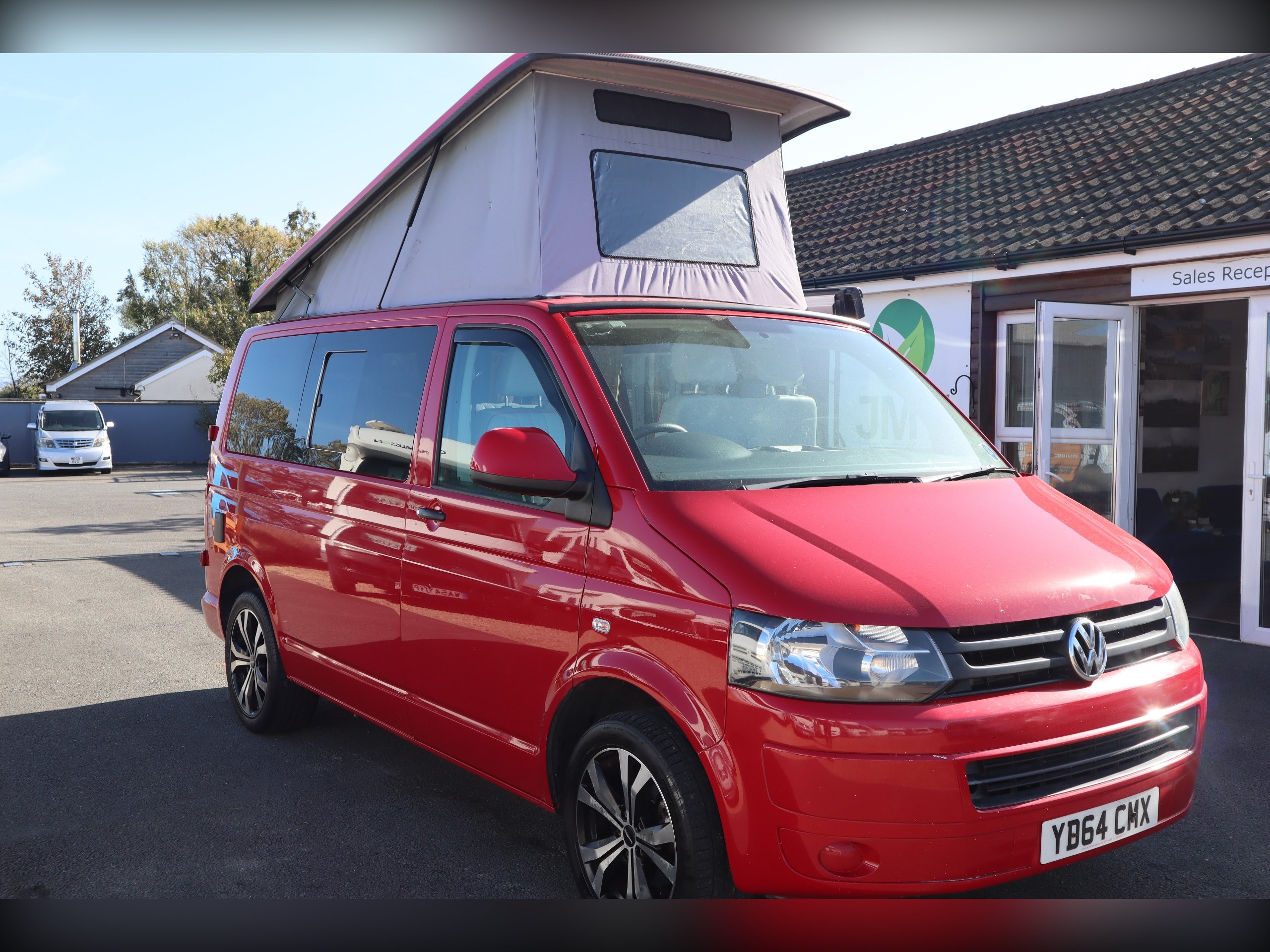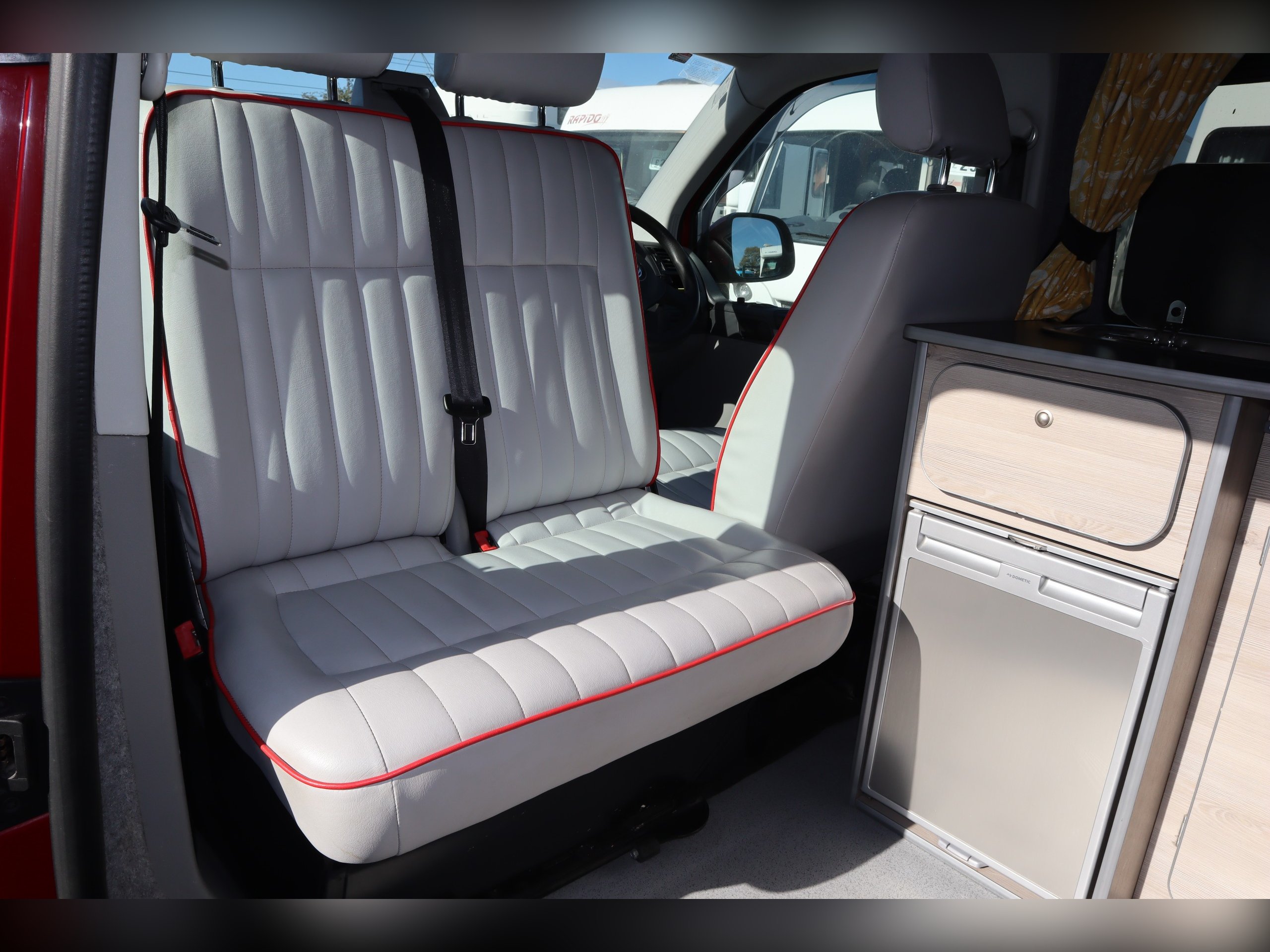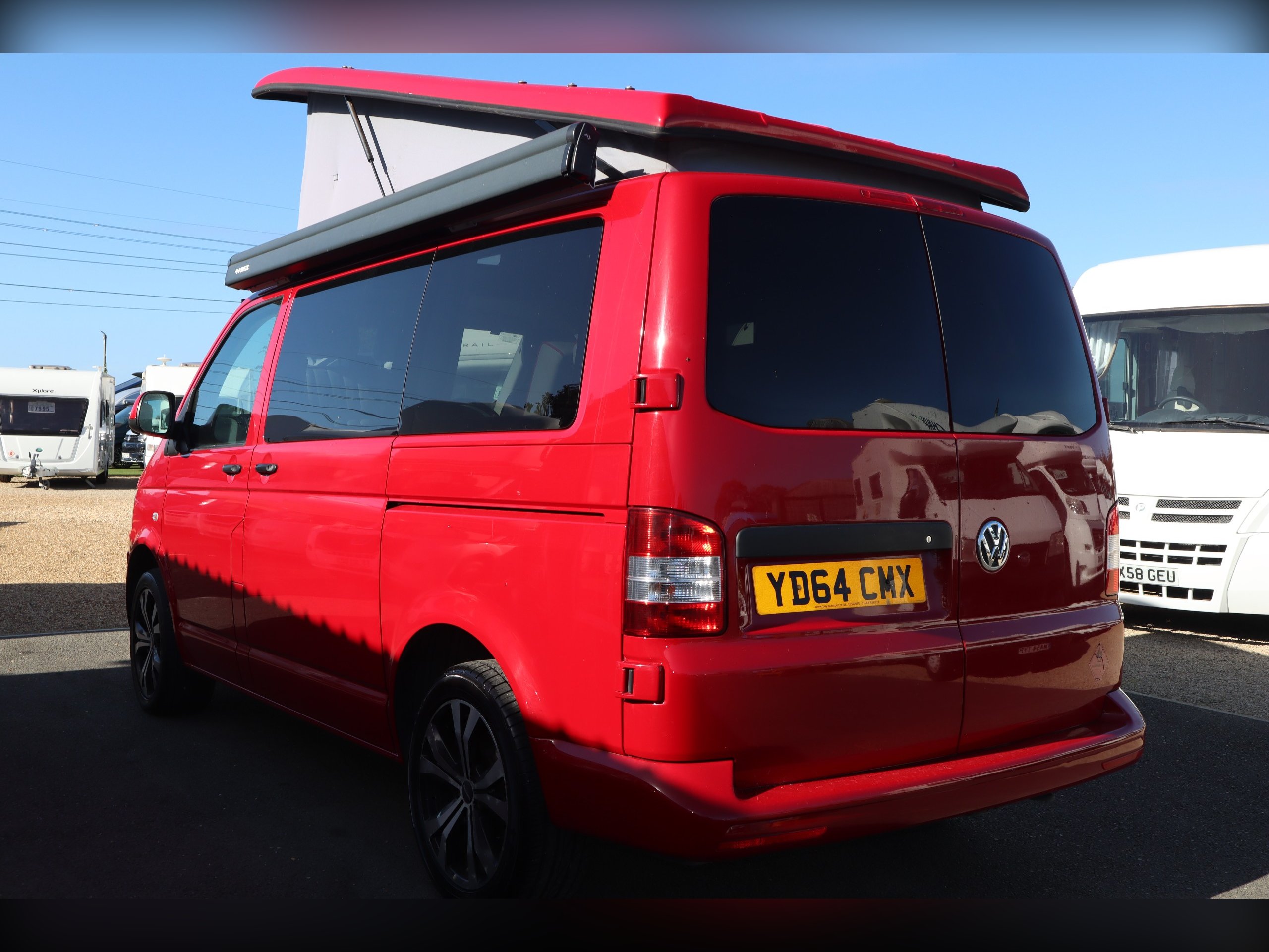 VW T32 Starline professional camper conversion. 4 Berth, 5 belts, pop top roof, rock n roll bed. Full service history including recent cambelt kit change. Matching front and rear upholstered seats. Cab air conditioning, awning, elevating roof, fridge, hob and sink. Only 2 previous keepers, stunning in red with privacy glass and alloy wheels.