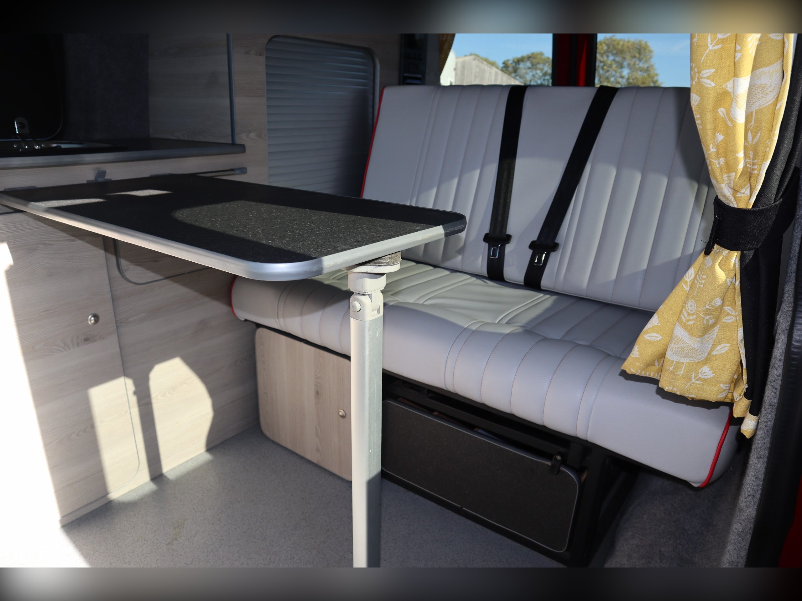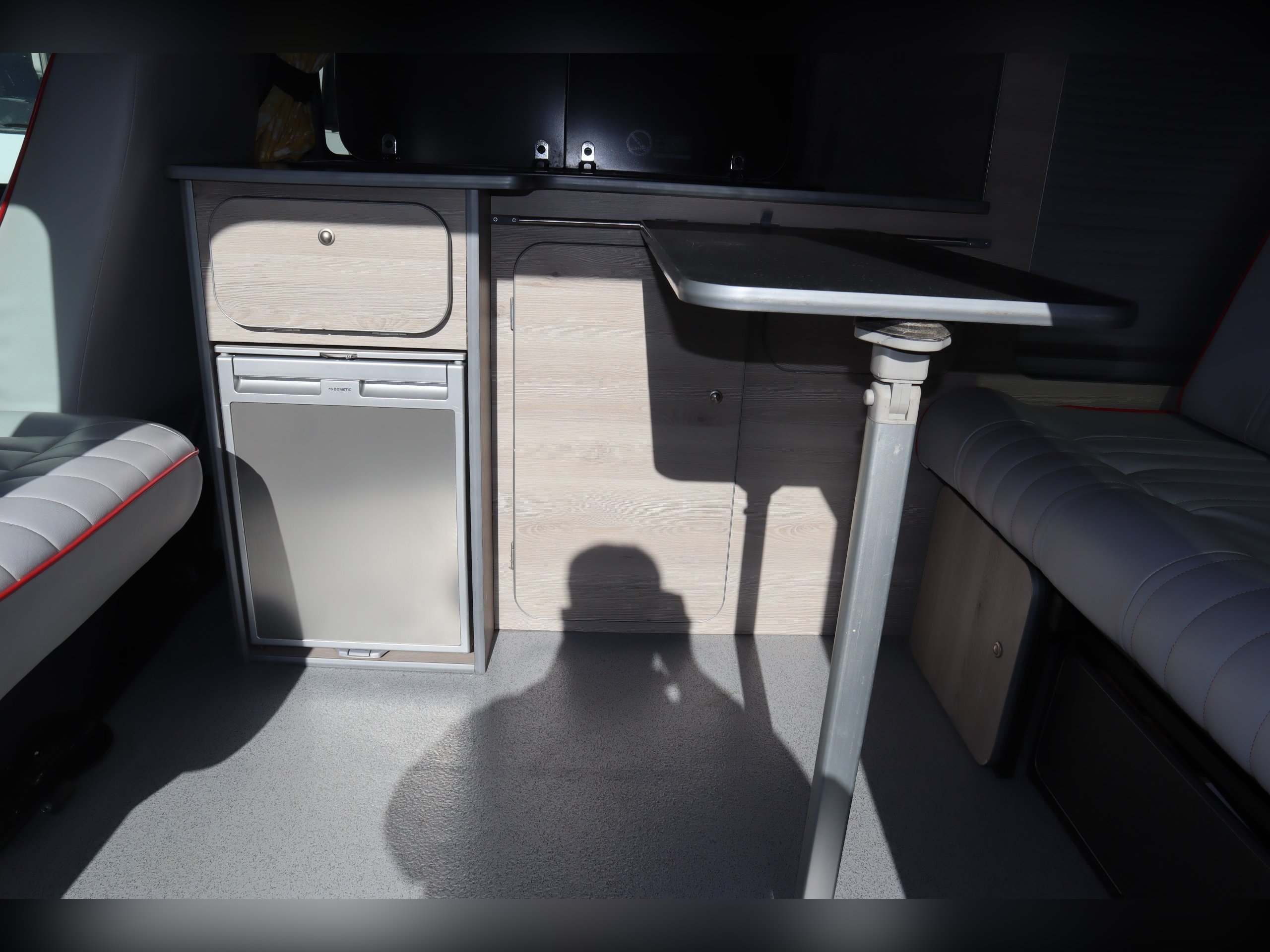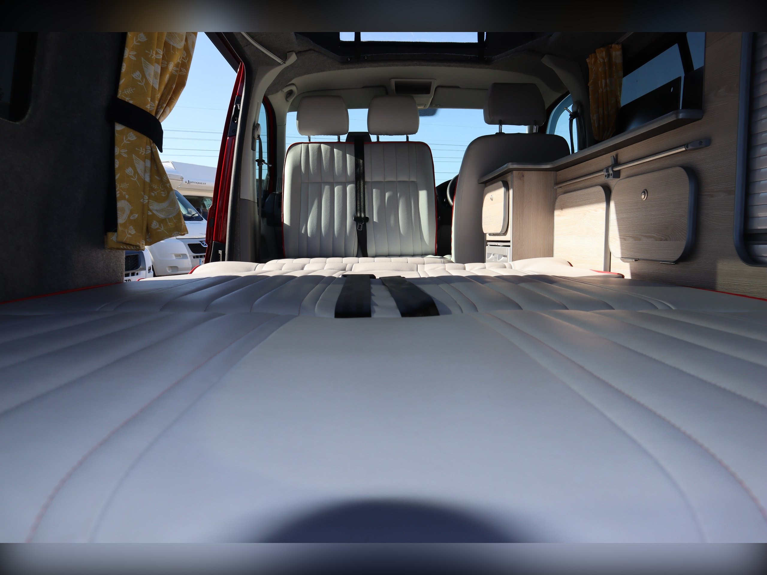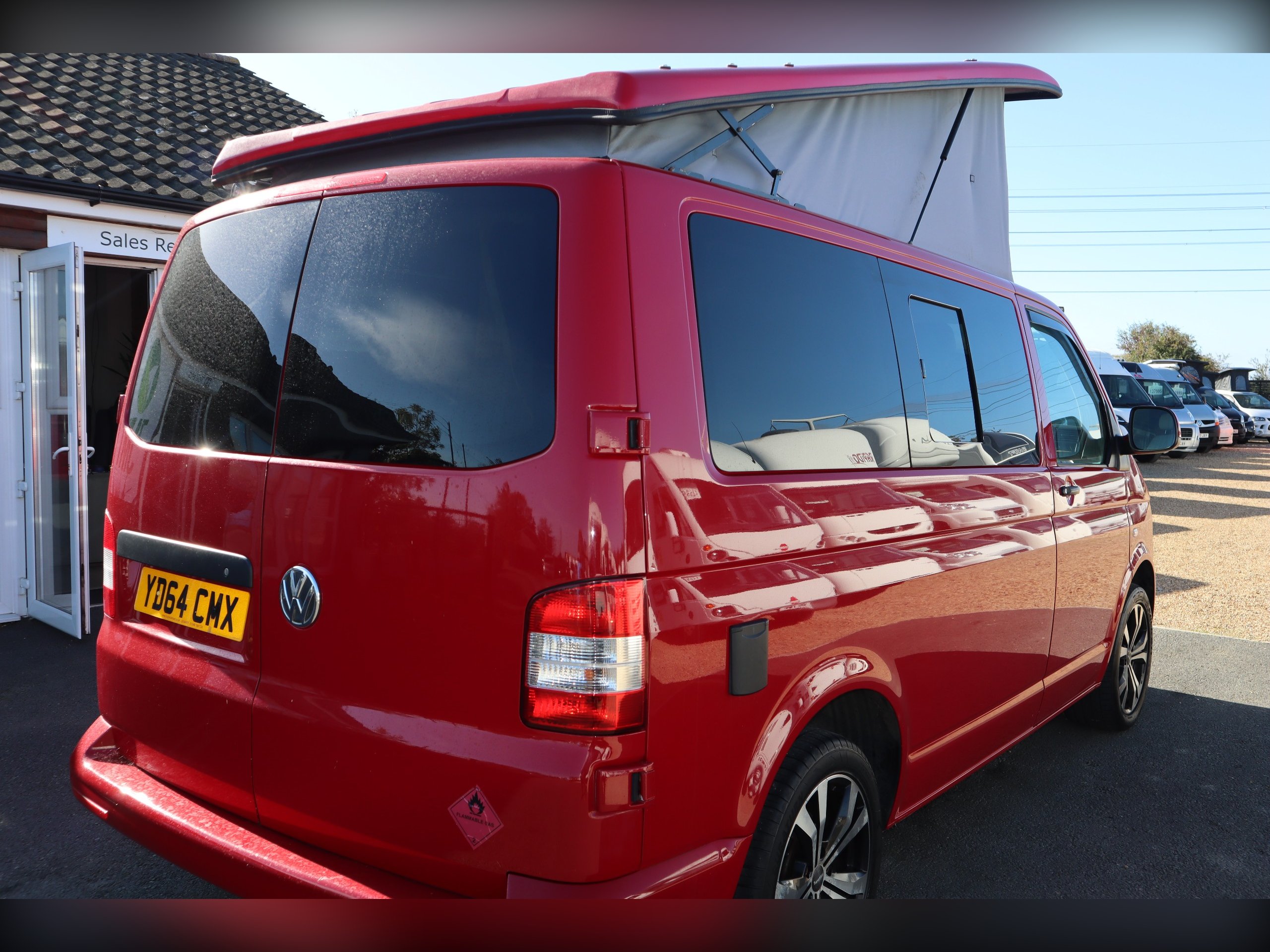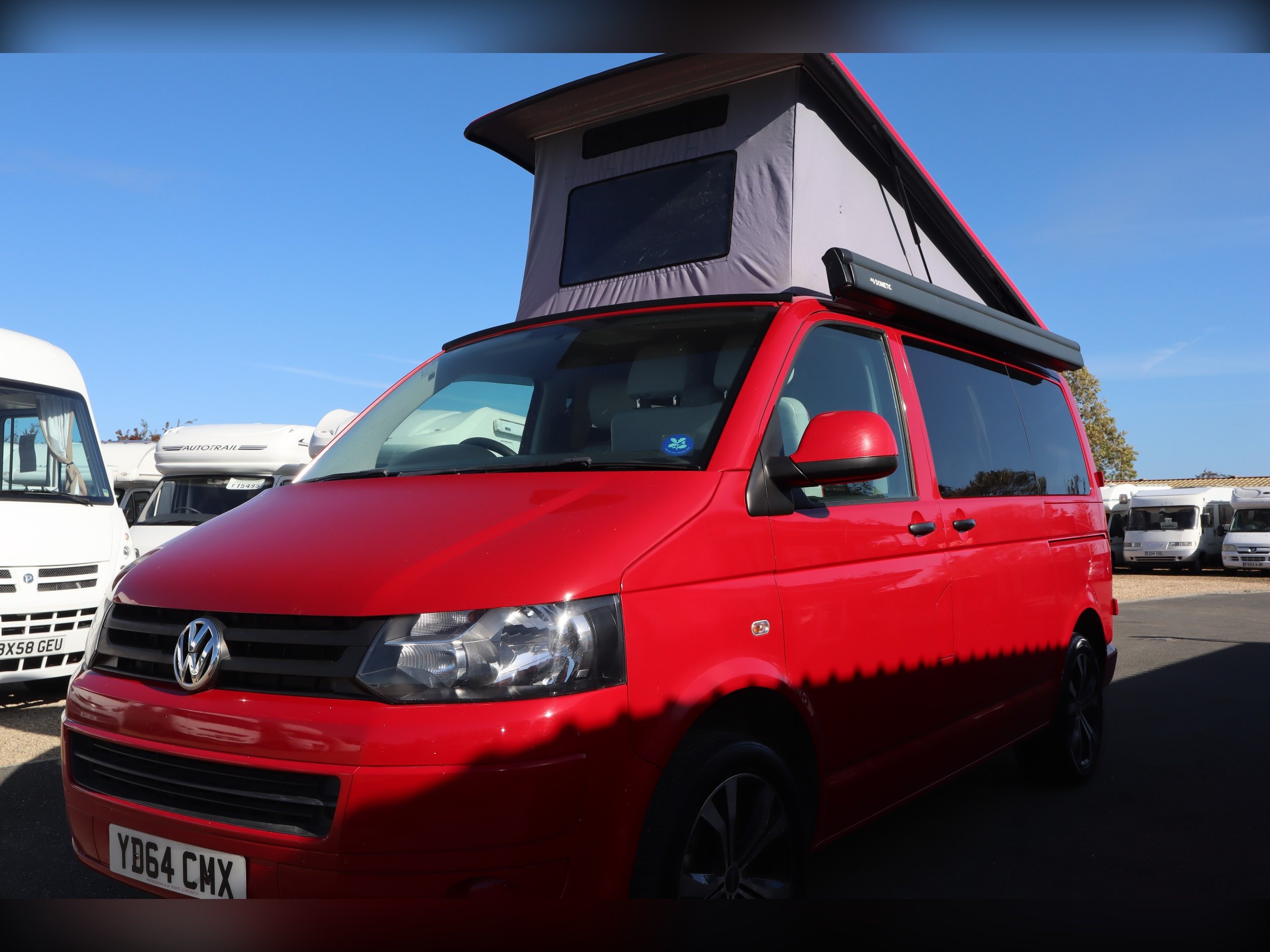 VW T32 Starline professional camper conversion. 4 Berth, 5 belts, pop top roof, rock n roll bed. Full service history including recent cambelt kit change. Matching front and rear upholstered seats. Cab air conditioning, awning, elevating roof, fridge, hob and sink. Only 2 previous keepers, stunning in red with privacy glass and alloy wheels.
